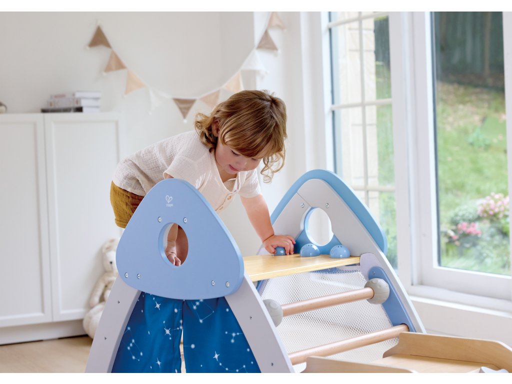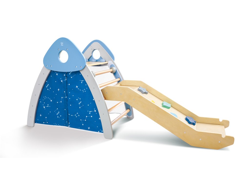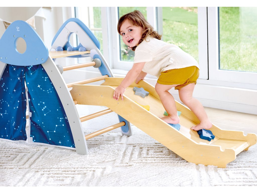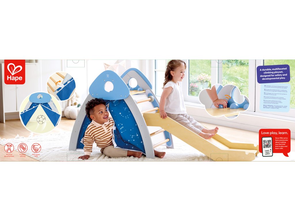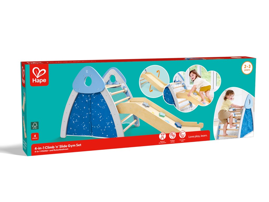 Objevte svět zábavy a pohybu s touto všestrannou prolézačkou Hape, která kombinuje čtyři různé herní prvky v jednom: skluzavku, lezeckou stěnu, stan a fotbalovou branku. Tento set je navržen tak, aby podporoval fyzický rozvoj, koordinaci a kreativitu dětí. S robustní konstrukcí a bezpečnými materiály je ideální pro vnitřní i venkovní použití. Vyrobený z vysoce kvalitního bukového dřeva, je bezpečný, pevný a navržený tak, aby vydržel roky radosti ze hry. Rozměry prolézačky cca: 79,2 x176,3 x 52,5 cm. Rozměry balení: 40,5 x 114 x 13 cm. Doporučený věk: 2-3 roky.