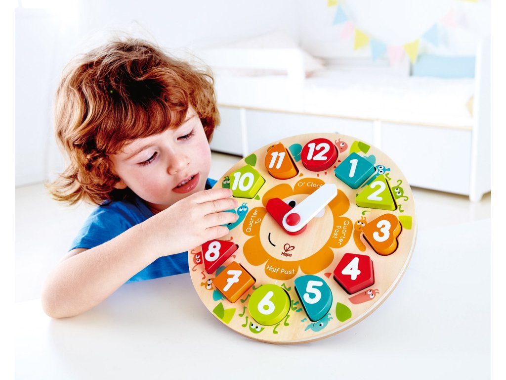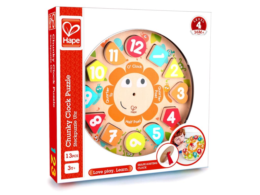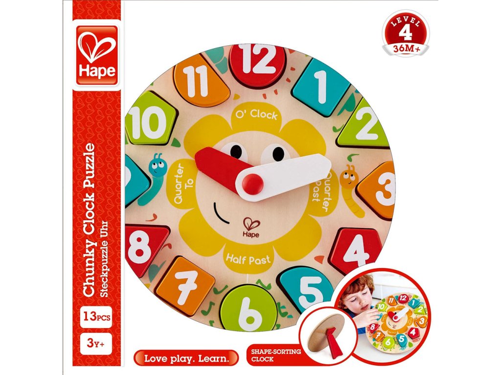 Dřevěné puzzle hodiny se stojánkem jsou nepostradatelným pomocníkem, díky kterému si děti procvičí hodiny, minuty, čísla a barvy. Hodiny mají vyndavací číslice. Každé číslo má jiný tvar. Díky této hračce bude pro děti jednodušší představit si, kdy mají jít spát, kdy je čas oběda nebo kdy si mohou hrát. Kvalitní dřevěné provedení. Hračka se skládá z 13 dílků. Věk: 3+. Rozměr: 24,5 x 24,5 x 3,5 cm.