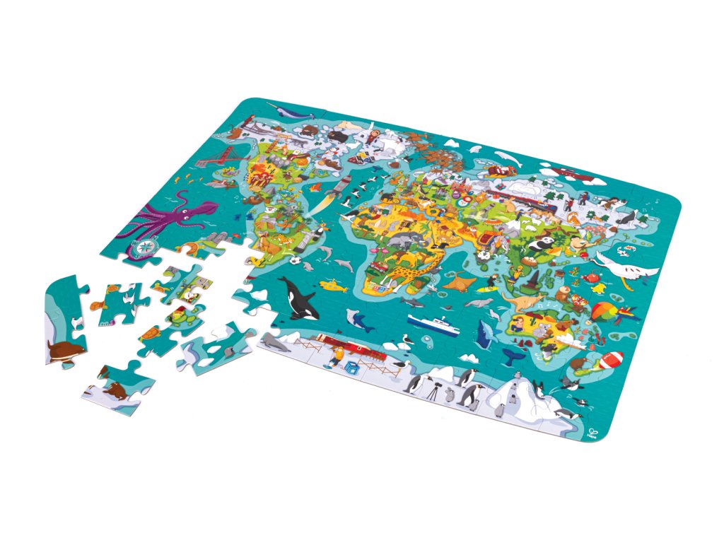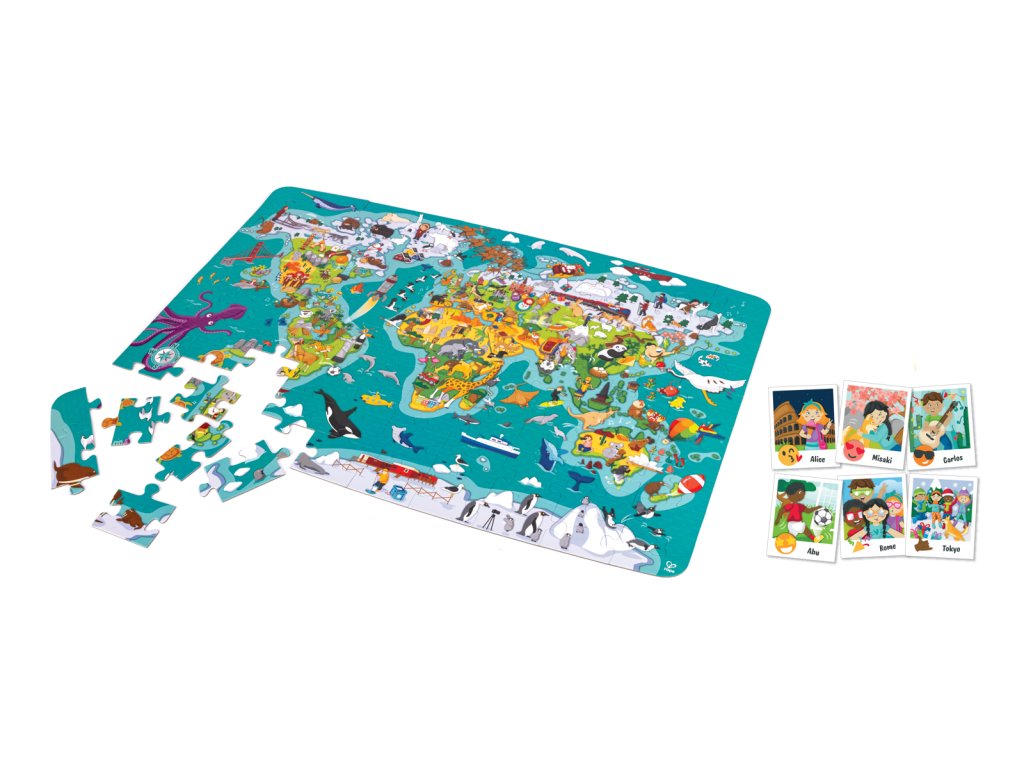 Udělejte si fantastický výlet kolem světa a objevte naši úžasnou planetu Zemi. Nejprve poskládejte 100dílné puzzle, které představuje jednotlivé země světa, jejich divokou kulturu, památky, faunu a flóru. Pak si vy a vaši přátelé vyberte kartu jedné z postav, zjistěte více o jejích zájmech a najděte na mapě místo, kde je najít! Skvělé pro výuku! Skvělé také pro rozvoj soustředění, uvažování a rozvoj pozorovacích schopností. Vyrobeno z kvalitního a odolného materiálu. Hračka se skládá z 105 dílků puzzle a 6 hracích kartiček. Vhodné pro děti od 5 let. Rozmě složeného puzzle: 87 x 57,5 cm. Rozměry balení: 36x36x5cm. Video: https://www.youtube.com/watch?v=sDh87B2V4Xo