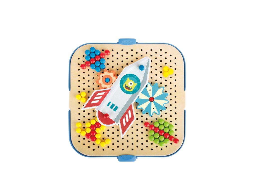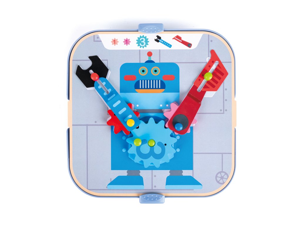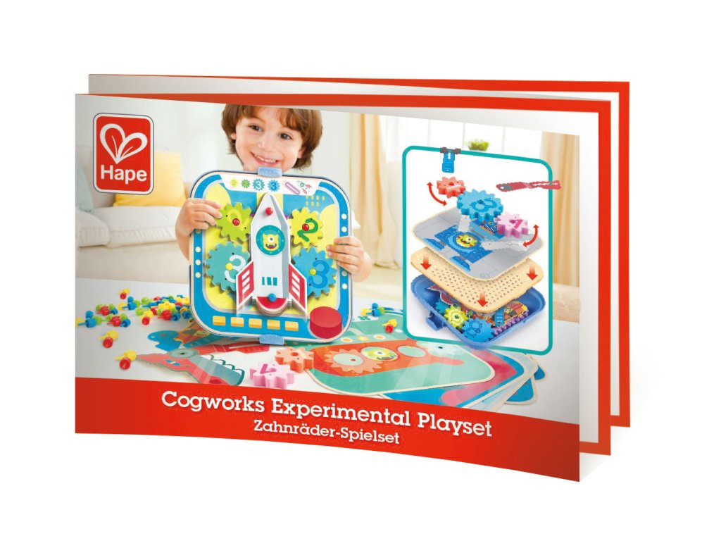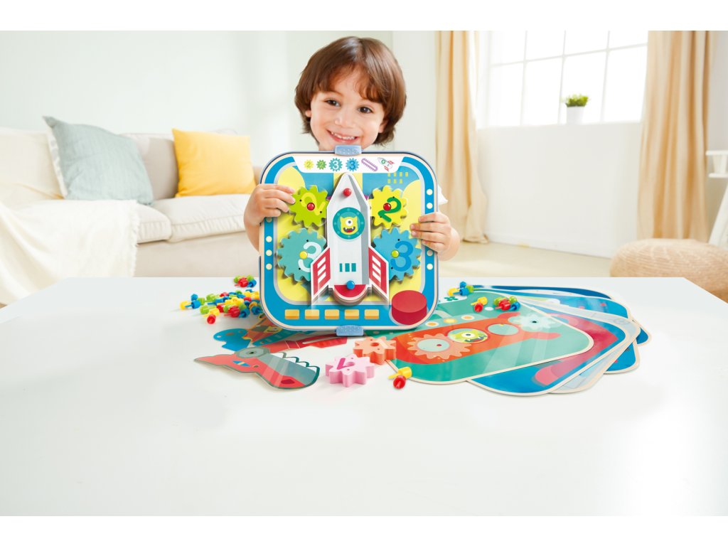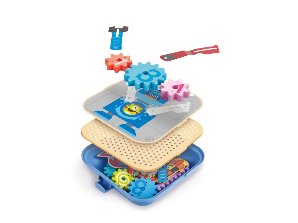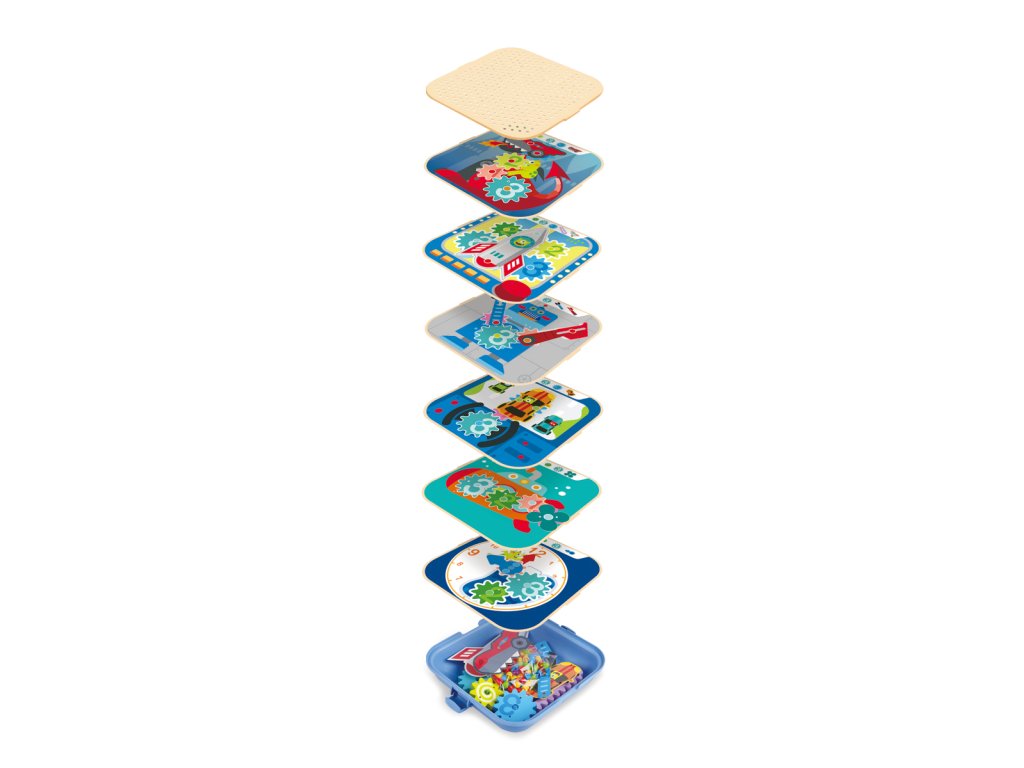 Experimentální set s ozubenými koly, který pomáhá dětem pochopit základy toho, jak ozubená kola fungují. Děti se seznámí se sílou, rychlostí a technickými souvislosti. Obsahuje šest ozubených kol, šest kartonových pozadí, sedm kartonových tvarů a postav, 100 barevných špendlíků a plastovou krabičku s dřevěným víkem. Motivy pozadí jsou například drak chrlící oheň, hodiny, robot, ponorka, raketa a krajina s volantem. Pouzdro hry je uzamykatelné. Hra podporuje kreativitu. Rozměr balení: 27,5x26,1x6,6 cm. Věk 3+