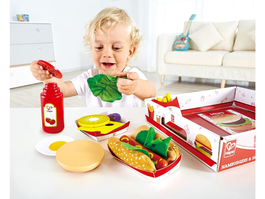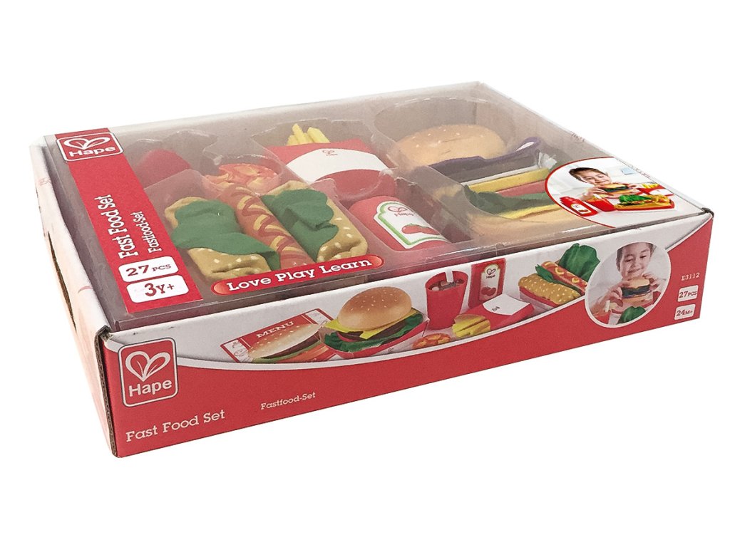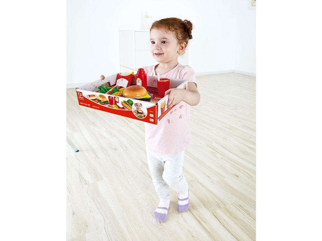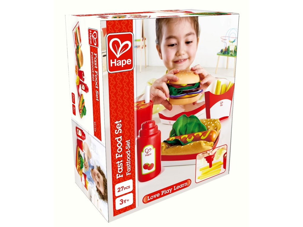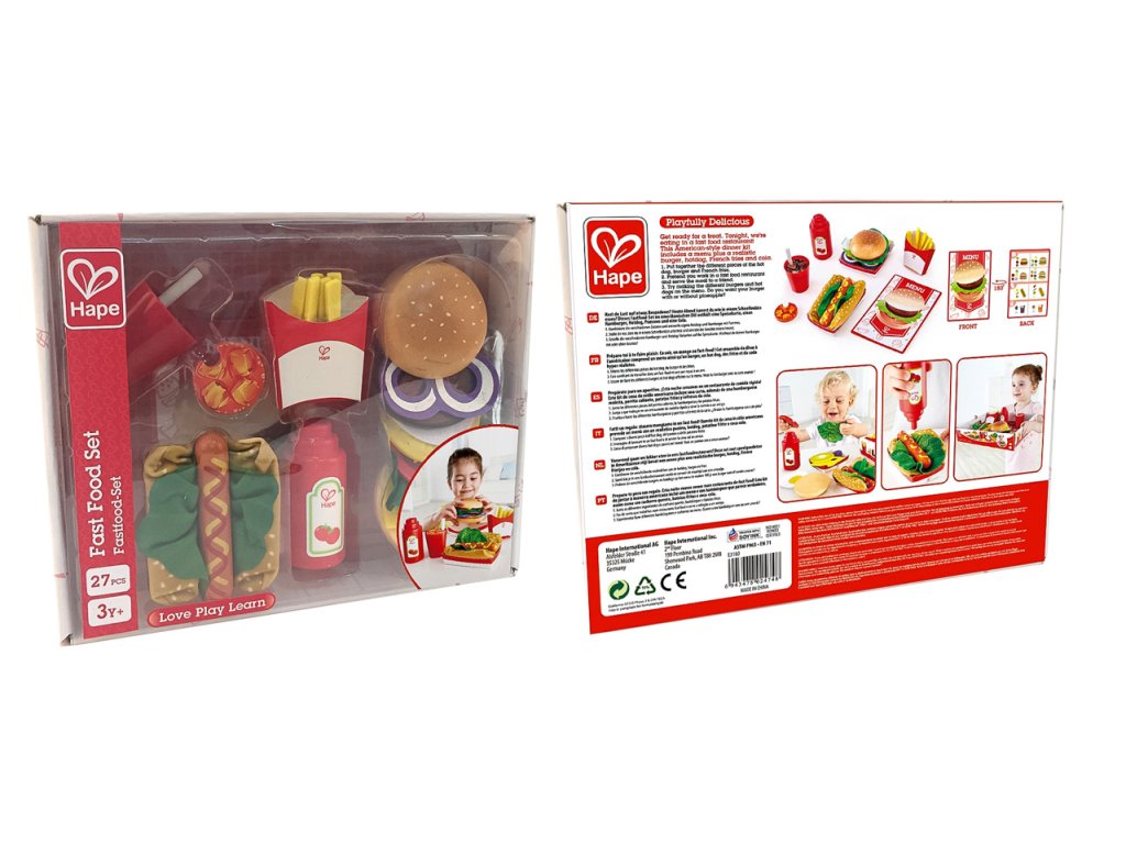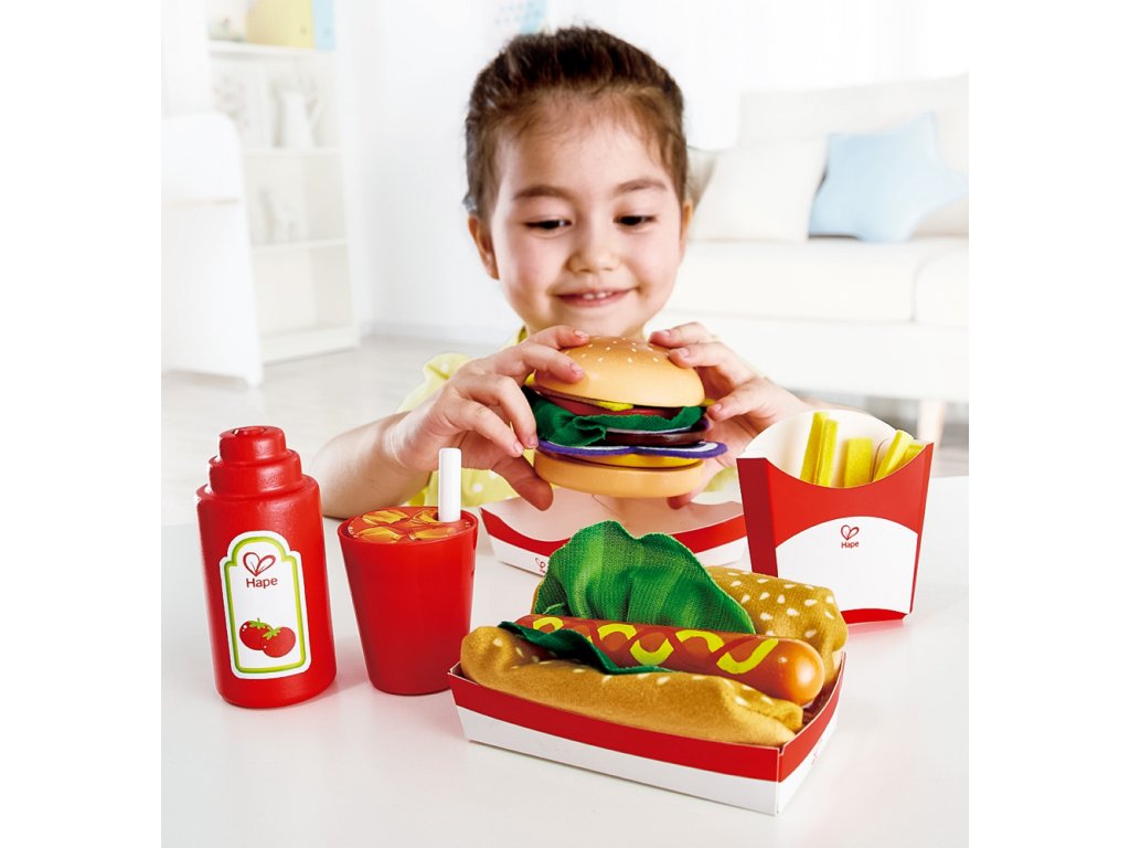 Co bude dnes k obědu? Na co máte zrovna chuť? Příprava oběda pomocí Fast Food Setu je snadná a rychlá. V setu najdete nejen menu, hranolky, hamburger, hot dog, ale i nápoj a kečup. Set obsahuje 27 dílků. Hračka rozvíjí jemnou motoriku, koordinaci rukou a očí. Vyrobeno z kvalitního a odolného materiálu. Věk: 3+. Rozměr balení: 20 x 24 x 10 cm.