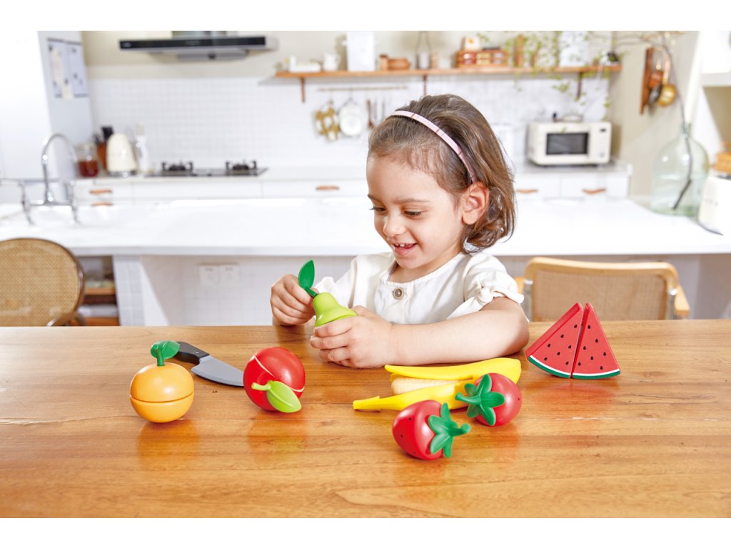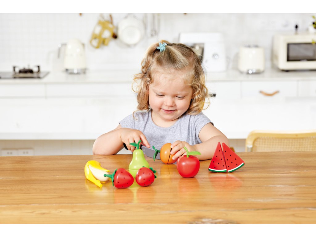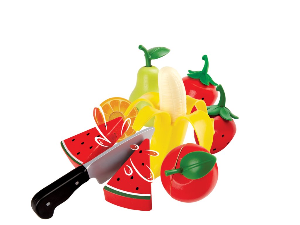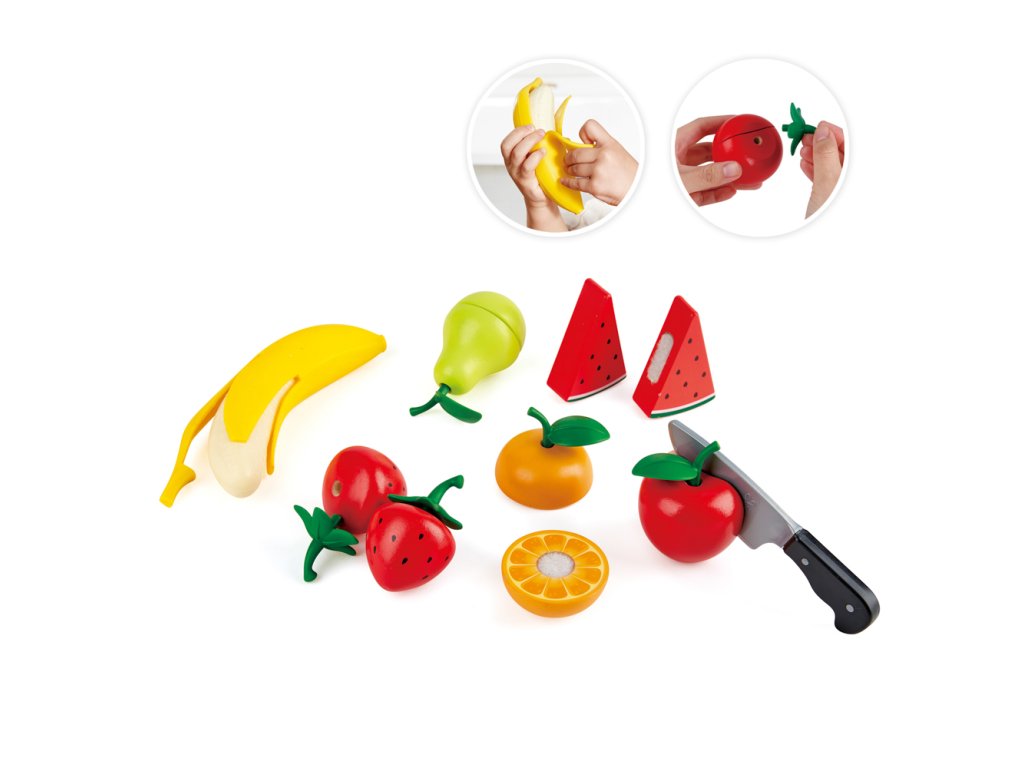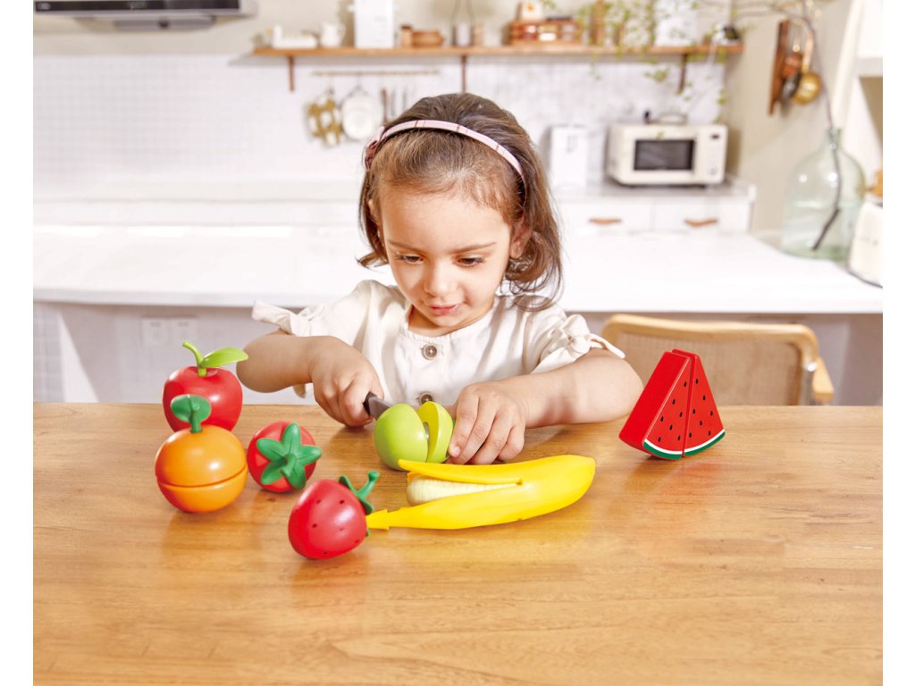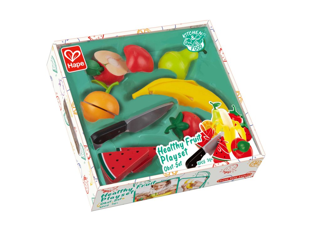 Tato nádherná hrací sada HAPE pomáhá dětem seznámit se s ovocem a inspiruje je k rozvoji zdravých stravovacích návyků. Povzbuďte v dětech zvědavost a nechte je rozvíjet jejich představivost, jazykové a sociální dovednosti hraním s touto nejkvalitnější realistickou sadou ovoce! Zkombinujte tuto sadu s dalšími potravinovými sadami a vytvořte zábavné hody. Hračka pomáhá s rozvojem jemné motoriky a koordinace ruka-oko. Pásky na suchý zip na plodech vydávají při krájení křupavý zvuk a banánová slupka je vyrobena z měkkého silikonu, takže ji mohou malé ručičky snadno loupat! Sada zdravého ovoce obsahuje dvě jahody, hrušku, pomeranč, jablko, dva kousky melounu, banán a realistický dětský hrací nůž. Rozměr balení: 25,5 x 6 x 24,5 cm. Věk: 3+