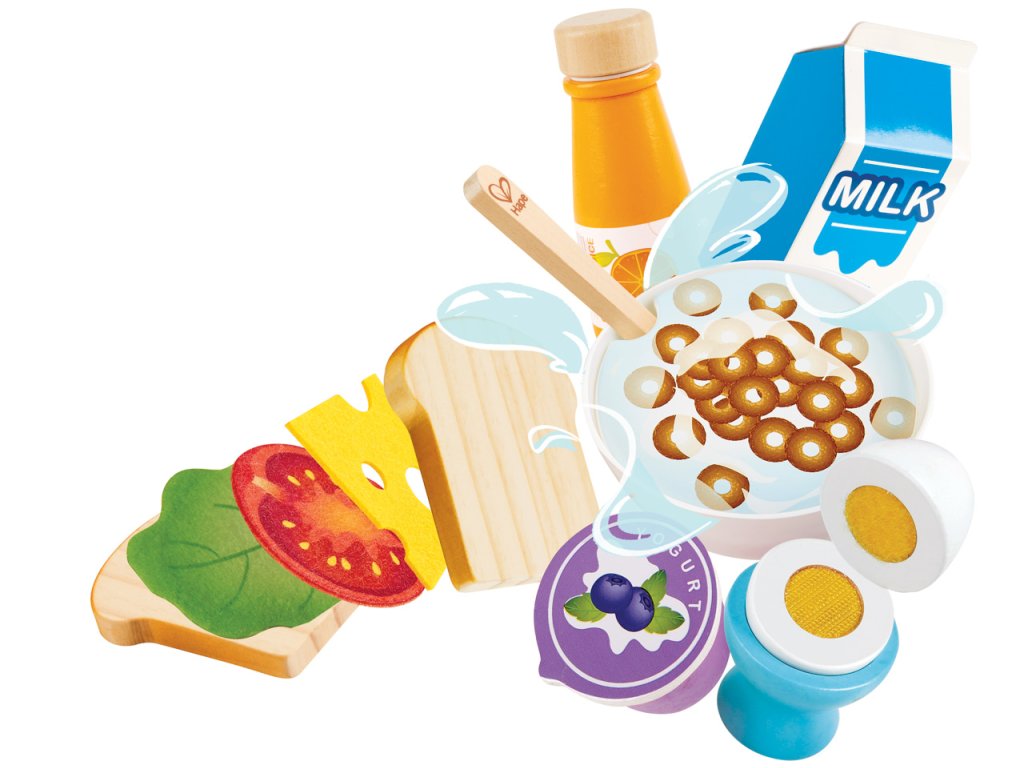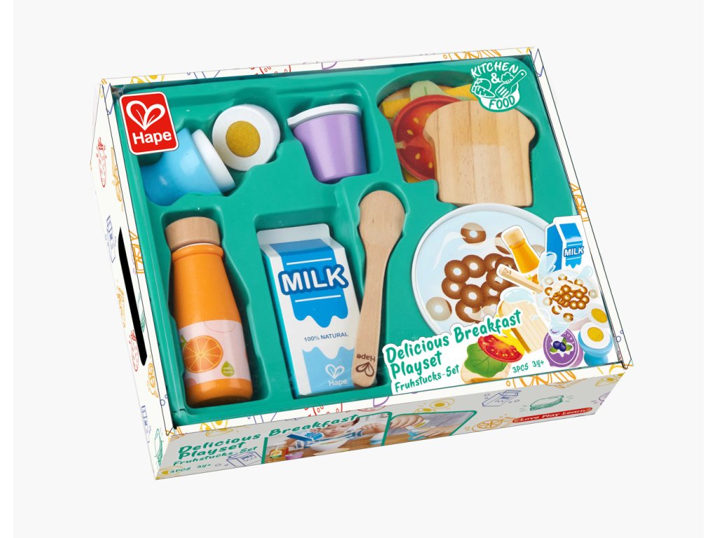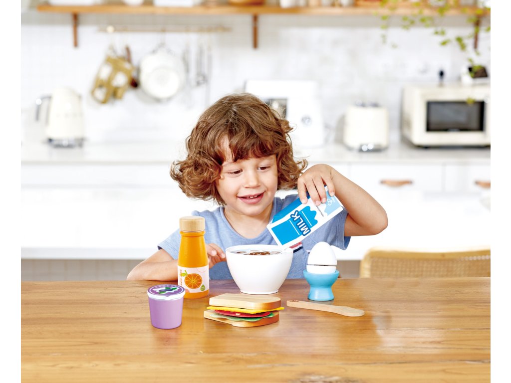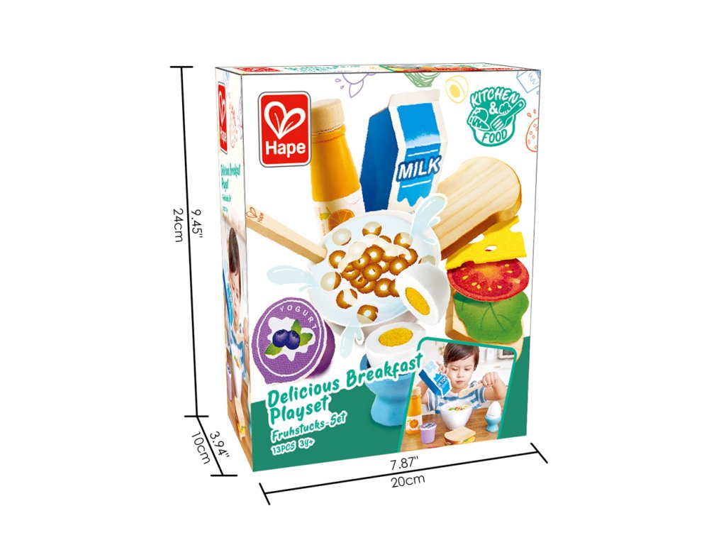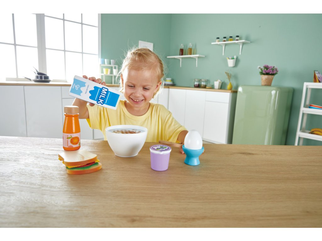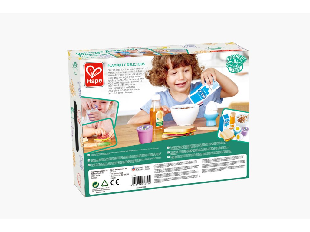 Tato nádherná hrací sada HAPE pomáhá dětem seznámit se se snídaní a inspiruje je k rozvoji zdravých stravovacích návyků. Povzbuďte v dětech zvědavost a nechte je rozvíjet jejich představivost, jazykové a sociální dovednosti hraním s touto nejkvalitnější realistickou sadou! Zkombinujte tuto sadu s dalšími potravinovými sadami a vytvořte zábavné hody. Hračka pomáhá s rozvojem jemné motoriky a koordinace ruka-oko. Pásky se suchým zipem na jogurtu vydávají při zvedání křupavý zvuk a víčko lahve s džusem zacvakne, když jím otočíte. Sada zdravé snídaně zahrnuje jogurt, mléko, pomerančový džus, vejce s kalíškem na vejce, sendvič a má realistickou misku ovesných vloček s dřevěnou lžící. Rozměr balení: 30,5 x 7,5 x 24,5 cm. Věk: 3+