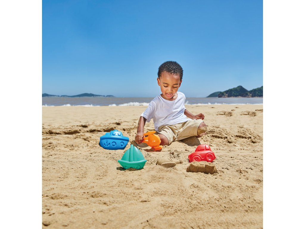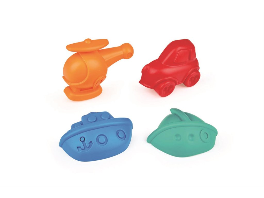 Sada bábovek ve tvaru dopravních prostředků - naučte se rozpoznat helikoptéru, loď nebo auto. Vyrobeno z kvalitního a odolného materiálu v oranžové, modré, zelené a červené barvě. Věk: 18m+. Rozměr: 14 x 13 x 33 cm.