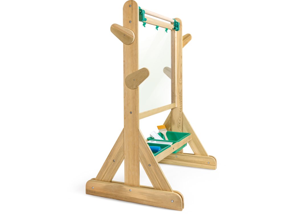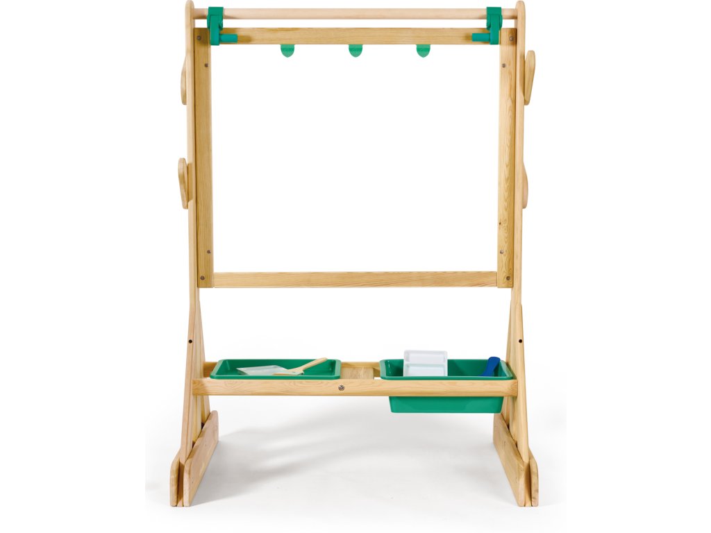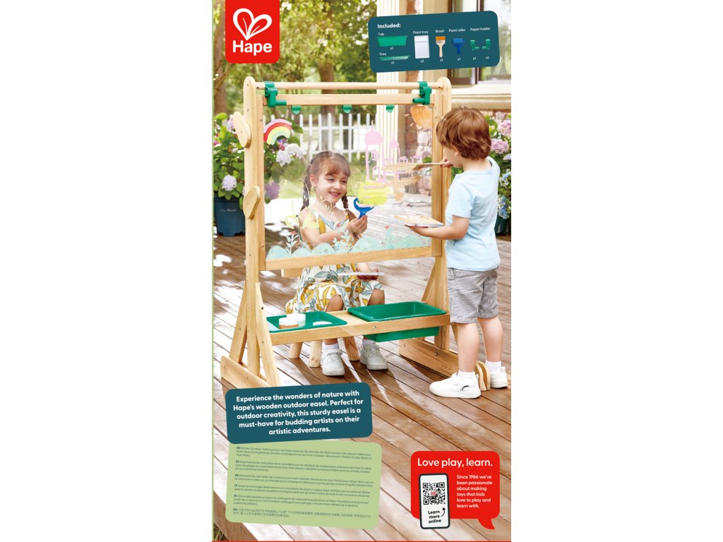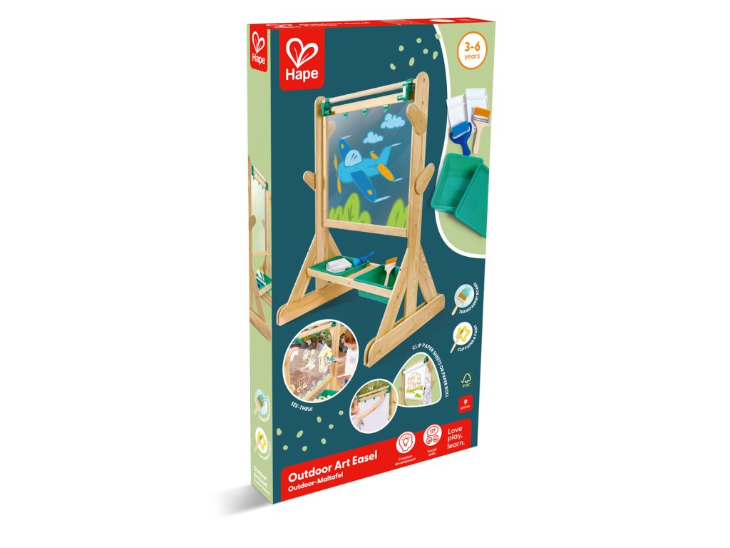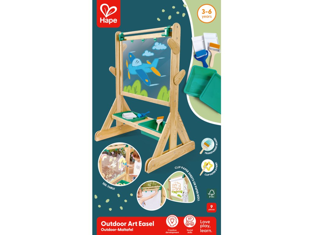 Dřevěný, výtvarný stojan od Hape. Tento robustní stojan je ideální pro venkovní kreativitu. Součástí je plastový podnos s víkem, pěnový váleček, dva podnosy na barvu, dva držáky papíru a tři spony ve tvaru listu. Konstrukce stojanu je vyrobena ze dřeva a kreslicí plocha je průhledná a lze ji snadno čistit mýdlem a vodou. Rozměr: 83x110x62 cm. Rozměr balení: 118x12x66,5 cm. Věk 3+