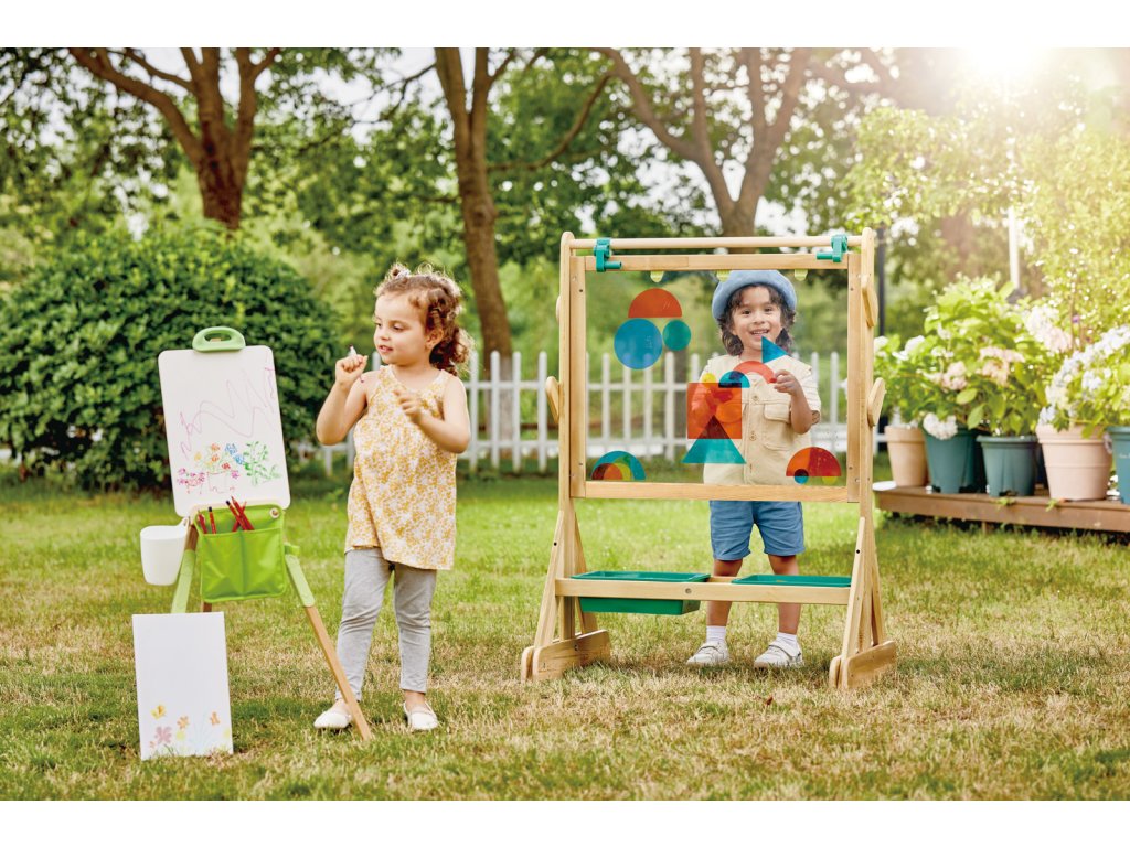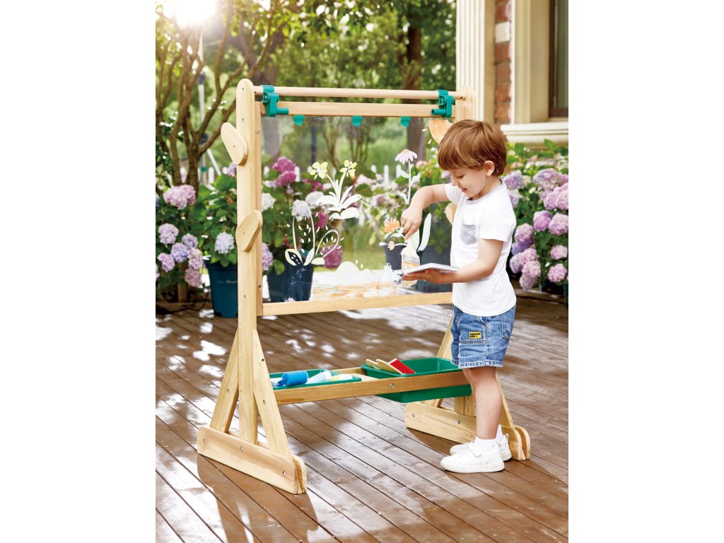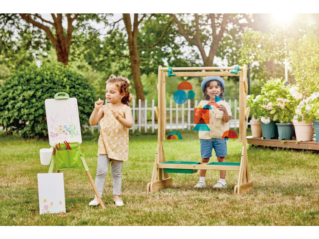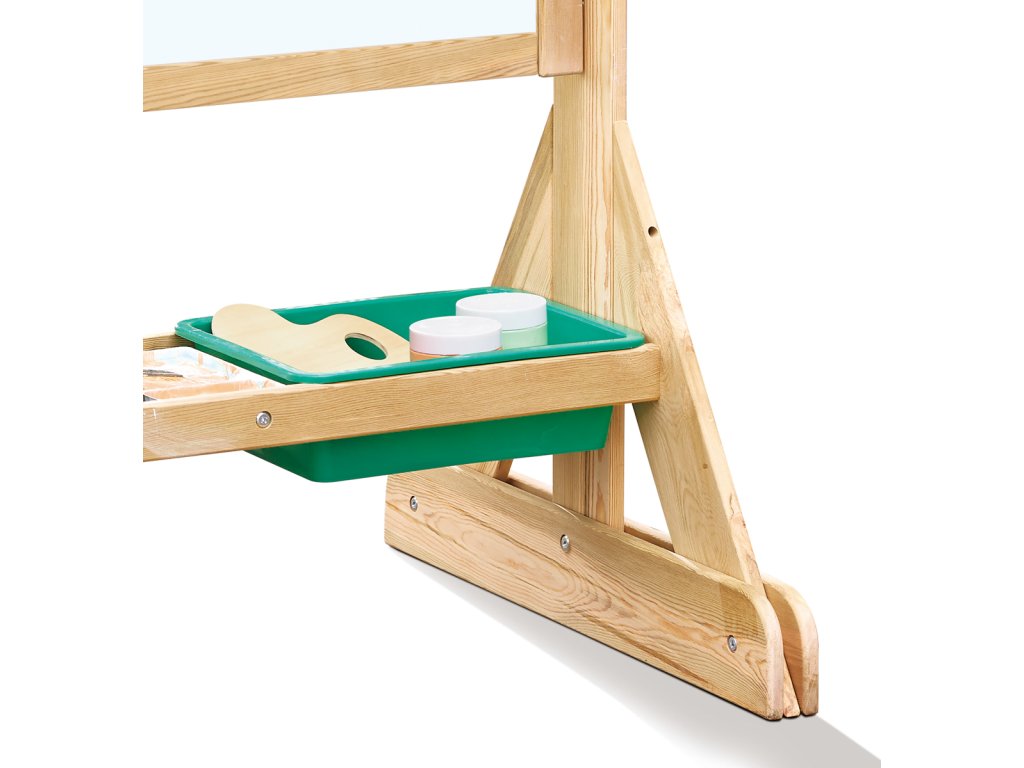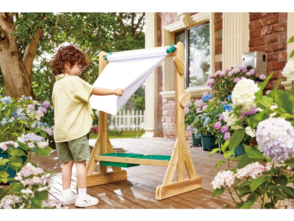 Dřevěný, výtvarný stojan od Hape. Tento robustní stojan je ideální pro venkovní kreativitu. Součástí je plastový podnos s víkem, pěnový váleček, dva podnosy na barvu, dva držáky papíru a tři spony ve tvaru listu. Konstrukce stojanu je vyrobena ze dřeva a kreslicí plocha je průhledná a lze ji snadno čistit mýdlem a vodou. Rozměr: 83x110x62 cm. Rozměr balení: 118x12x66,5 cm. Věk 3+