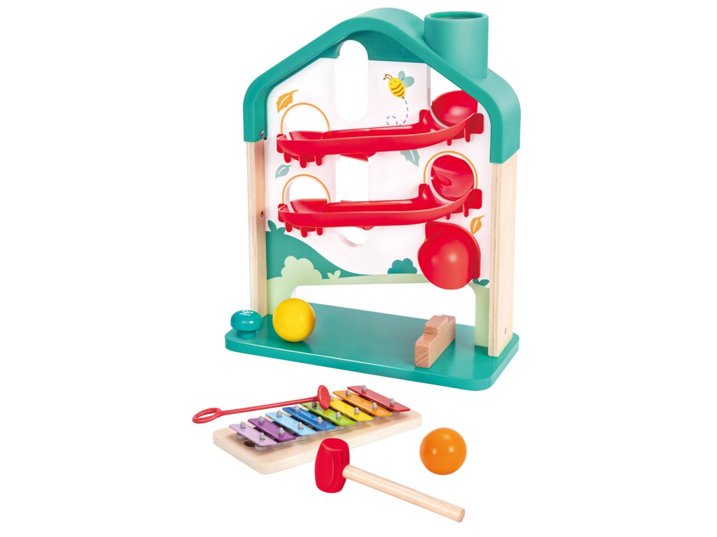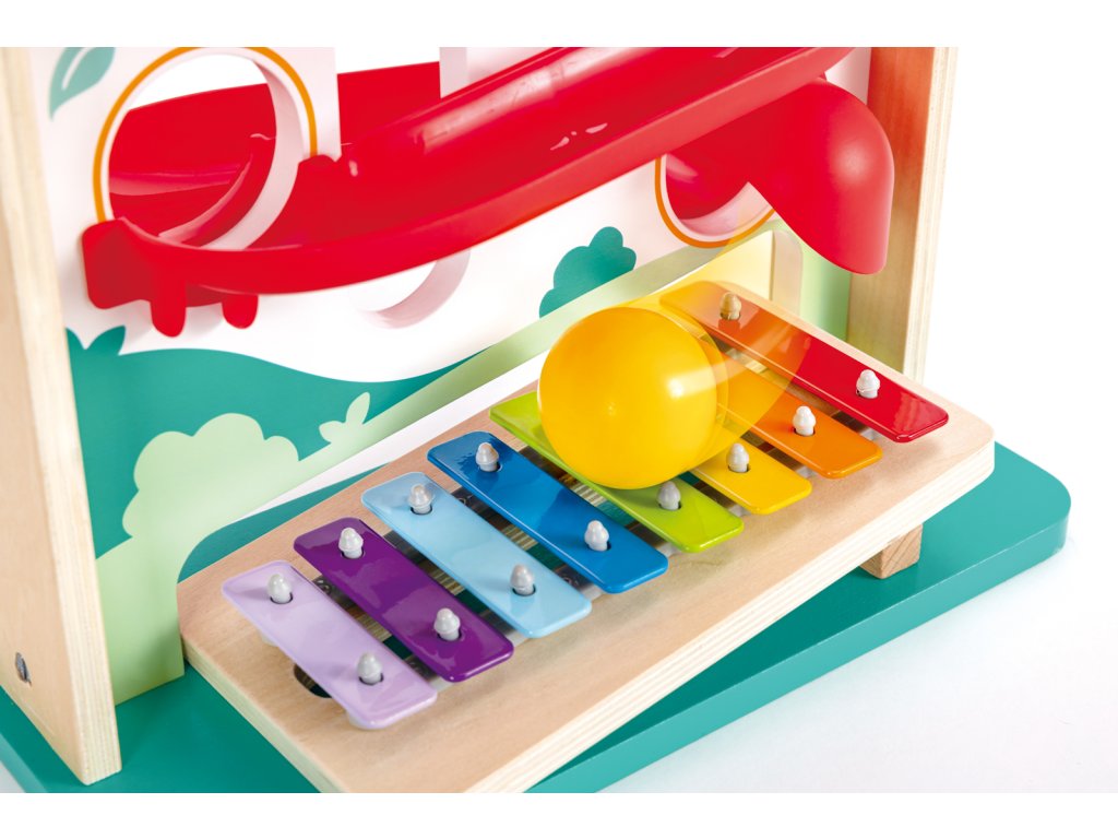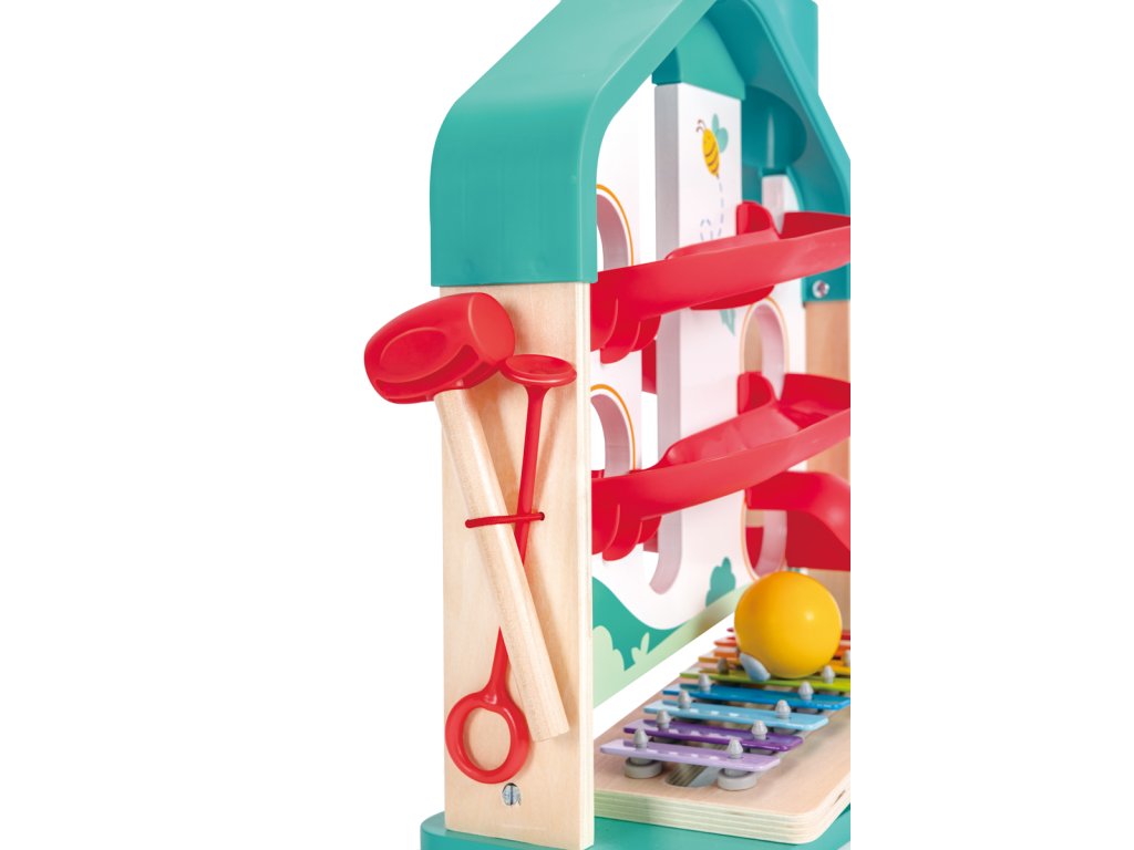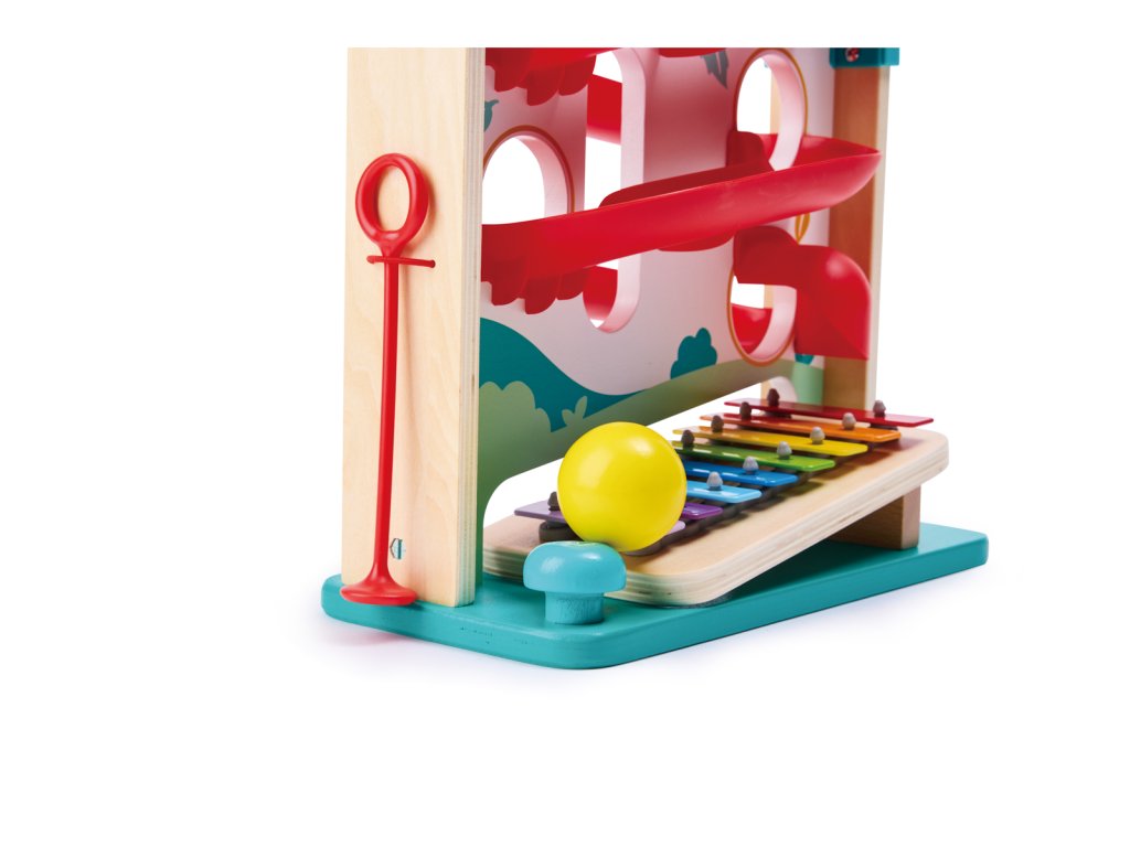 Zažijte radost z hudby a kuličkové dráhy s naší hrou ve tvaru domečku. Procházejte se barevným bludištěm nebo vyjměte desku xylofonu pro individuální melodickou hru. Režim hraní 2v1: Můžete hrát jako běh s míčem nebo můžete vyjmout xylofon a jednoduše hrát na nástroj. Manipulace s míčky na rolovací dráze a údery do xylofonových kláves zlepšuje dětskou koordinaci ruka-oko a jemnou motoriku. Děti se učí o vztazích příčin a následků, když pozorují, jak jejich činy, jako je koulení míčků nebo hra na xylofon, vytvářejí určité výsledky. Rozměr: 29.4x35x16.8 cm. Rozměr balení: 30x17.3x36 cm. Věk 1+