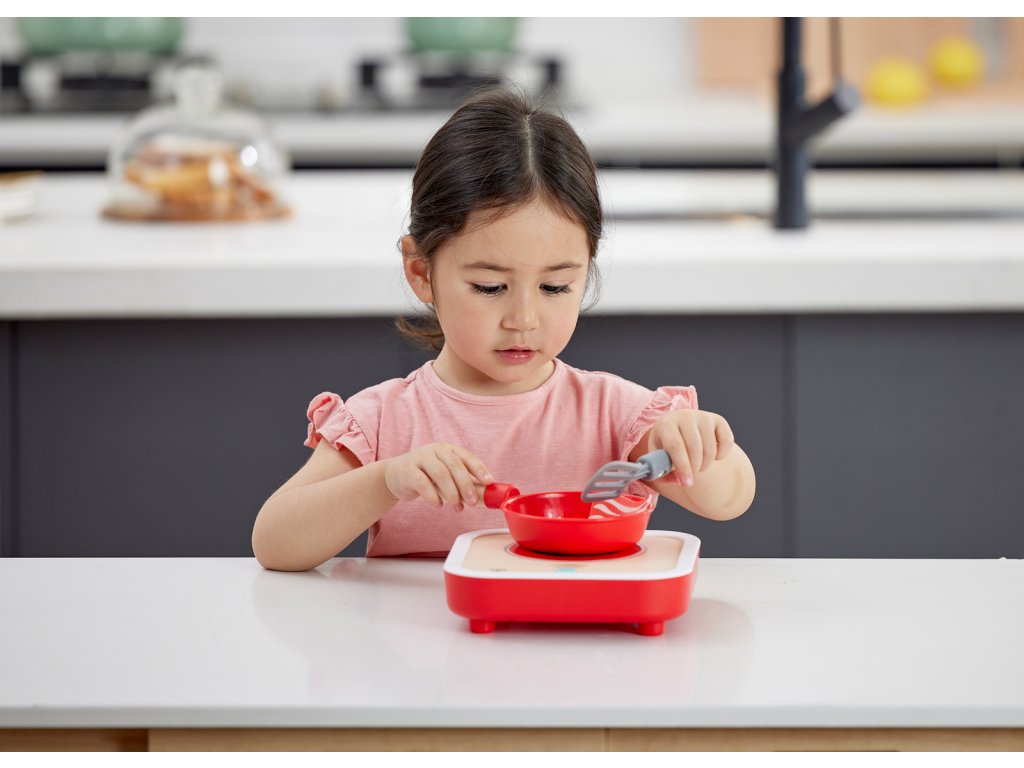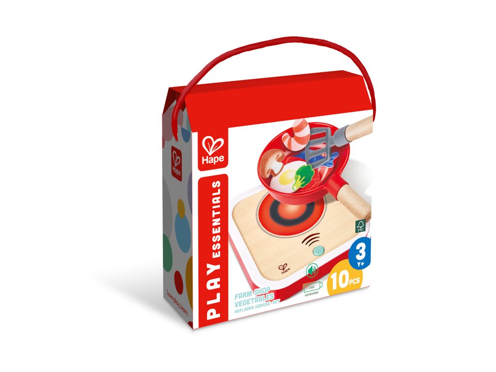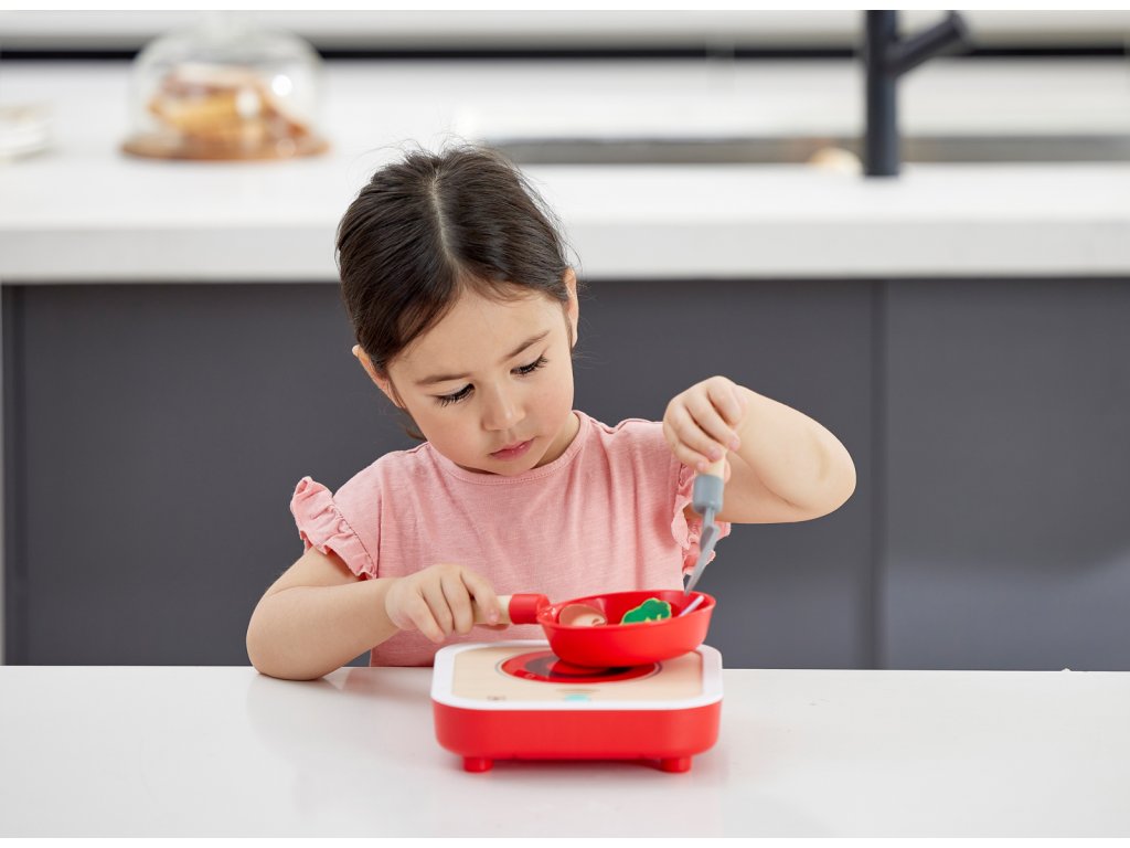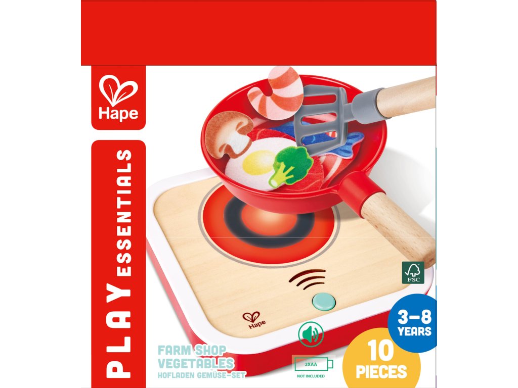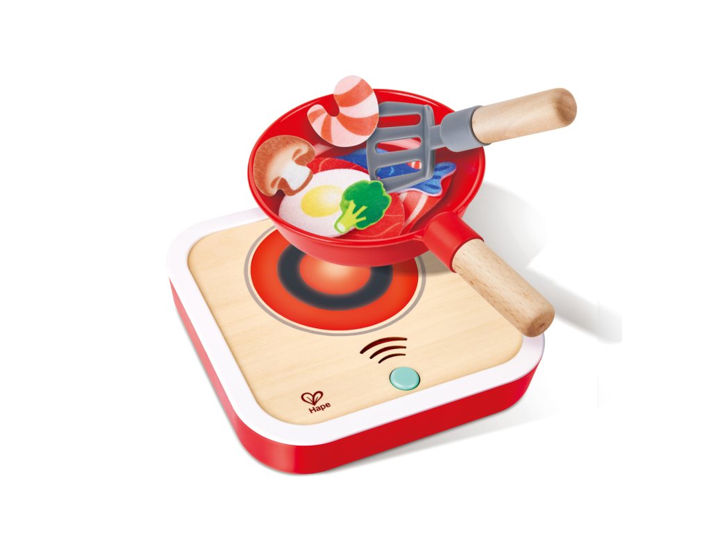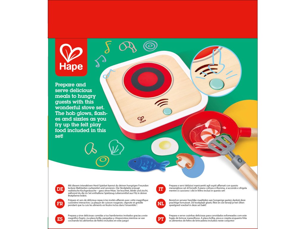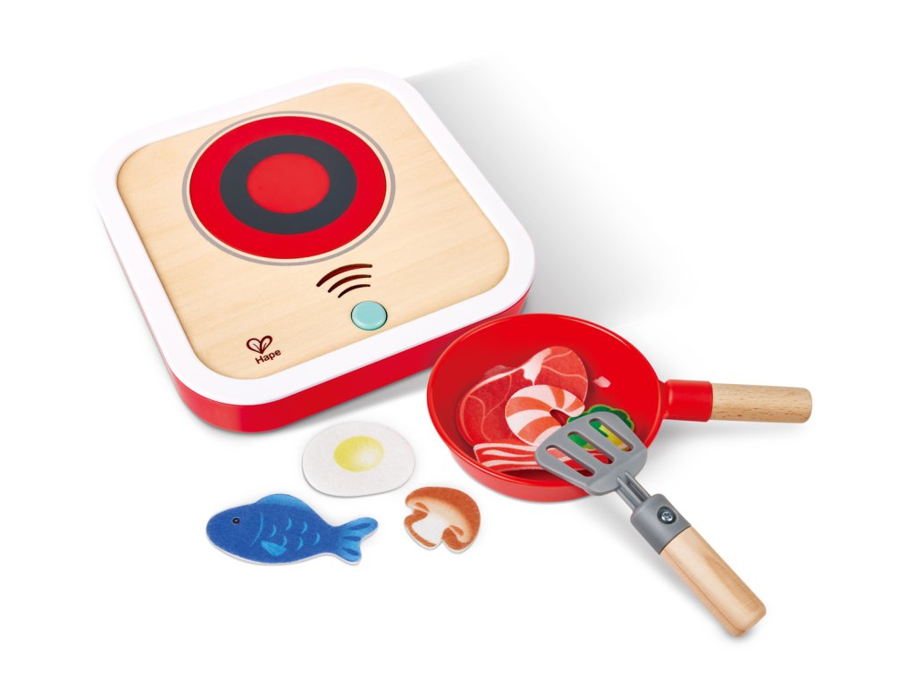 Hape Interaktivní sporák se světlem a zvukem. Dřevěná kuchyňská sada na hraní vaření s realistickými efekty. Součástí je 7dílné příslušenství z plsti – potraviny a doplňky, které obohatí dětskou hru na kuchaře. Skvělá hračka pro nápodobu skutečného vaření, podporující fantazii a tvořivost. Stiskněte tlačítko na vařiči a spusťte blikající světelné a syčící zvukové efekty. Automaticky se zastaví po 10 sekundách. Obsah sady: Vařič se světelnými zvukovými efekty, pánev, špachtle a sedm kousků plstěného jídla plstěného jídla – steak, slanina, kreveta, ryba, vejce, houba a brokolice. Díky robustní dřevěné konstrukci je hračka odolná a vaše dítě si ji zamiluje po mnoho let. Baterie: 2 x AA, nejsou součástí. Rozměry produktu: 21x 3,9 x 23 cm. Rozměry balení: 23,7 x 22,1 x 8,2 cm. Věk: 3+