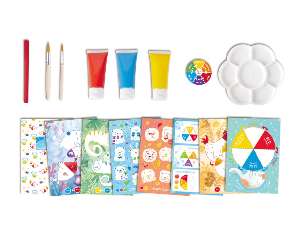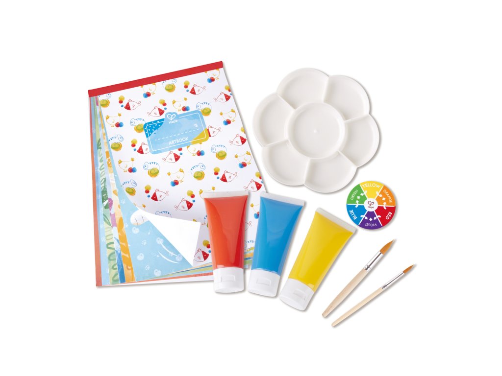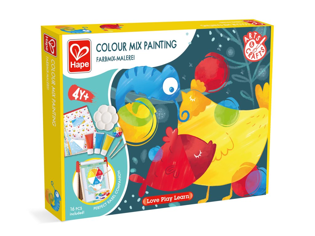 Poznejte principy míchání barev a naučte se vše o barvách s touto úžasnou sadou na malování. Navíc album obsahuje šest činností, které je třeba dokončit, a také i praktický klip na pořadač, díky kterému budou vaše umělecká díla pohromadě. Sada obsahuje tři 60ml tuby s barvou, jednu paletu, jedno kolečko s barvami, tři štětce, jedno album aktivit velikosti A3 a jeden klip na pořadač. Album má 8 stránek a obsahuje 6 aktivit o míchání základních barev a konceptu teplých a studených barev. Lze použít se stojanem Hape. Podporuje kreativitu, ale také rozvíjet jemné motorické dovednosti. Rozměr balení: 32,5x24x4,5 cm. Věk 4+
