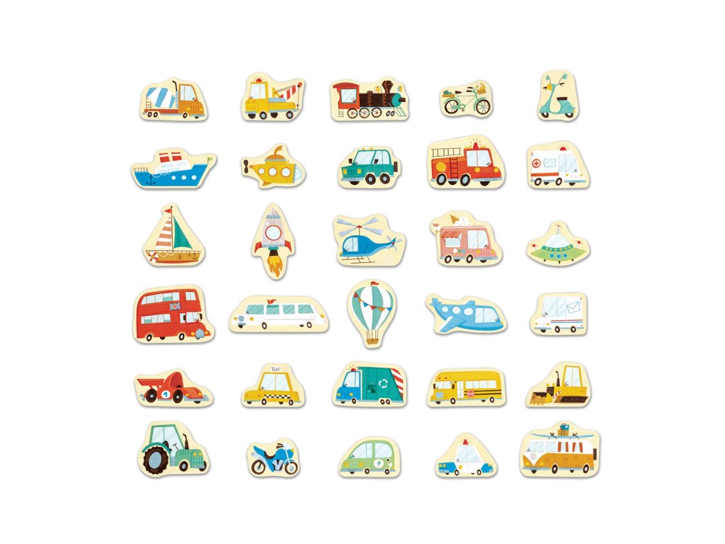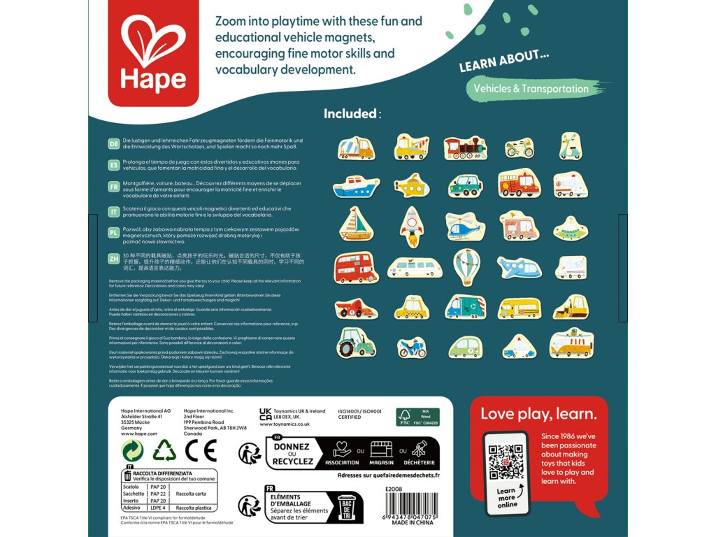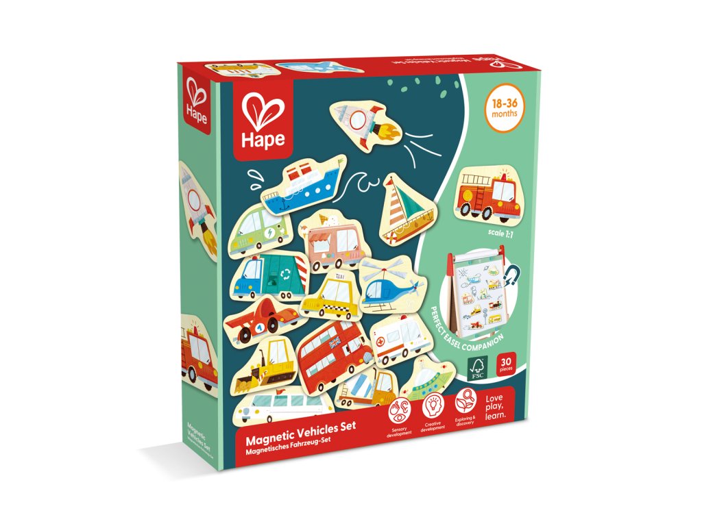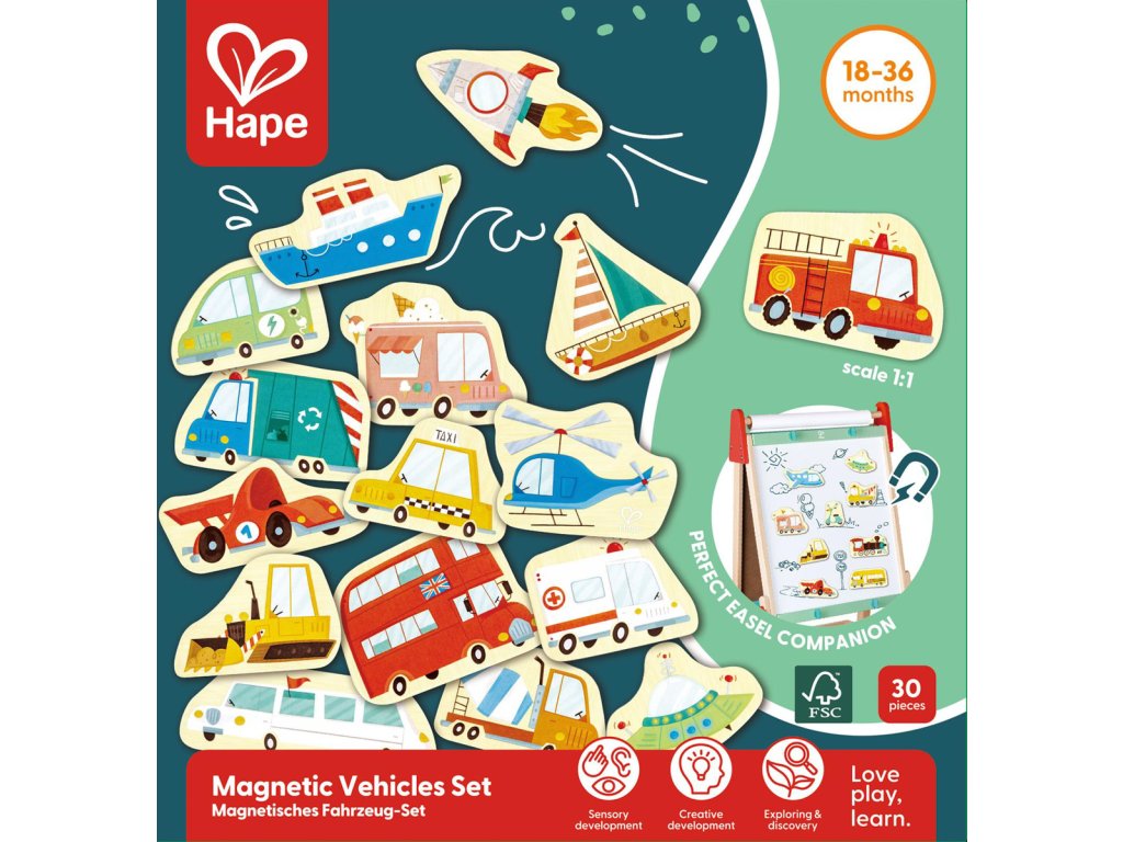 Sada magnetů s vozidly, která obsahuje 30 klasických vozidel, včetně aut, motocyklů, letadel, lodí a dokonce i UFO. Když se děti učí o různých způsobech dopravy, mohou si na základě vozidel vytvářet vlastní příběhy, což zvyšuje jejich jazykové a komunikační dovednosti. Lze používat na stojanu Hape nebo jako hračku na ledničku, tyto magnety přilnou na jakýkoli kovový povrch. Rozměr balení: 24,1x24,1x4,1 cm. Věk 18m+