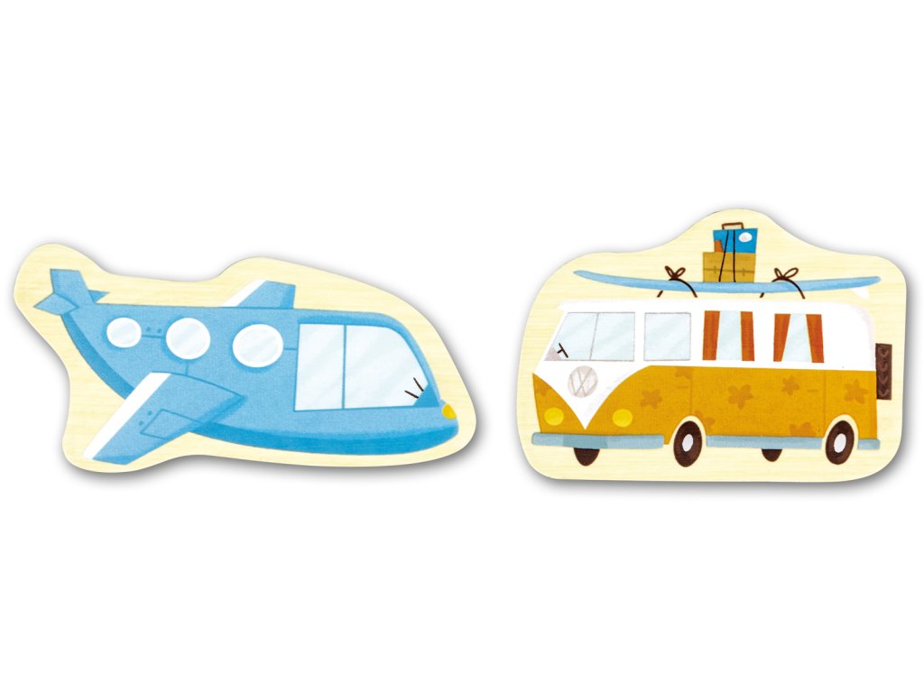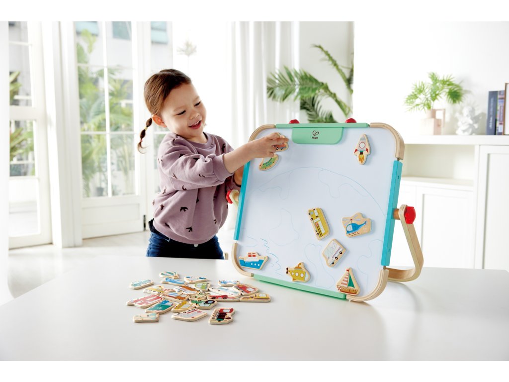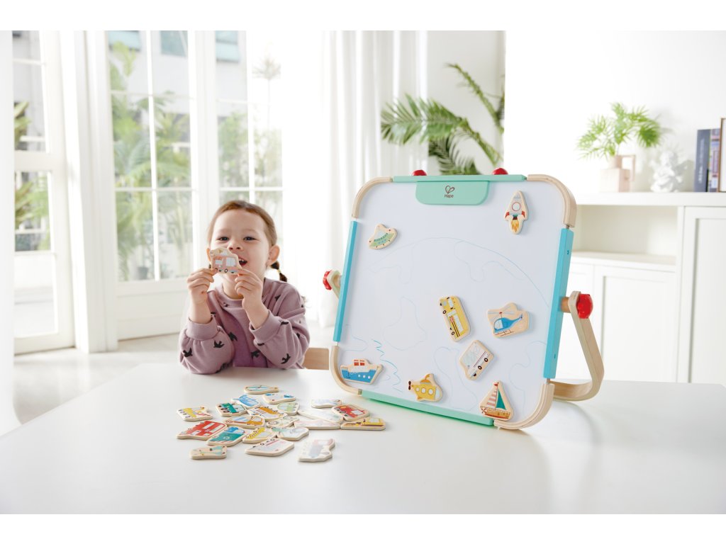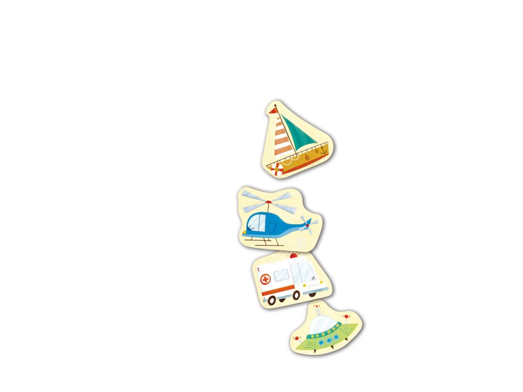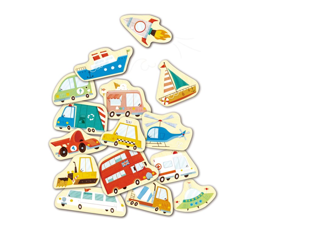 Sada magnetů s vozidly, která obsahuje 30 klasických vozidel, včetně aut, motocyklů, letadel, lodí a dokonce i UFO. Když se děti učí o různých způsobech dopravy, mohou si na základě vozidel vytvářet vlastní příběhy, což zvyšuje jejich jazykové a komunikační dovednosti. Lze používat na stojanu Hape nebo jako hračku na ledničku, tyto magnety přilnou na jakýkoli kovový povrch. Rozměr balení: 24,1x24,1x4,1 cm. Věk 18m+