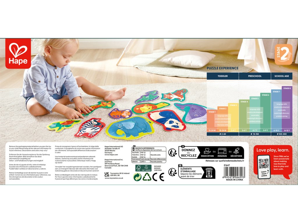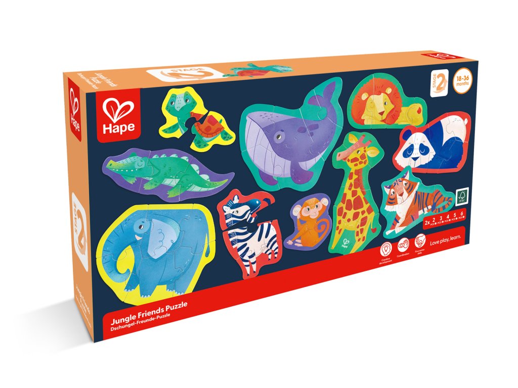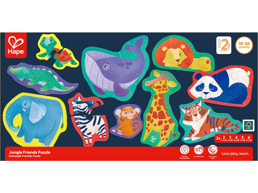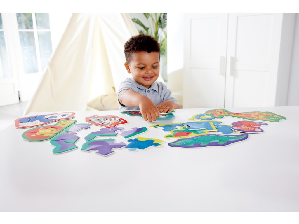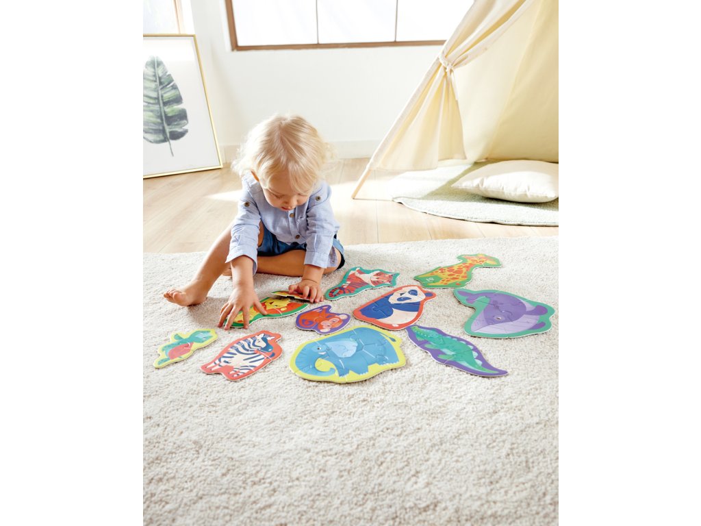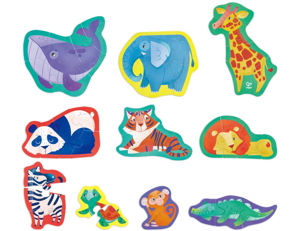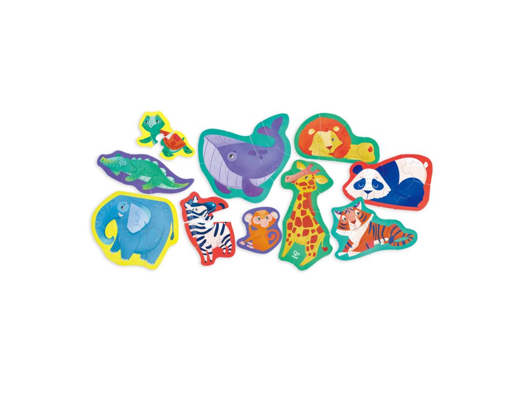 Zažijte vzrušení z divočiny s naší úchvatnou sadou puzzle s divokými zvířaty. Spojte dohromady majestátní stvoření a odhalte zázraky přírody. Tato sada puzzle obsahuje deset puzzle s exotickými zvířaty ve tvaru zebry, žirafy, velryby, pandy, lva, tygra, opice, želvy, slona a krokodýla. Když děti manévrují s hlavolamem a snaží se poskládat a spojovat různé dílky, rozvinou si klíčové dovednosti, jako je základní rozpoznávání vzorů, koordinace ruka-oko a řešení problémů. Rozměr balení: 36x6x18 cm. Věk 18m+