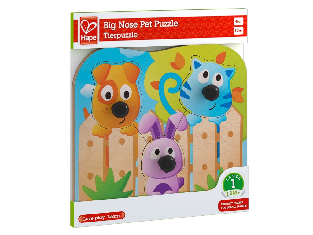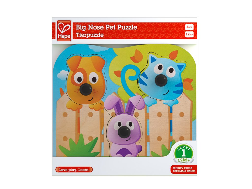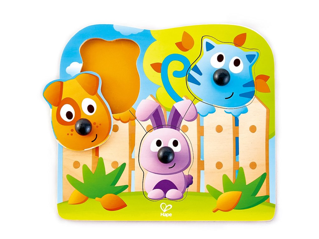 Puzzle s úchytkami s obrázky domácích zvířátek jsou v ideální velikosti pro malé ručičky. Sada obsahuje 4 dílky. Poutavé barevné provedení. Hračka pomáhá rozvíjet motorické dovednosti. Věk: 12m+. Rozměr: 22,5 x 20,8 x 3,5 cm.