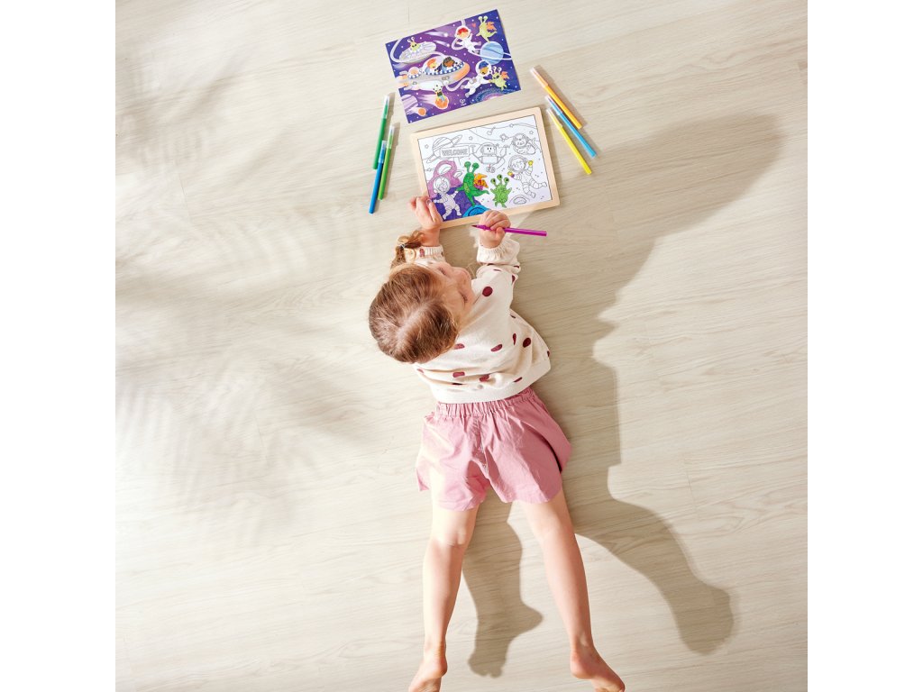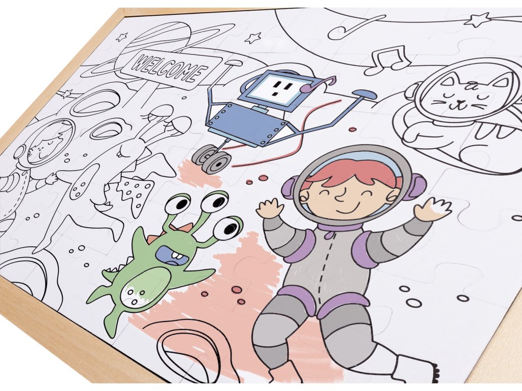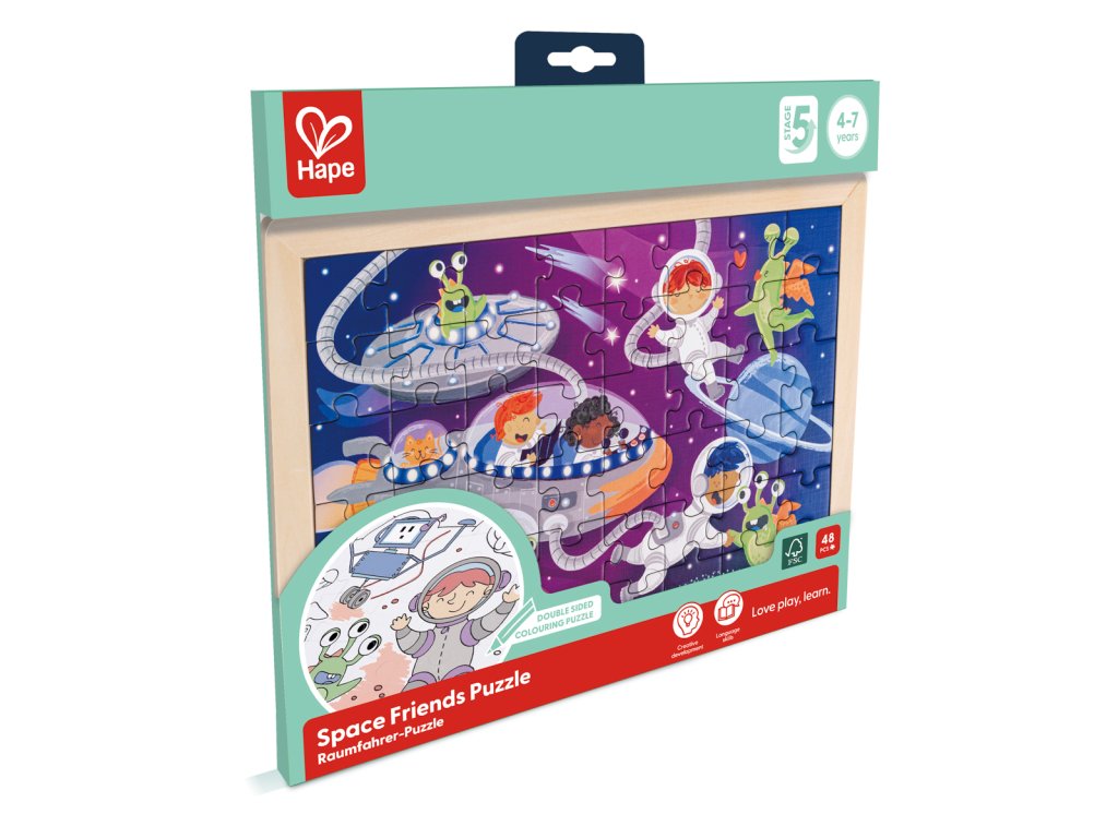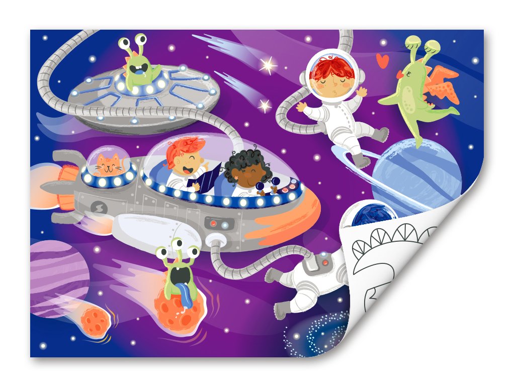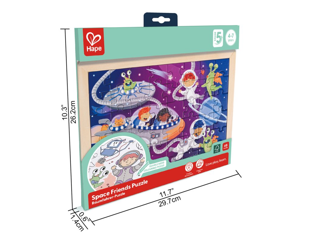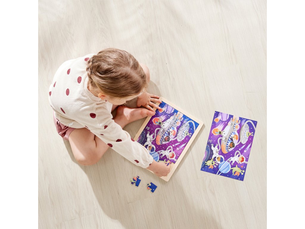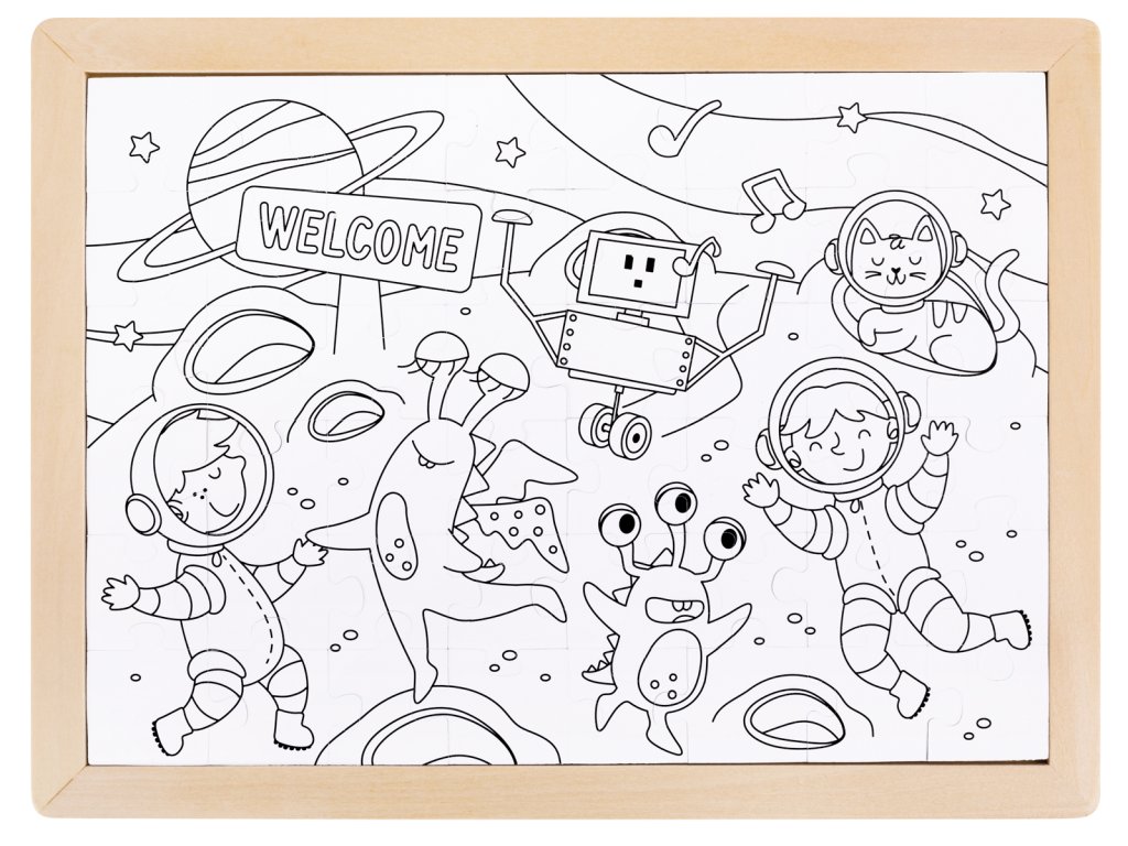 Prozkoumejte nekonečný vesmír s touto vesmírnou skládačkou se 48 dílky. Představuje astronautskou posádku na palubě jejich vesmírné lodi, doprovázenou několika přátelskými mimozemšťany a spoustou blikajících hvězd. Na zadní straně je nenabarvená šablona, ??kterou si můžete vytvořit vlastní puzzle. Balení: 26,2x1,4x29,7cm. Věk: 4+