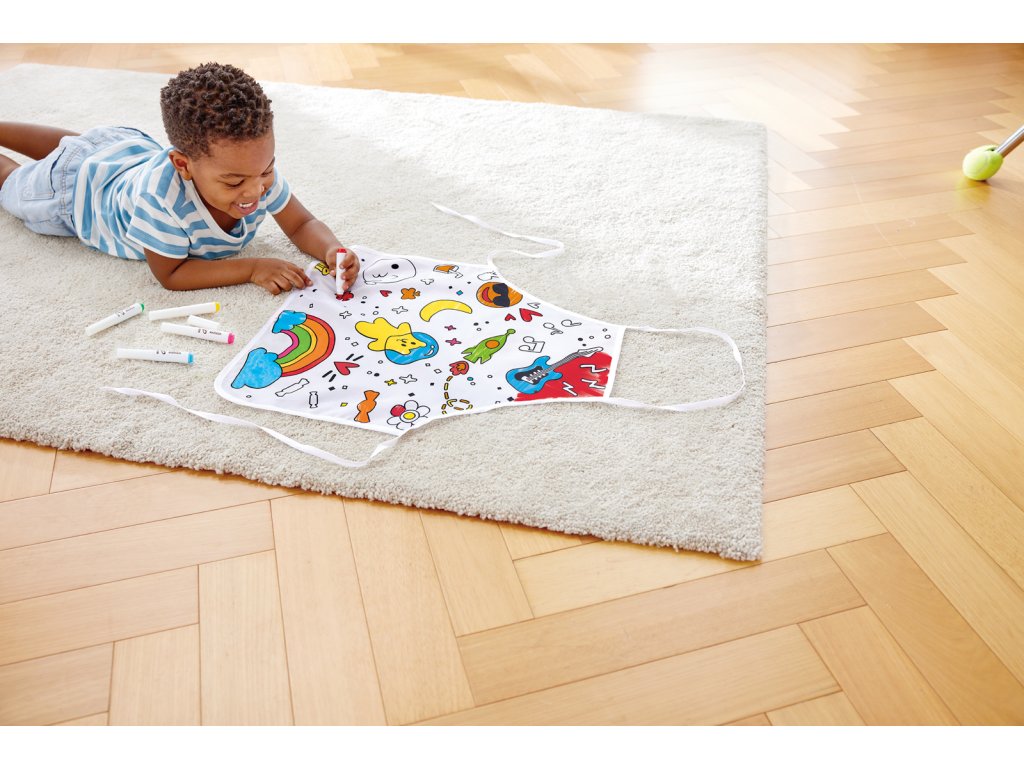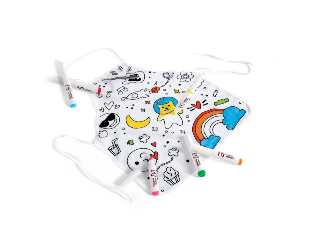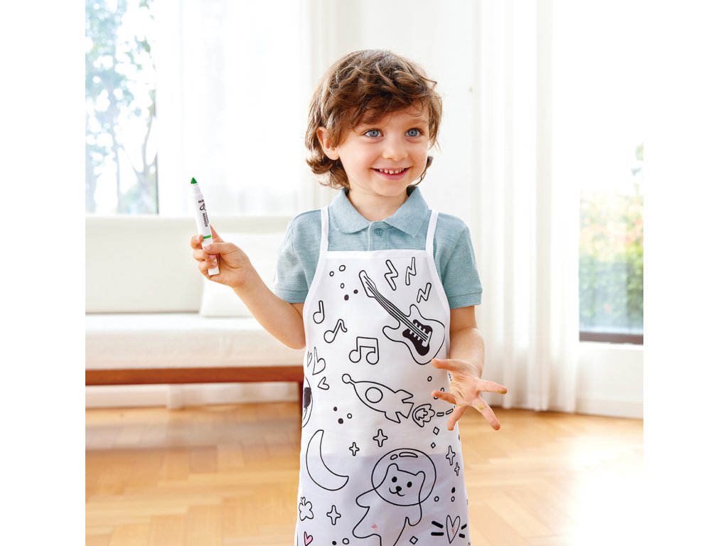 Vytvořte si svou vlastní mistrovskou zástěru, kterou budete používat znovu a znovu, když je čas na kreativitu. Díky zábavným, dětem přátelským designům – jako jsou duhy, raketové lodě a noty – mohou děti vymýšlet své vlastní příběhy a zároveň doplňovat tvary svými oblíbenými barvami. Tato zástěra je dodávána se sadou šesti fixů: zelená, červená, žlutá, oranžová, modrá a černá. Zástěra je voděodolná, aby chránila umělecká díla vašeho dítěte před šmouhami a politím. Rozměr balení: 20x3x12 cm. Věk 3+
