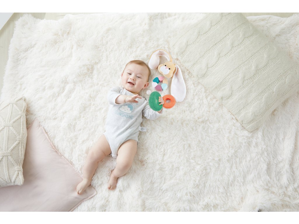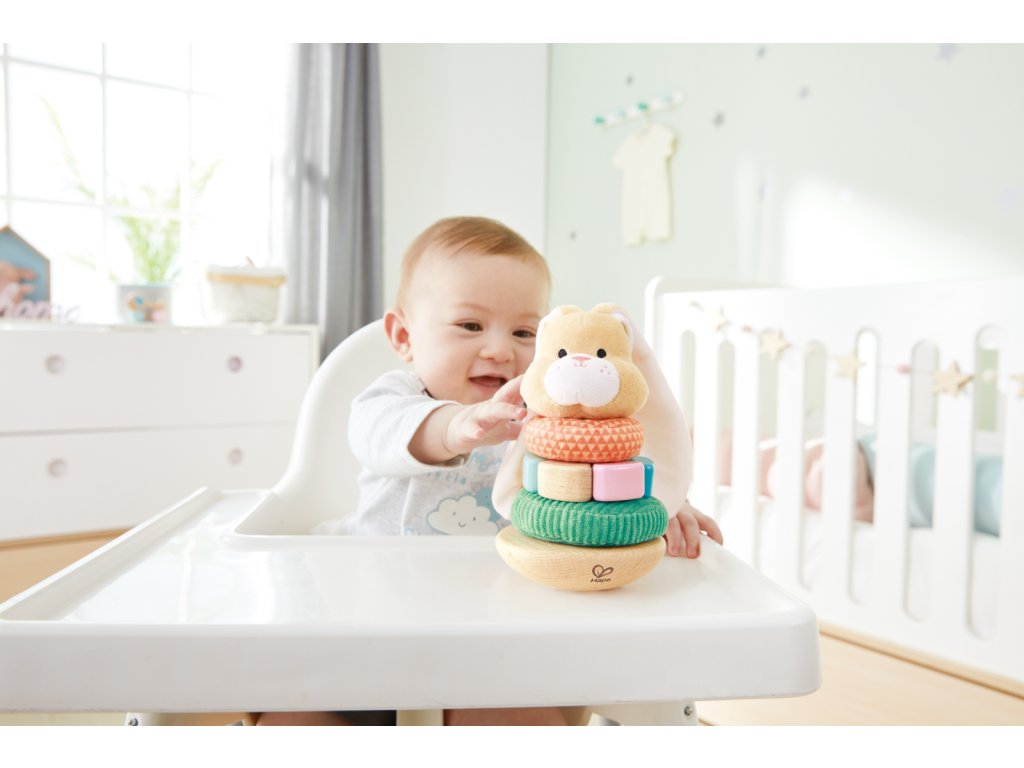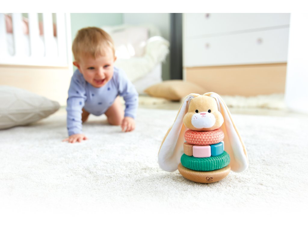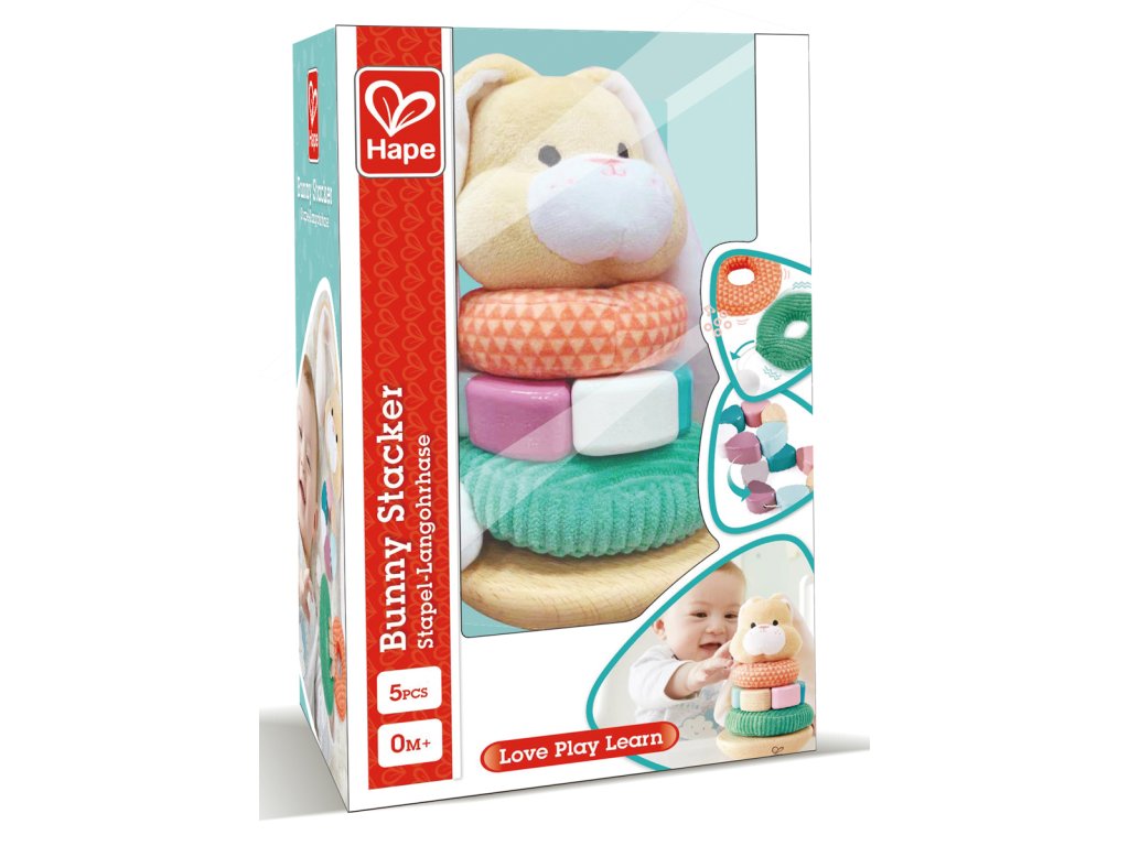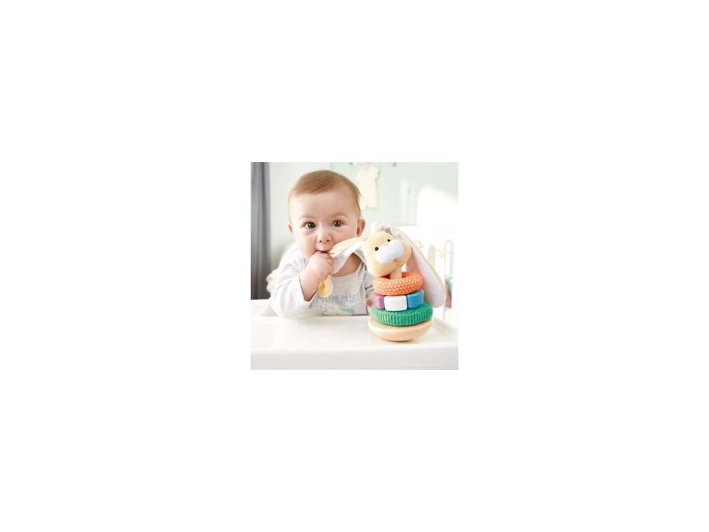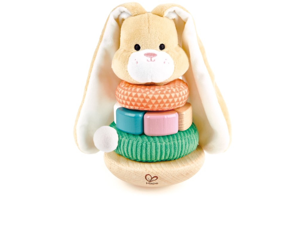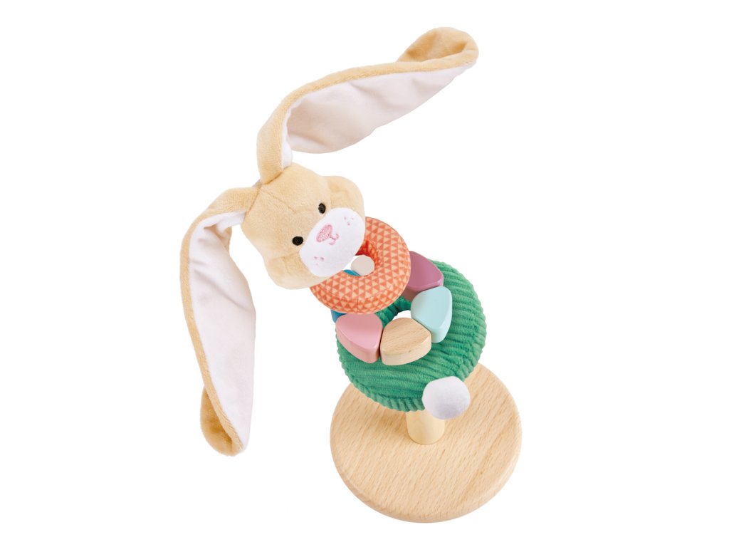 Tento roztomilý králík s dlouhýma ušima určitě vykouzlí úsměv na tváři každého. Hračka se skládá z pěti částí - dřevěné základny z buku, tří skládacích kroužků z různých materiálů a plyše, ze kterého je hlava zajíčka s dlouhýma ušima. Jeden ze stohovacích kroužků má provázkový ocas, který po vytažení vydává roztomilý cvakavý zvuk. Hračka podporuje jemnou motoriku a rozpoznávání barev. Rozměr balení: 12x11x18 cm. Věk 10m+