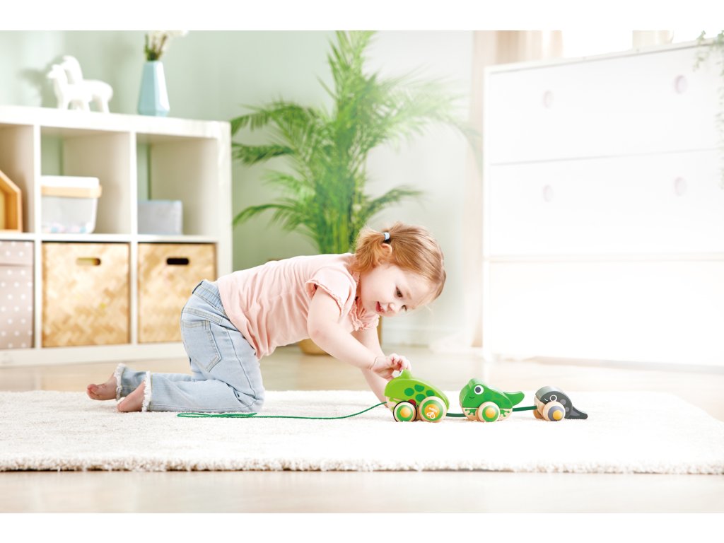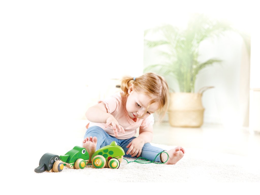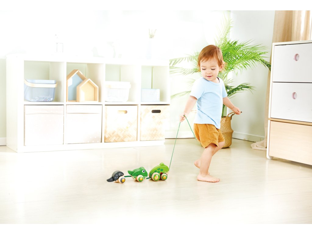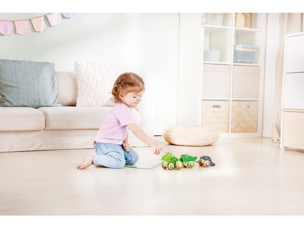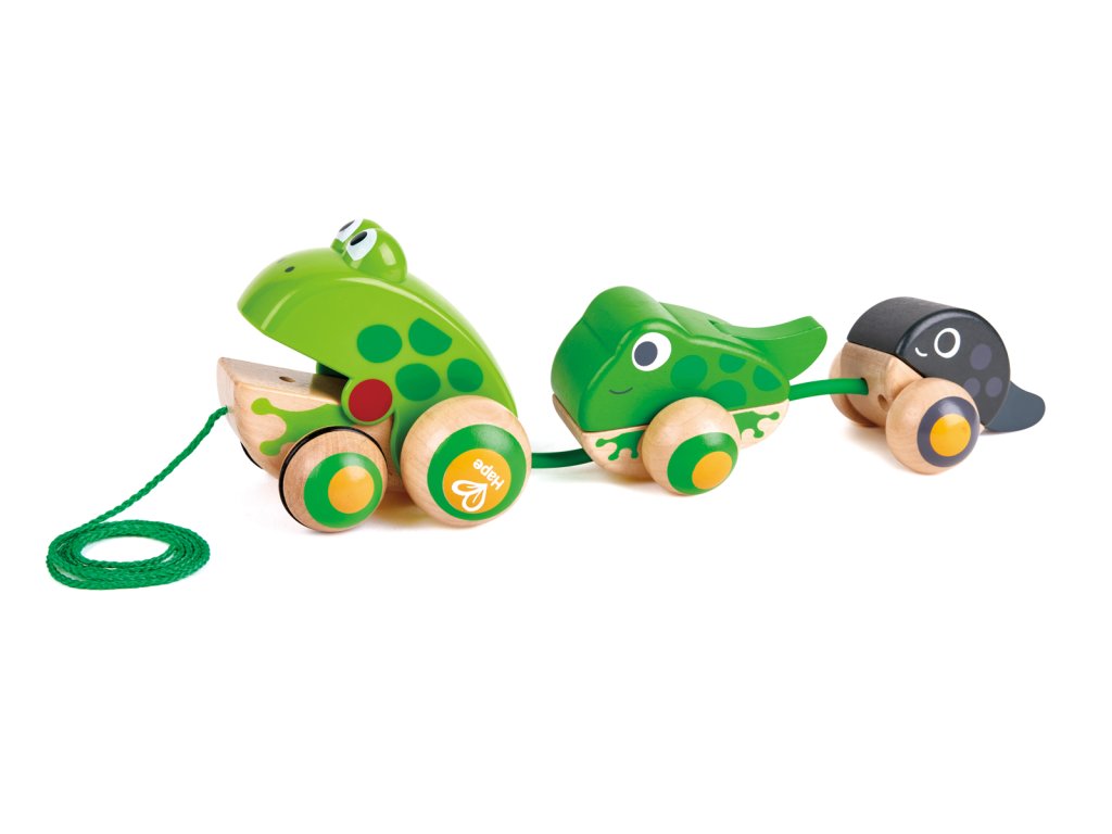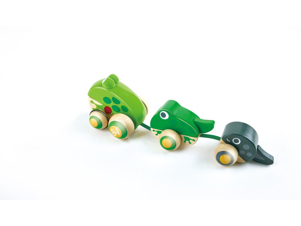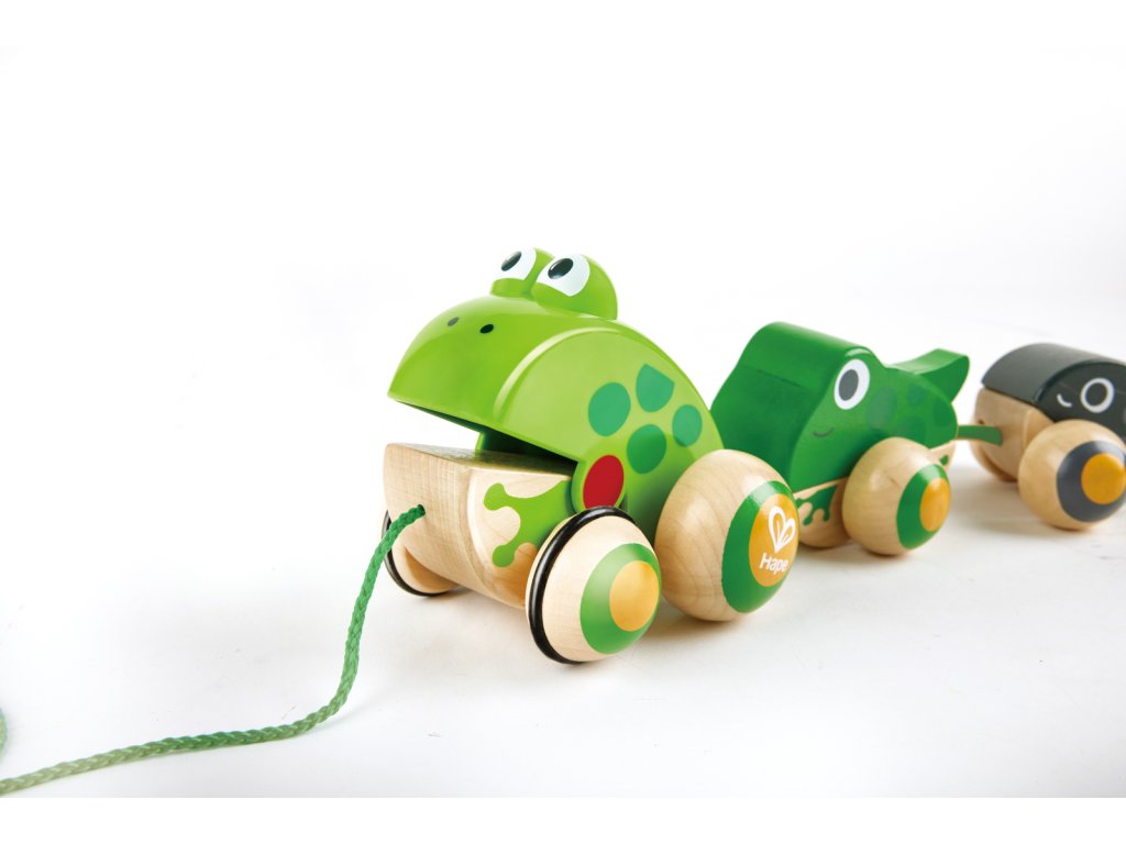 Tato krásná maminka žabka bere své ratolesti na procházku. Zatáhněte za šňůrku a sledujte, jak otevírá a zavírá ústa. Když vytáhnete tuto žabí rodinku, uvidíte maminku, jak kráčí se svou žabkou a malým pulcem kolébat se za ní. Balení: 12x15x36cm. Věk: 12m+