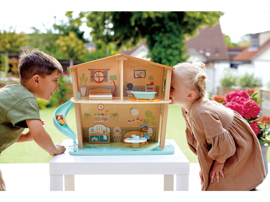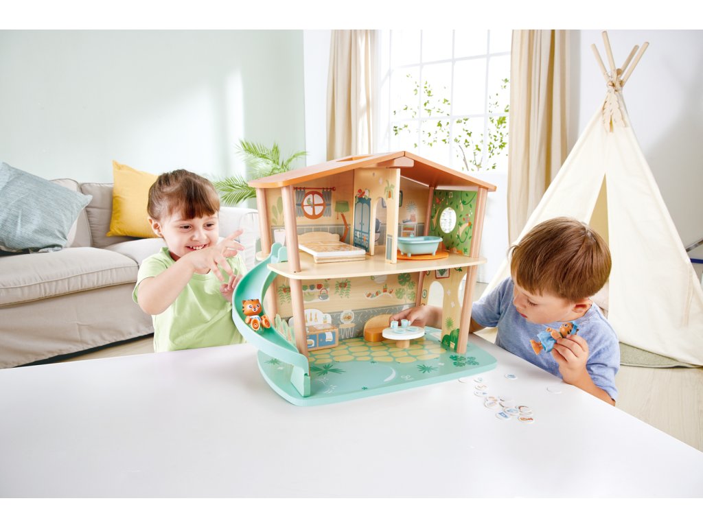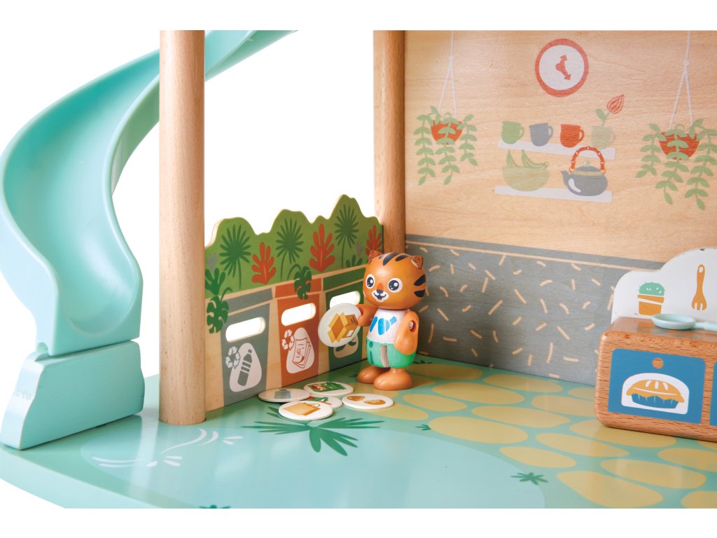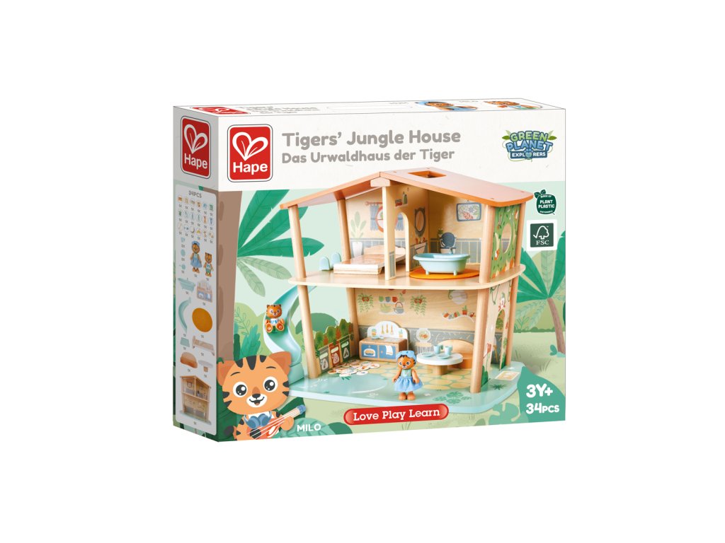 Poznejte ekologický dům z džungle a jeho dva tygry, které děti seznámí s udržitelným životem. Skvělý způsob, jak naučit děti odpovědnosti k životnímu prostředí a zároveň rozvíjet jejich kreativitu a představivost. Sada obsahuje dům, dvě figurky tygra, postel, vanu s podložkou, pohovku, čajový stolek, pánev, sporák, a dva talíře a šálky. Navíc ještě 18 odpadkových karet pomocí kterých se děti naučí důležitosti třídění odpadků a recyklaci. Figurky tygrů mohou sedět, stát a držet v rukách příslušenství. Tato sada z řady Green Planet Explorers je vyrobena z udržitelných materiálů. Sada se snadno sestavuje a je dodávána s praktickou rukojetí. Rozměr: 54.5x43x31 cm. Rozměr balení: 52,2x48,2x10 cm. Věk 3+