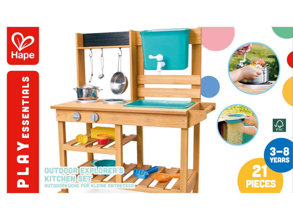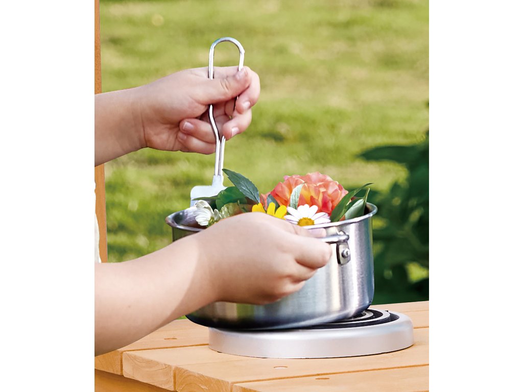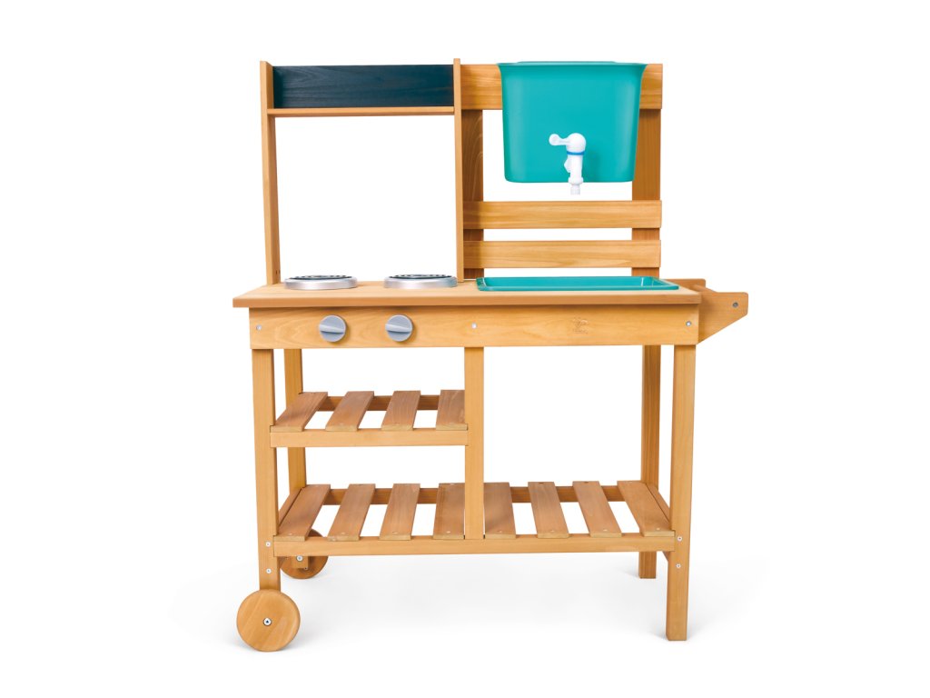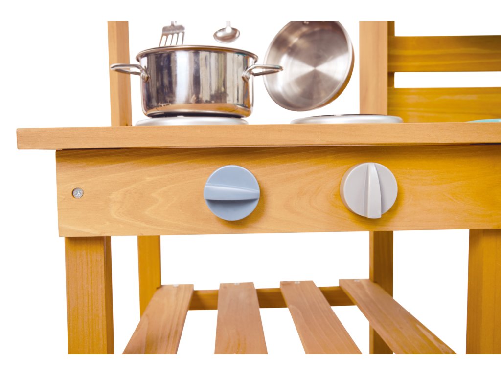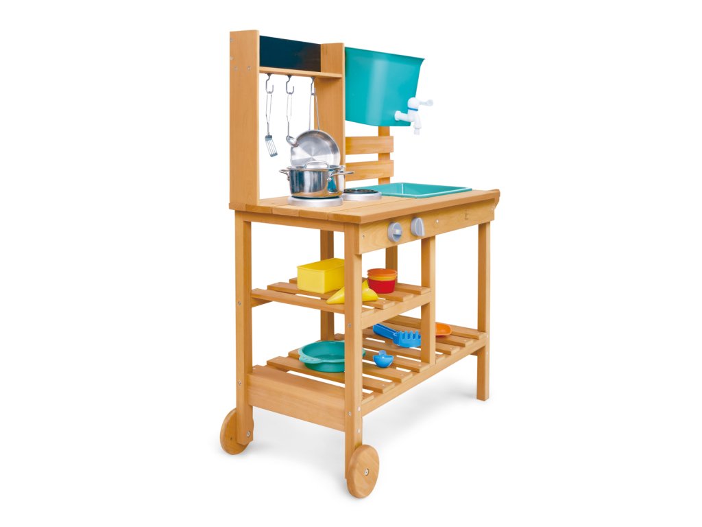 Objevte kouzlo vaření pod širým nebem! Tato dřevěná venkovní kuchyňka je dokonalou kombinací hry, objevování a tvořivosti. Děti mohou míchat, přelévat, sít i vařit „speciality“ z písku, vody a přírodnin – ideální hračka pro malé objevitele. Přitom si procvičují jemnou motoriku, fantazii i spolupráci s ostatními. Sada obsahuje 21 dílů: robustní dřevěná kuchyňka na kolečkách, odnímatelný dřez s kohoutkem, pracovní miska, hrnec s pokličkou, pánev, cedník, naběračka, vařečka, špachtle, 4 barevné kelímky, 2 lopatičky, hrabičky a formička na písek. Díky pevnému FSC dřevu a bezpečným materiálům je připravena na každodenní dobrodružství na zahradě. Rozměry balení: 42,5 x 74 x 21,5 cm. Doporučený věk: od 3 do 8 let.