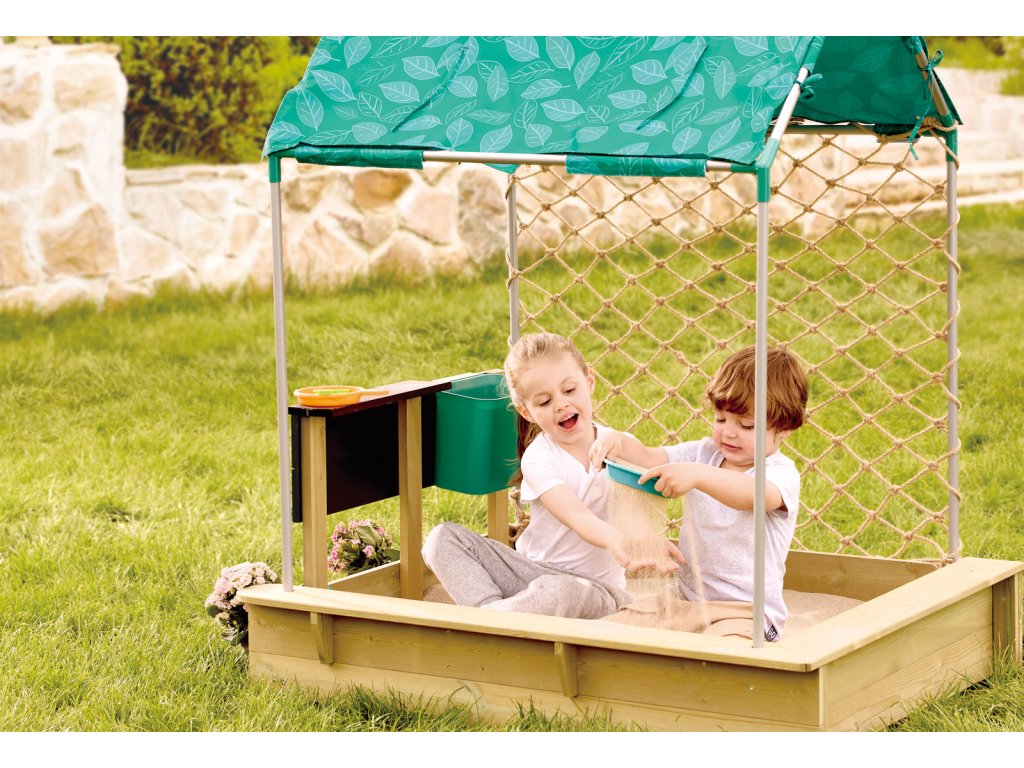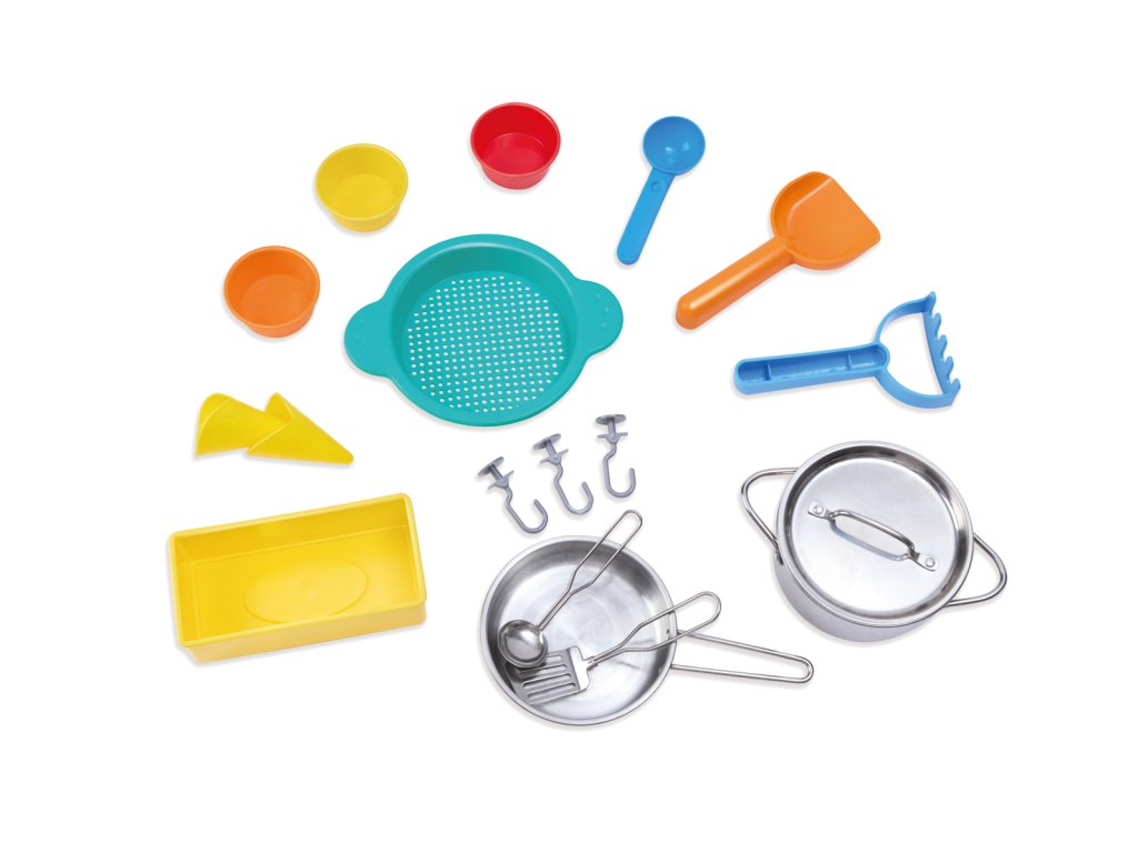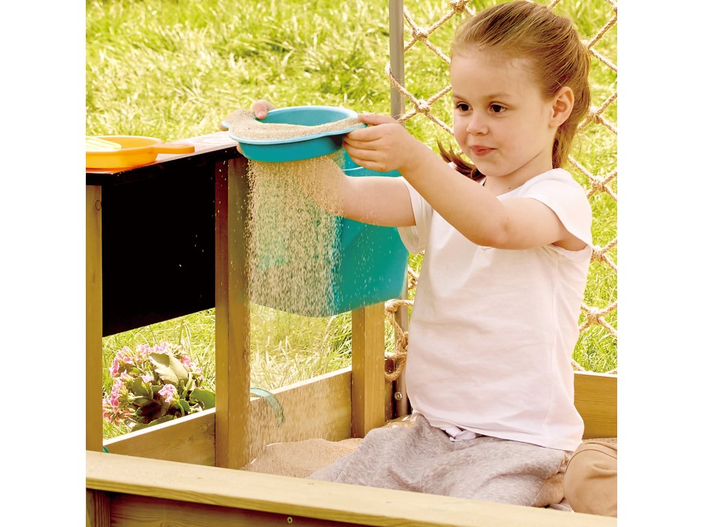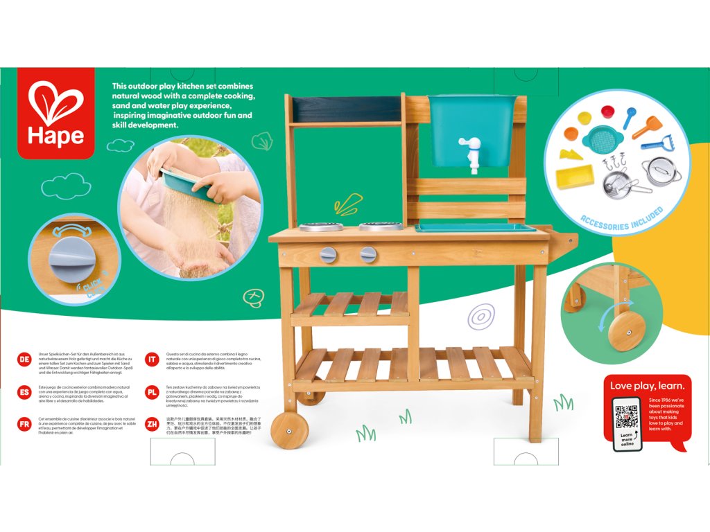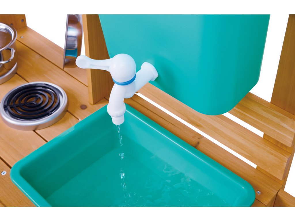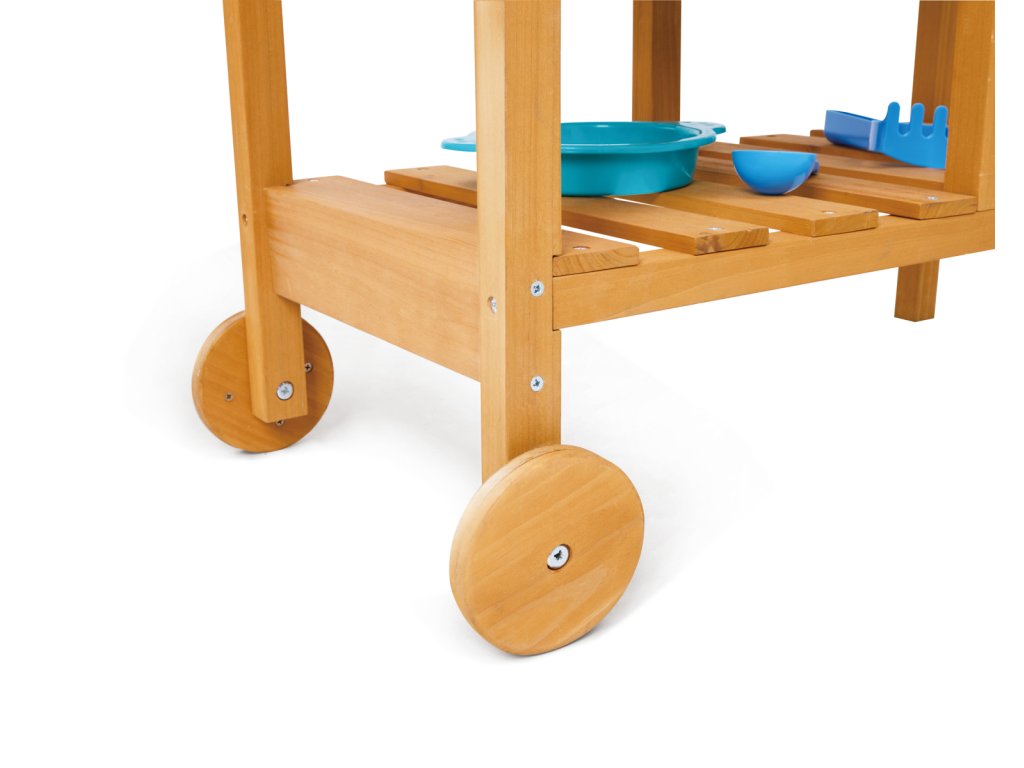 Objevte kouzlo vaření pod širým nebem! Tato dřevěná venkovní kuchyňka je dokonalou kombinací hry, objevování a tvořivosti. Děti mohou míchat, přelévat, sít i vařit „speciality“ z písku, vody a přírodnin – ideální hračka pro malé objevitele. Přitom si procvičují jemnou motoriku, fantazii i spolupráci s ostatními. Sada obsahuje 21 dílů: robustní dřevěná kuchyňka na kolečkách, odnímatelný dřez s kohoutkem, pracovní miska, hrnec s pokličkou, pánev, cedník, naběračka, vařečka, špachtle, 4 barevné kelímky, 2 lopatičky, hrabičky a formička na písek. Díky pevnému FSC dřevu a bezpečným materiálům je připravena na každodenní dobrodružství na zahradě. Rozměry balení: 42,5 x 74 x 21,5 cm. Doporučený věk: od 3 do 8 let.