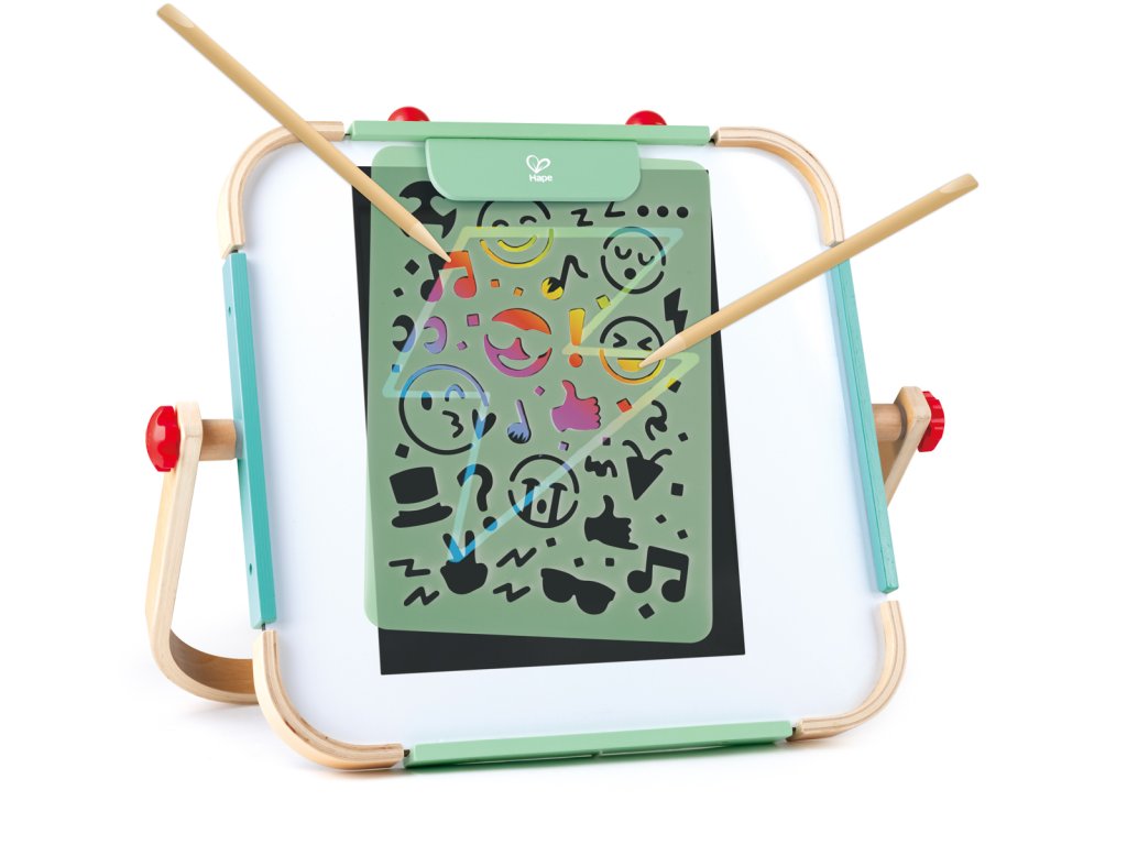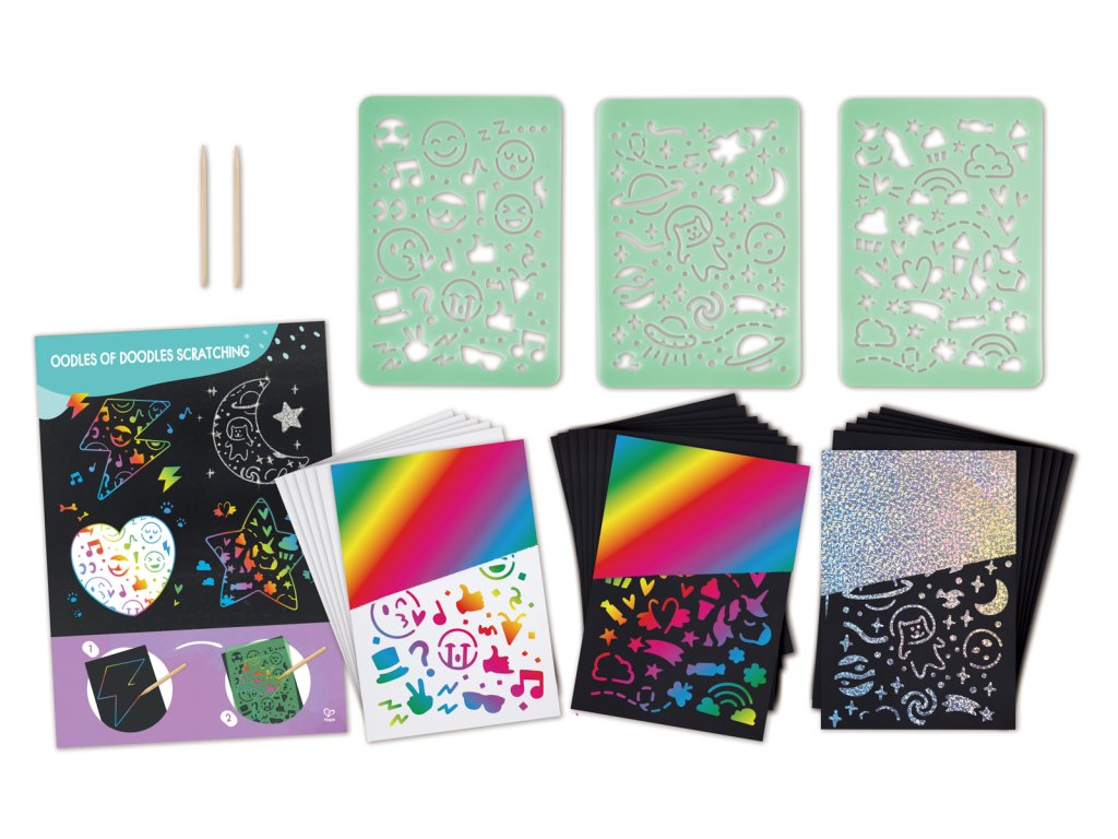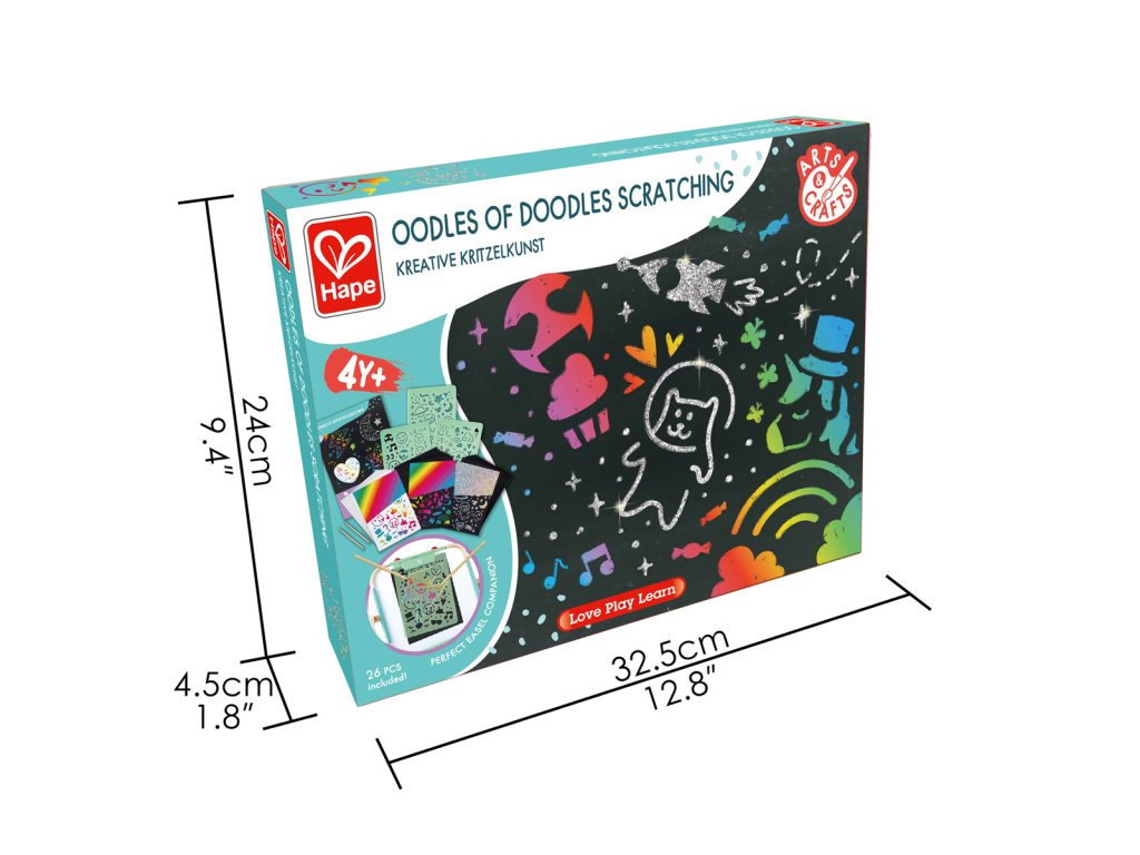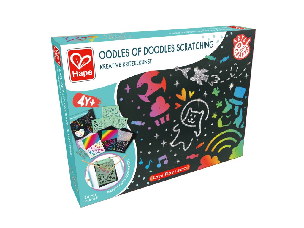 Pozvedněte čmárání na zcela novou úroveň s touto vzrušující sadou na škrábání. Stačí seškrábat své oblíbené vzory šablon dřevěným stylusem, a pokud se cítíte sebejistě, čmárejte si vlastní návrhy a sledujte, jak se pod nimi objeví třpytivé pozadí. Sada obsahuje tři listy A5 zábavných tematických šablon, 20 škrabacích listů se třemi typy barevných vrstev, dva dřevěné stylusy a jeden plakát A4. Zvednutí, držení a používání škrabacích tyčinek pomáhá rozvíjet jemné motorické dovednosti. Sada je skvělá pro povzbuzení kreativního myšlení a představivosti, stejně jako pro rozvoj vyprávění příběhů a jazykových dovedností. Tuto sadu lze použít spolu se stojanem Hape pro extra umělecký nádech. Rozměr balení: 32,5x24x4,5 cm. Věk 4+