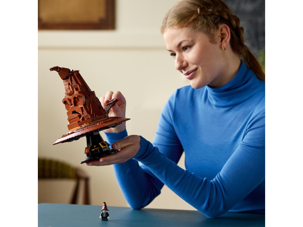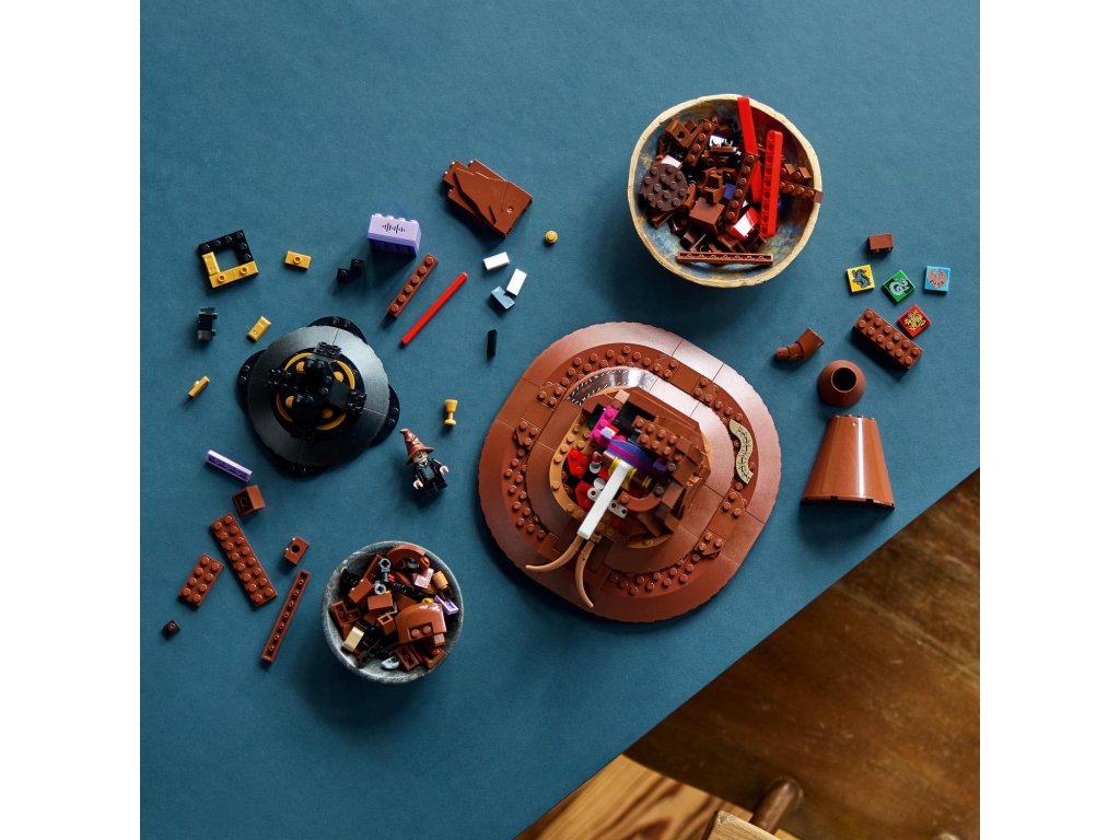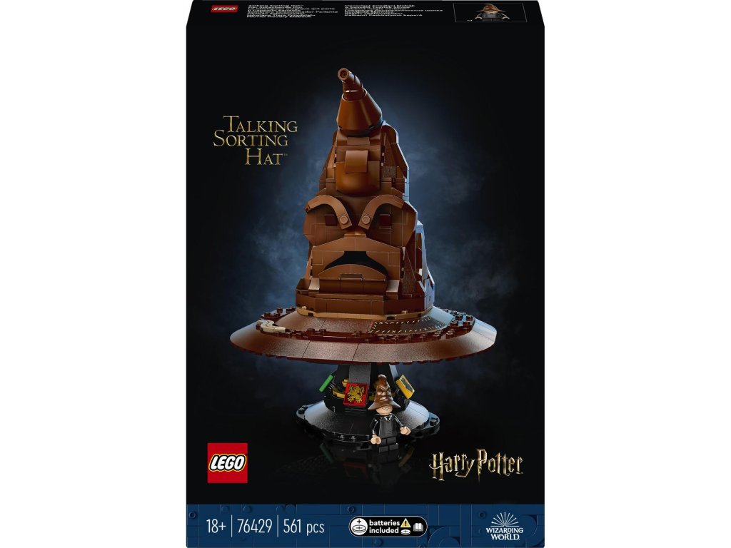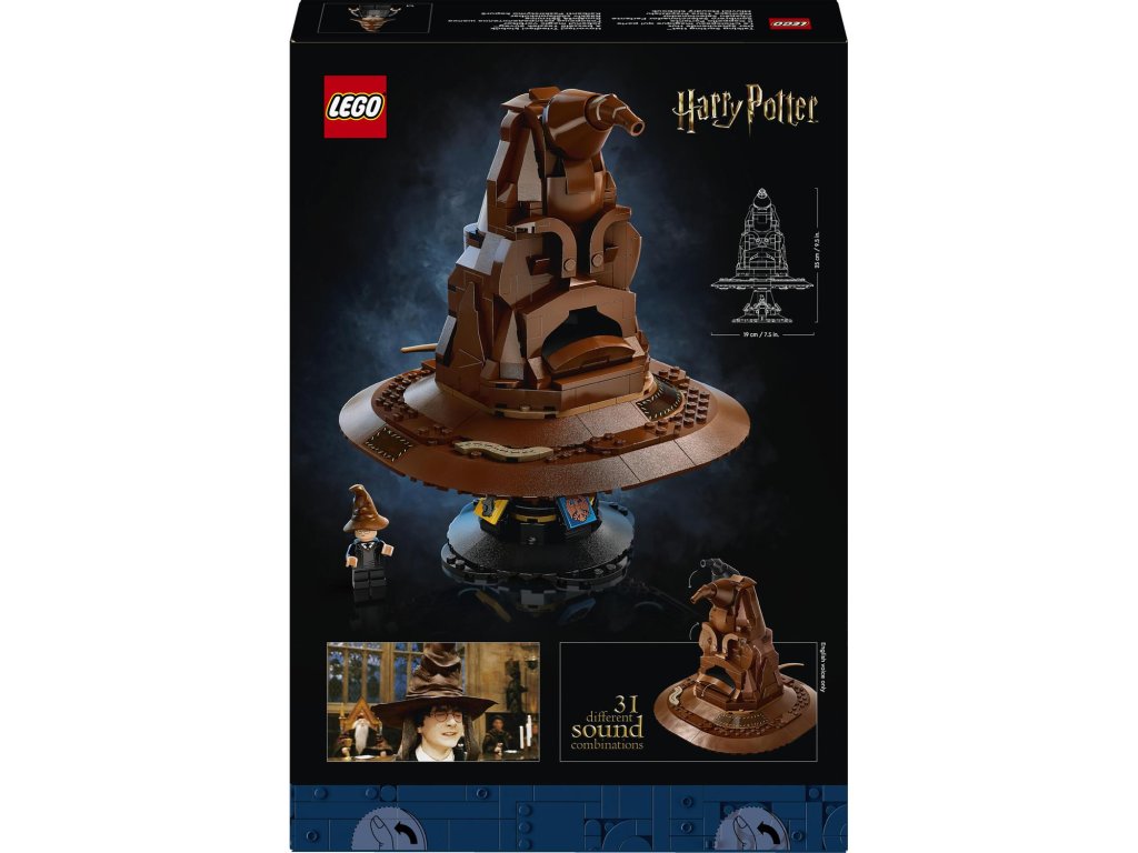 Ponořte se do stavění okouzlujícího modelu Mluvící Moudrý klobouk (76429). Jedná se o zcela první stavebnici z řady LEGO® Harry Potter™ se zvukovou kostkou, která tento model přivádí k životu. Dotkněte se špičky Moudrého klobouku nebo si ho položte na hlavu a aktivujte tak jeho hlas. Klobouk vám sdělí, do které bradavické koleje patříte. Občas také uslyšíte píseň Mluvícího klobouku.