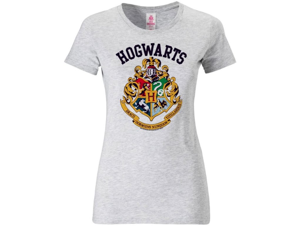 Šedé dámské tričko s grafikou a hlavním logem školy čar a kouzel v Bradavicích (Hogwarts logo).