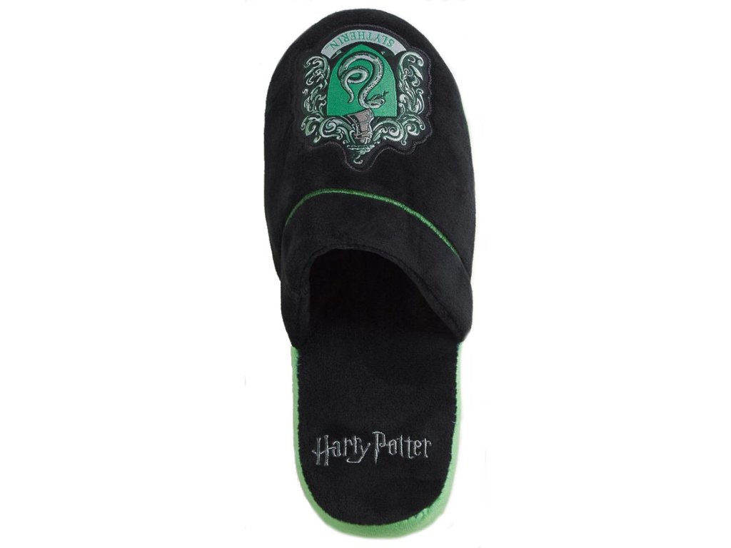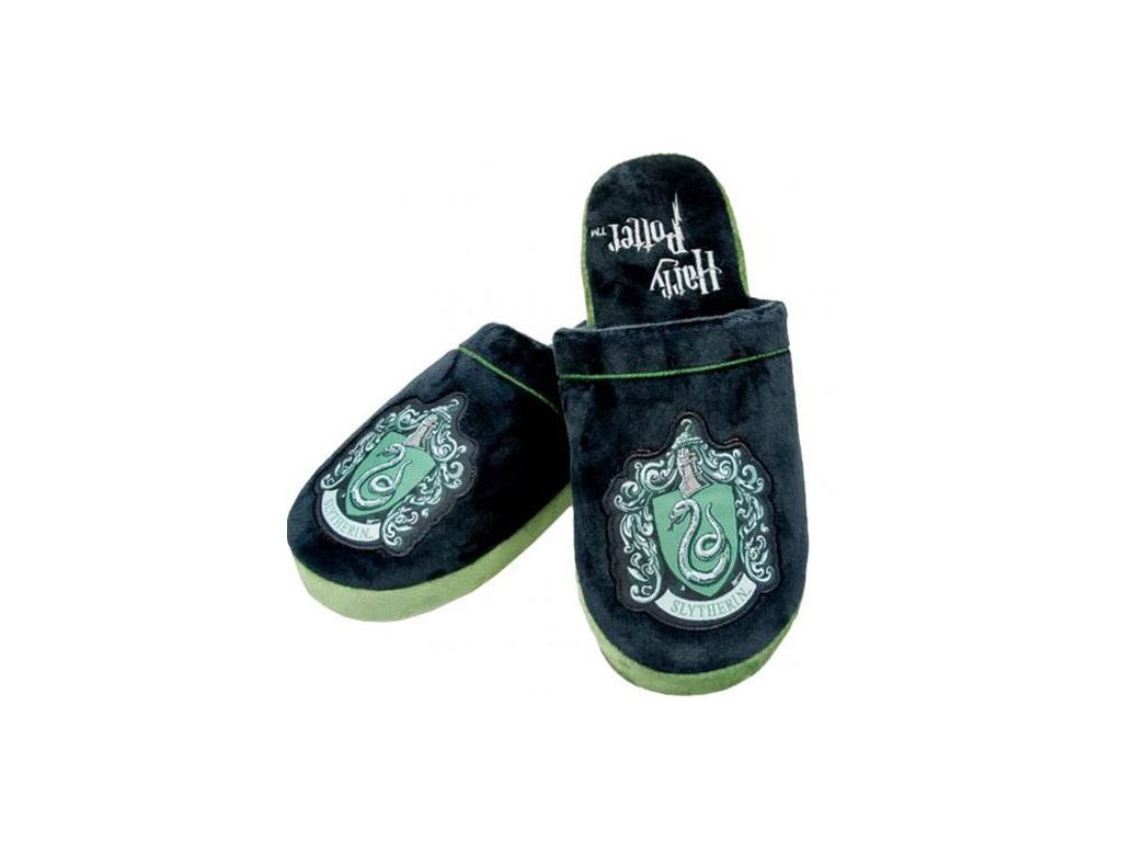 Nazouvací trepky s grafikou kolejí Zmijozelu.