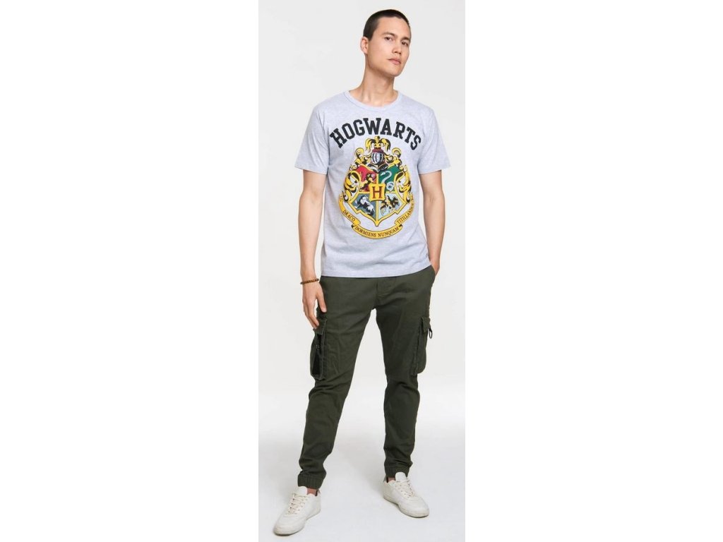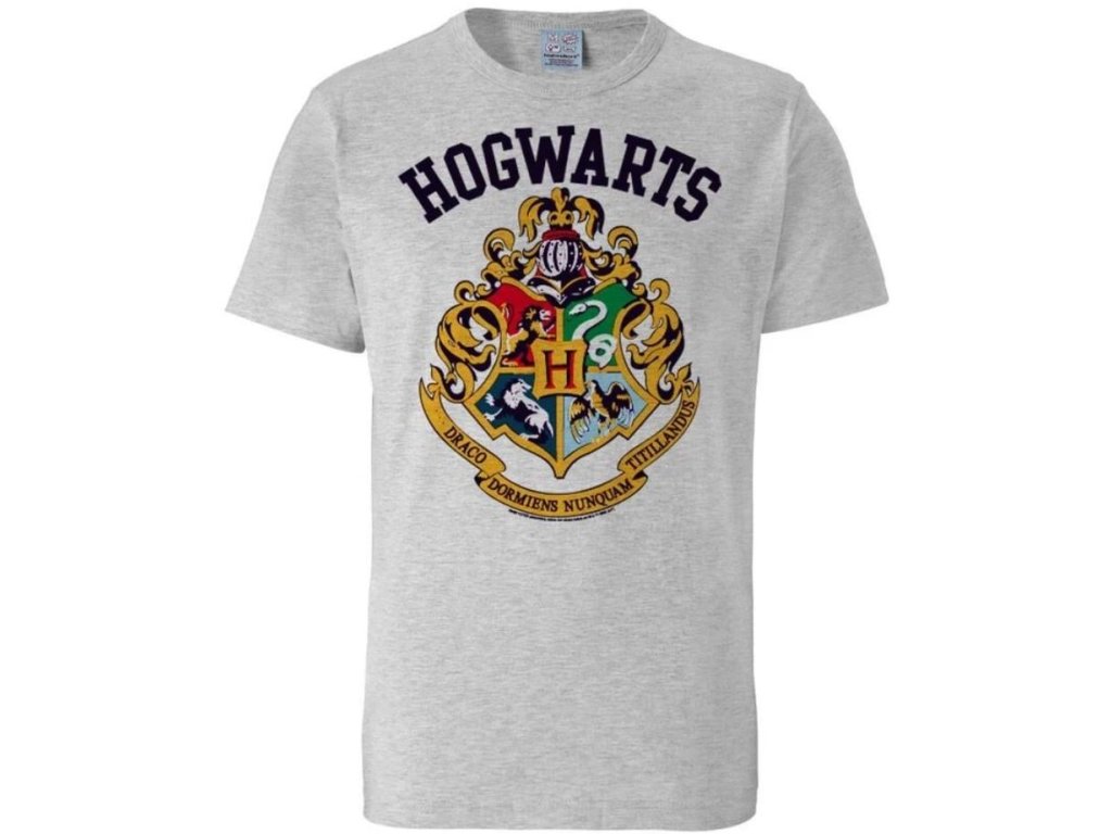 Šedé pánské tričko s hlavním erbem školy čar a kouzel v Bradavicích z populární kouzelnické sci-fi ságy Harryho Pottera.
