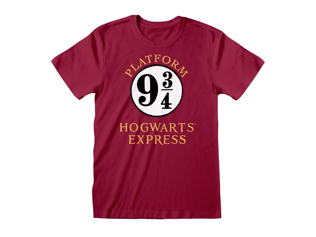 Červené atraktivní pánské tričko s krátkým rukávem a grafikou nástupiště 9 a 3/4, z filmu Harry Potter.