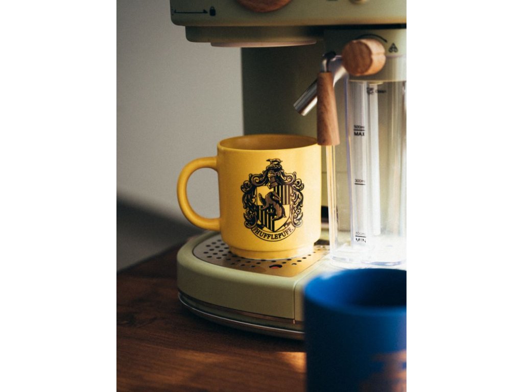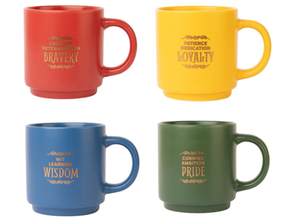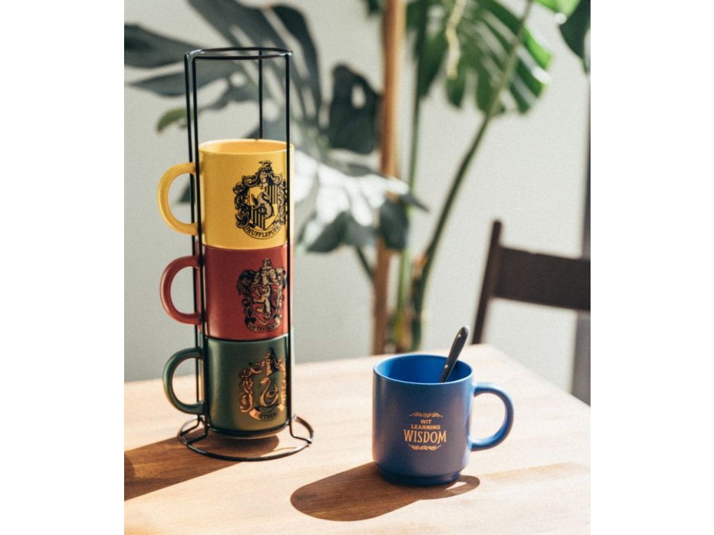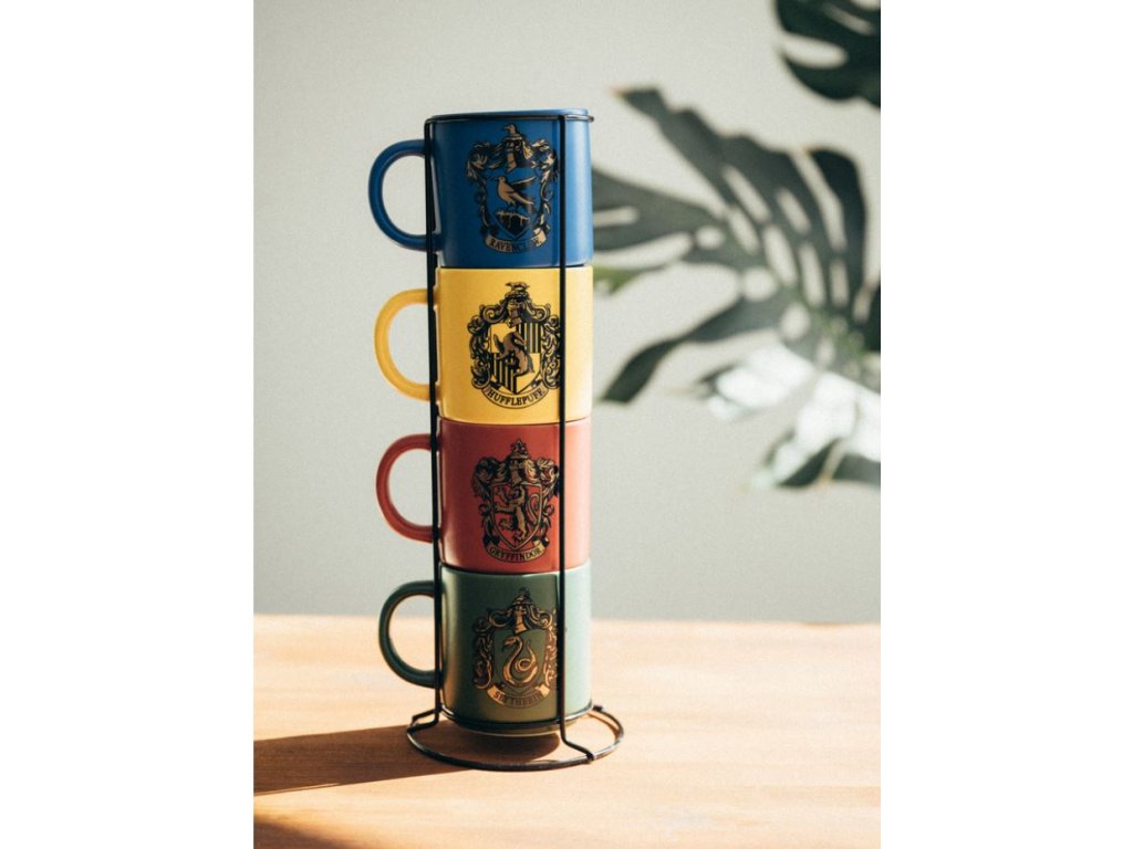 Set čtyř hrníčků vyvedené v grafice bradavických kolejí Nebelvír, Zmijozel, Havraspár a Mrzimor. Šálky jsou umístěné na kovové podložce. Jsou vhodné do myčky a mikrovlnné trouby.