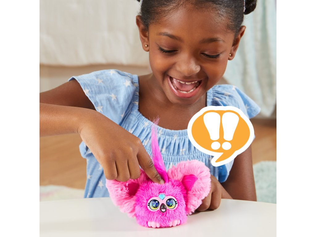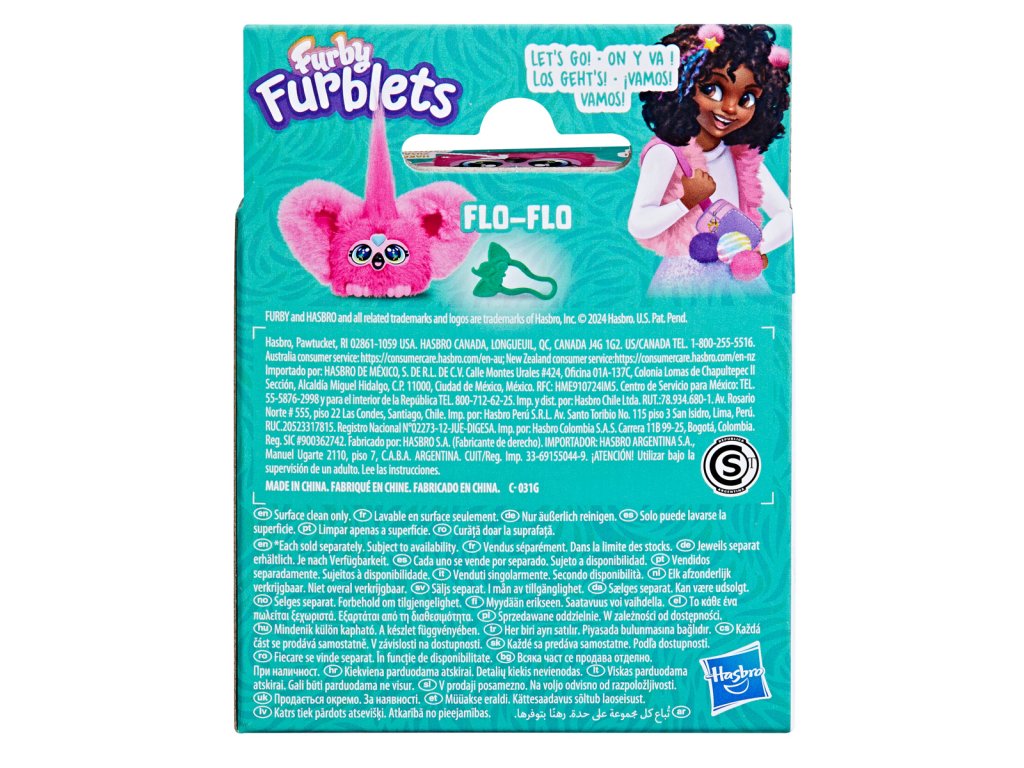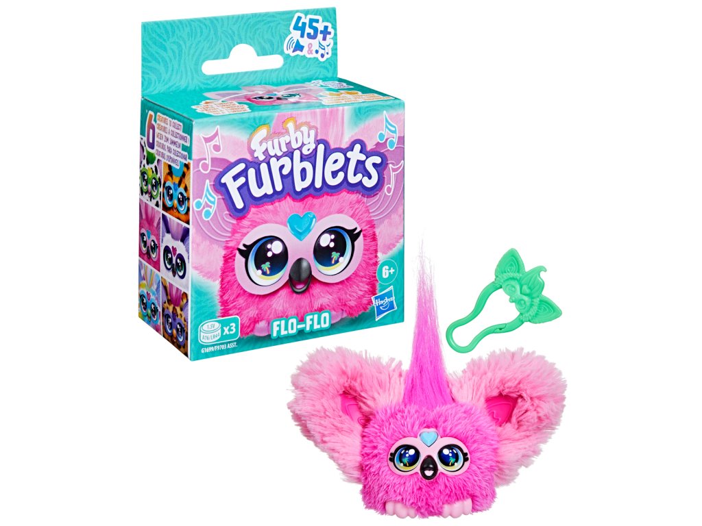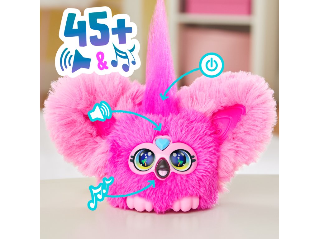Roztomilý Furby Furblet Flo-Flo vypadá jako malý plameňák s velkou osobností. S touto mini interaktivní hračkou můžete objevovat celou řadu zábavných zvukových a hudebních efektů. Furby Furblet Flo-Flo hraje veselou hudbu a říká různé fráze v jedinečném jazyce zvaným Furbish (Furblets neznají lidskou řeč). Stisknutím zobáku se ozvou zábavné zvuky krmení a klepnutím na srdíčkový drahokam se spustí hudba. Stisknutím horní části hlavy se aktivují zábavné fráze v jazyce Furbish a funkce on/off. Furblets jsou v různých barvách a s různými hudebními styly. Nasbírej jich více a nech je zpívat společně. Připněte si Flo-Flo k batohu nebo jiné cestovní tašce pomocí klipu na klíče a vezměte ho na party kamkoli s sebou. Klip je odnímatelný. Funguje na knoflíkové baterie 3 x LR44, které jsou součástí balení. Pokud máte větší interaktivní hračku Furbyho, aktivujte režim Furdar a podívejte se, co Furby říká o svých malých kamarádech Furblets. Elektronická plyšová hračka je vhodná pro dívky a chlapce od 6 let a je zábavným společníkem, kterého mohou mít děti vždy po svém boku. Baleno v krabičce. Rozměry balení: 12,7 x 9,5 x 5,4 cm. Věk: 6+