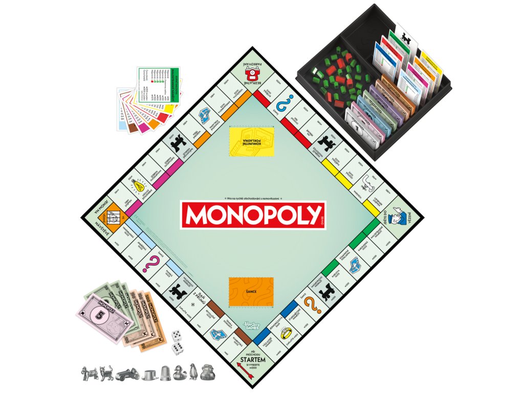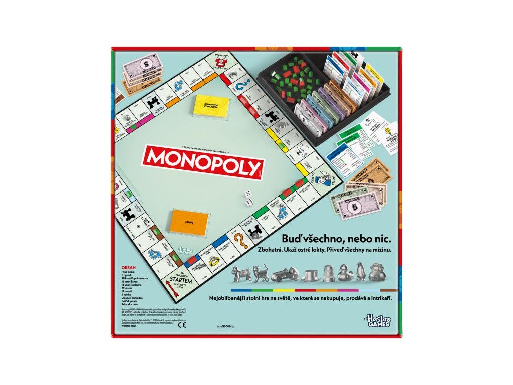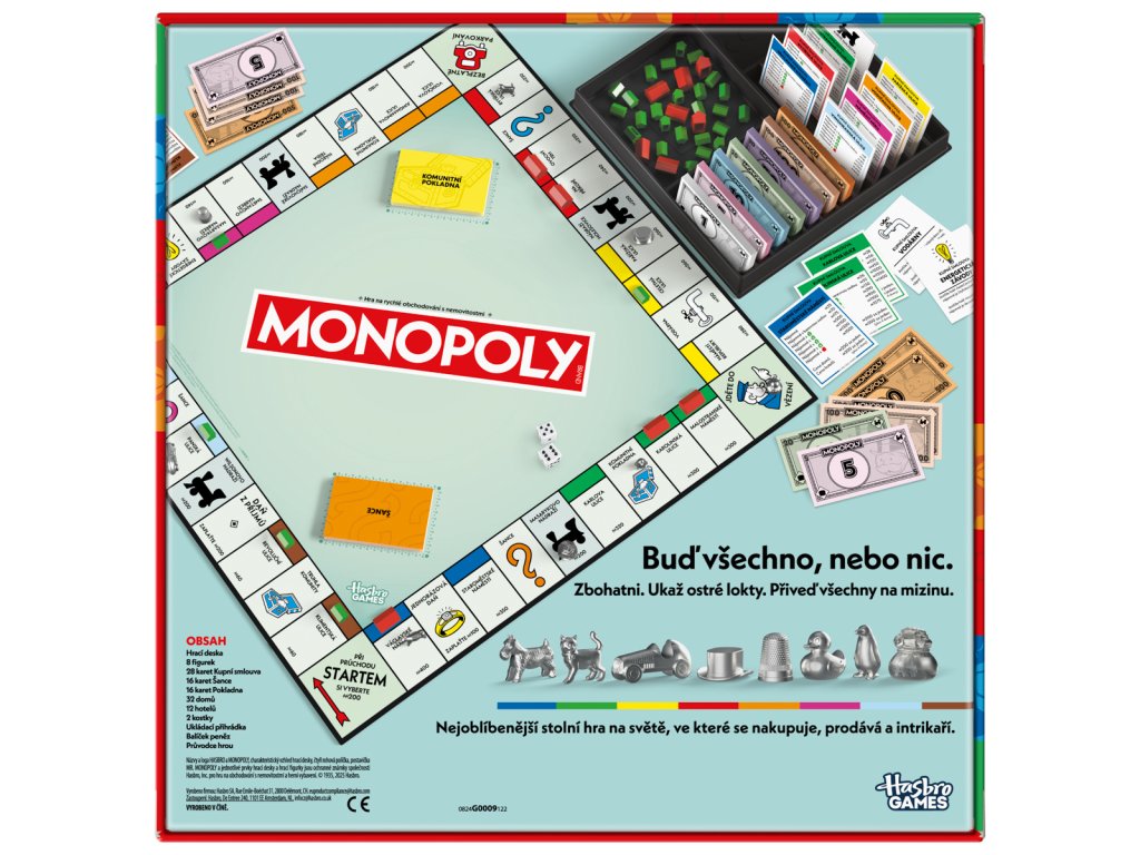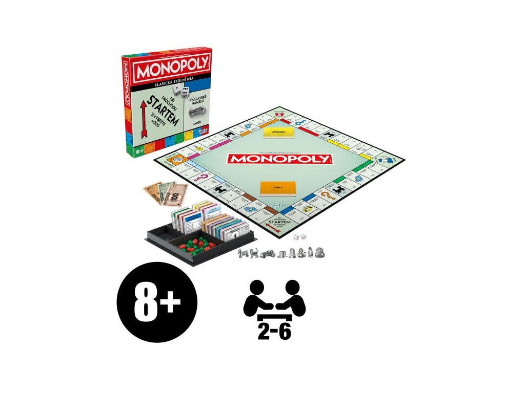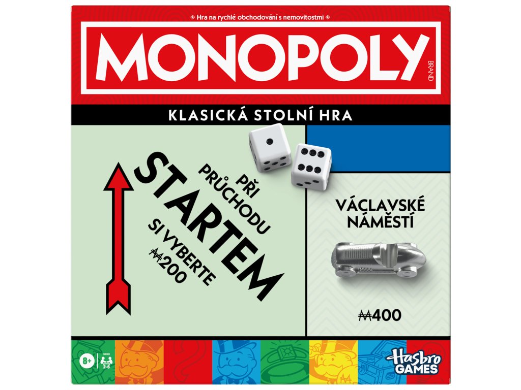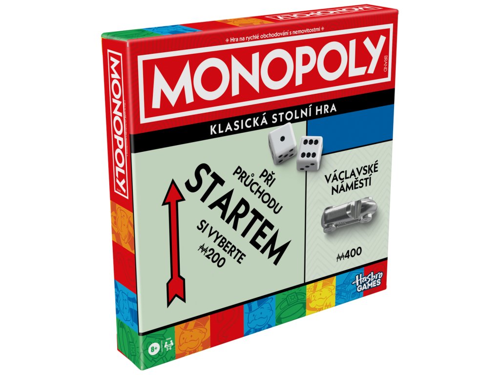 Klasická stolní hra od značka Hasbro Monopoly Classic na rychlé obchodování s nemovitostmi. Hráči nakupují, prodávají, sní a plánují si cestu za bohatstvím. Cesta k vítězství vede přes nakupování, prodej a obchodování. Nakupujte čtvrti, prodávejte nemovitosti, stavte domy a hotely, vybírejte nájemné a rozšiřujte své impérium. Osudem hráče mohou ve hře zamíchat karty šance a pokladna. Společenská hra Monopoly má jednoduchá a snadno pochopitelná pravidla. Hráči umístí své herní figurky na políčko START a budou během hraní obchodovat – s cílem rychle zbohatnout. Úspěch ve hře budou mít ti hráči, kteří prokážou své správné spekulace, rozumné investice i chytré obchody. Obsah balení: hrací deska, 8 figurek, 28 karet – kupní smlouva, 16 karet – šance, 16 karet – pokladna, 1 balíček peněz Monopoly, 32 domů, 12 hotelů, 2 kostky, ukládací přihrádka a návod. Hra Monopoly je určena pro 2–6 hráčů. Rozměr balení: 26,67 x 26,7 x 4,1 cm. Věk: 8+