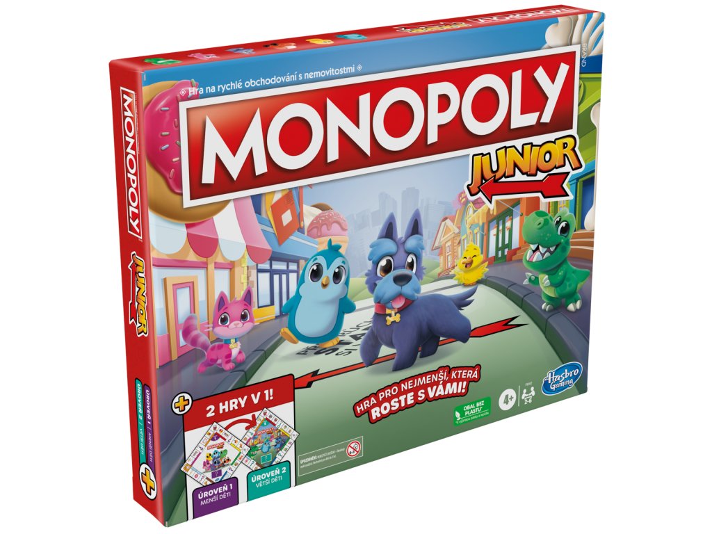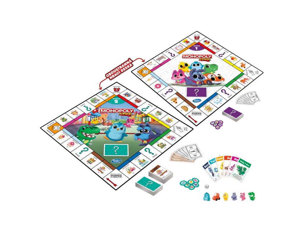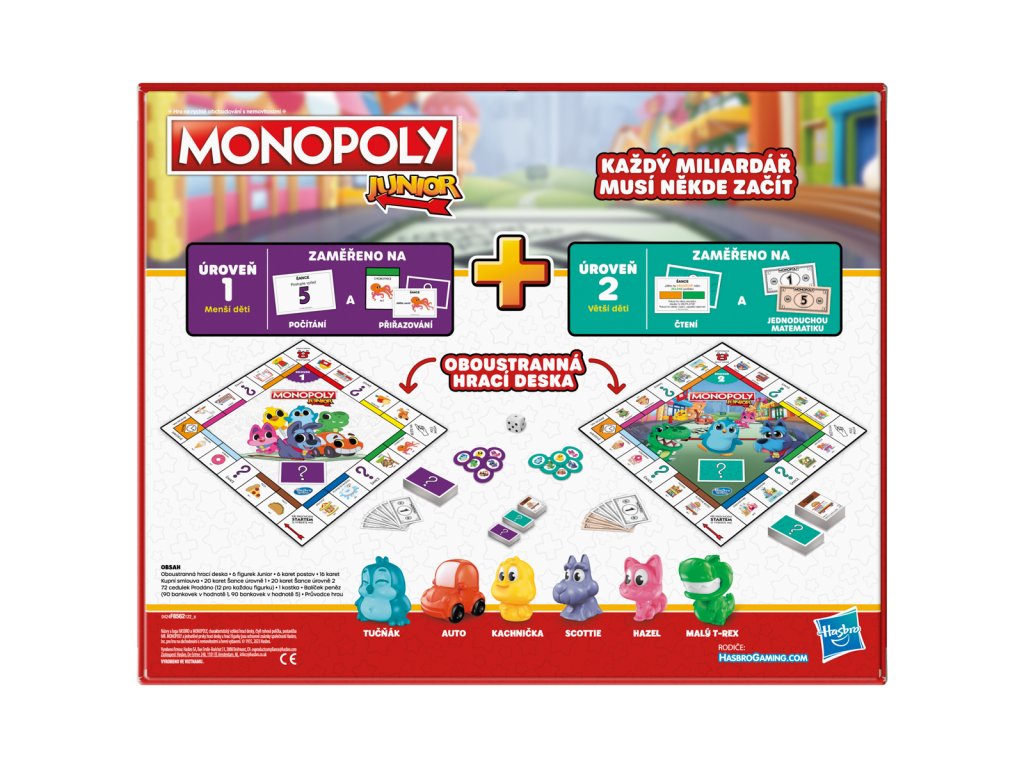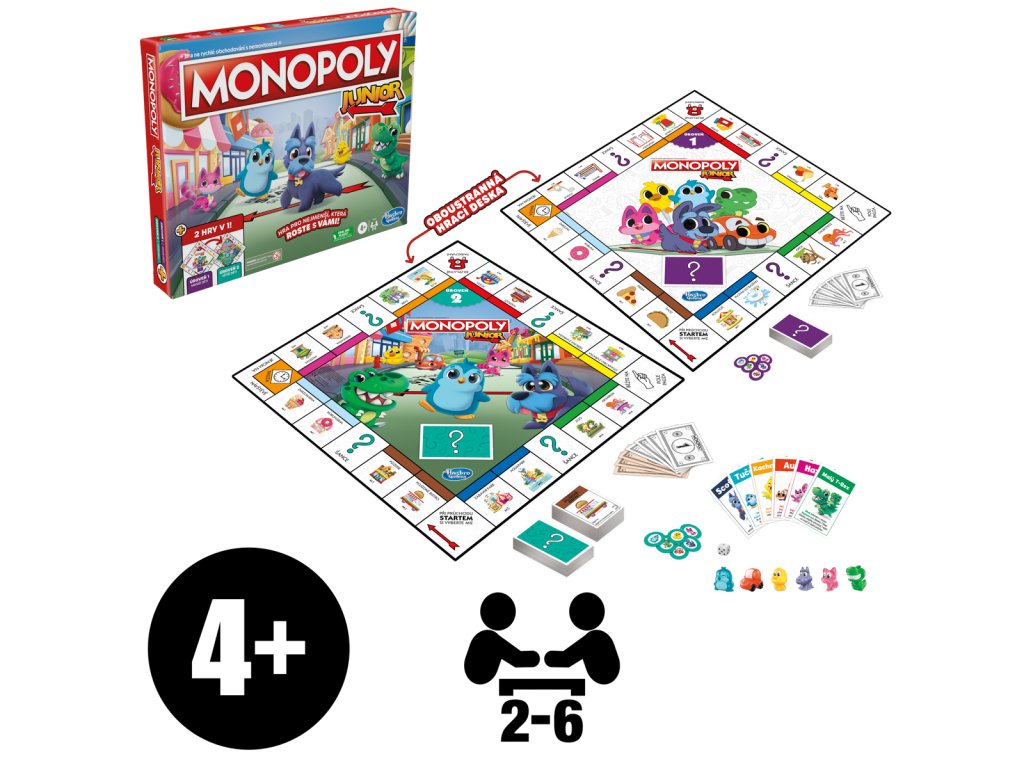 Junior verze hry Monopoly od značky Hasbro. Tato nová verze obsahuje oboustrannou hrací desku pro 2 způsoby hry. Díky jednoduché hratelnosti a lokalitám vhodným pro děti je tato hra skvělým vstupem do hry Monopoly. Je to hra, která roste s vašimi dětmi. Jedna strana je určena pro mladší děti (4+), a když ji otočíte, najdete pokročilejší hru pro starší předškoláky. Hra obsahuje sadu karet pro každou úroveň. Mladší děti mohou hrát s dolarovými bankovkami a starší děti mohou použít balíček pětidolarovek. Hra obsahuje žetony inspirované klasikou a představuje 2 nové žetony. Určeno pro 2-6 hráčů. Vhodné od 4 let. Rozměr balení: 33x27x4 cm.