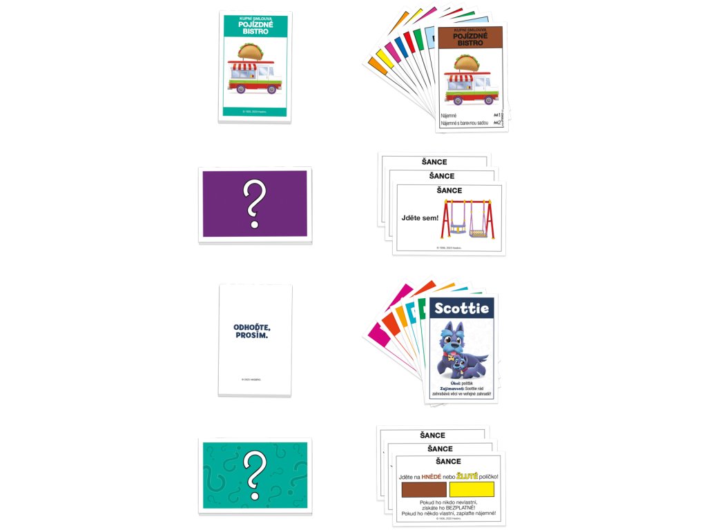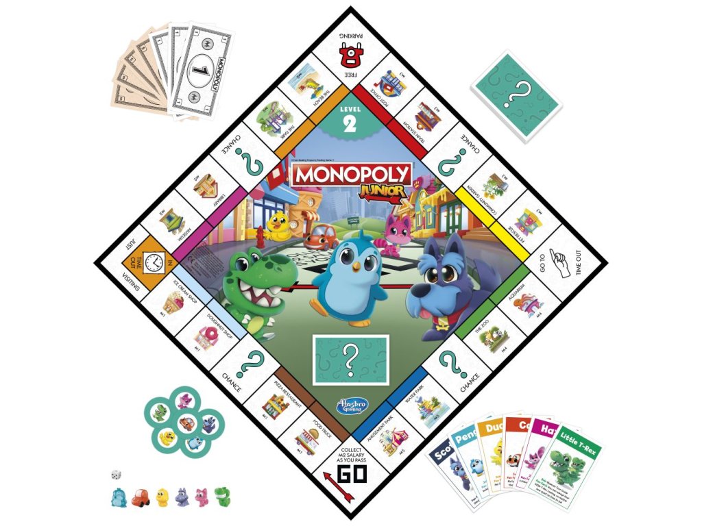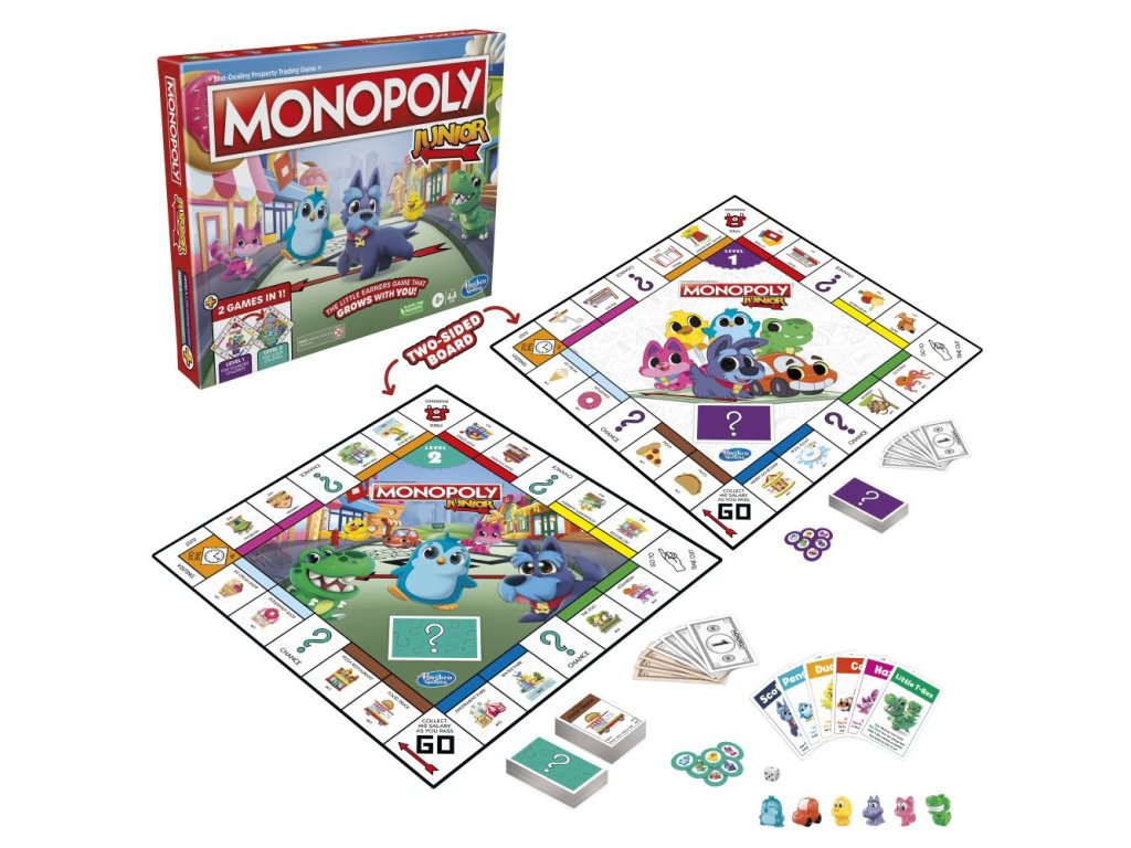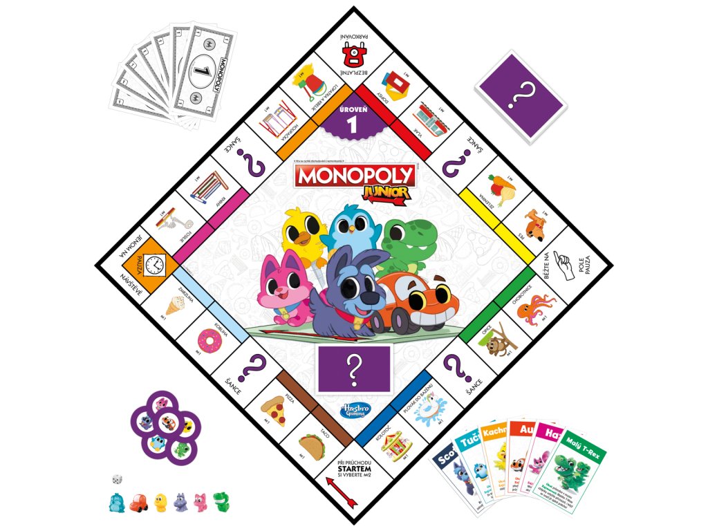 Junior verze hry Monopoly od značky Hasbro. Tato nová verze obsahuje oboustrannou hrací desku pro 2 způsoby hry. Díky jednoduché hratelnosti a lokalitám vhodným pro děti je tato hra skvělým vstupem do hry Monopoly. Je to hra, která roste s vašimi dětmi. Jedna strana je určena pro mladší děti (4+), a když ji otočíte, najdete pokročilejší hru pro starší předškoláky. Hra obsahuje sadu karet pro každou úroveň. Mladší děti mohou hrát s dolarovými bankovkami a starší děti mohou použít balíček pětidolarovek. Hra obsahuje žetony inspirované klasikou a představuje 2 nové žetony. Určeno pro 2-6 hráčů. Vhodné od 4 let. Rozměr balení: 33x27x4 cm.