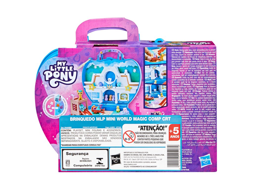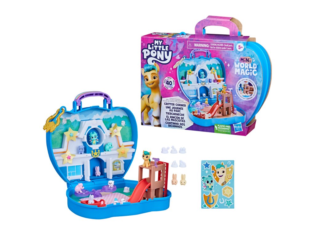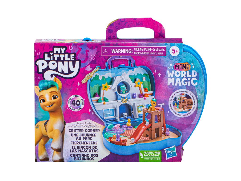 Vytvoř si svět kouzelných mini kamarádů z celé Equestrie s My Little Pony Mini World Magic! Sada se skládá z roztomilých postaviček inspirovaných seriálem My Little Pony. Děti mohou do hrací sady zapojit příslušenství a dílky na vytvoření nových scén. Vytvořte si svět sestavením plastových dílků hřiště a látkové piknikové deky pro zvířátka. Umístěte doplňky ve tvaru pamlsků do studené vody, abyste odhalili měnící se barvy. Po skončení hry rozeberte doplňky a uložte dílky do přenosného kufříku. Vezměte si ho s sebou na cesty a pak si postavte novou scénu! Sada obsahuje 2 rozkošné figurky: Hitch Trailblazer a Sparky Sparkeroni! Rozměry balení: 16,5 x 19,5 x 4,5 cm. Věk: 5+
