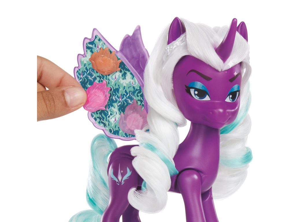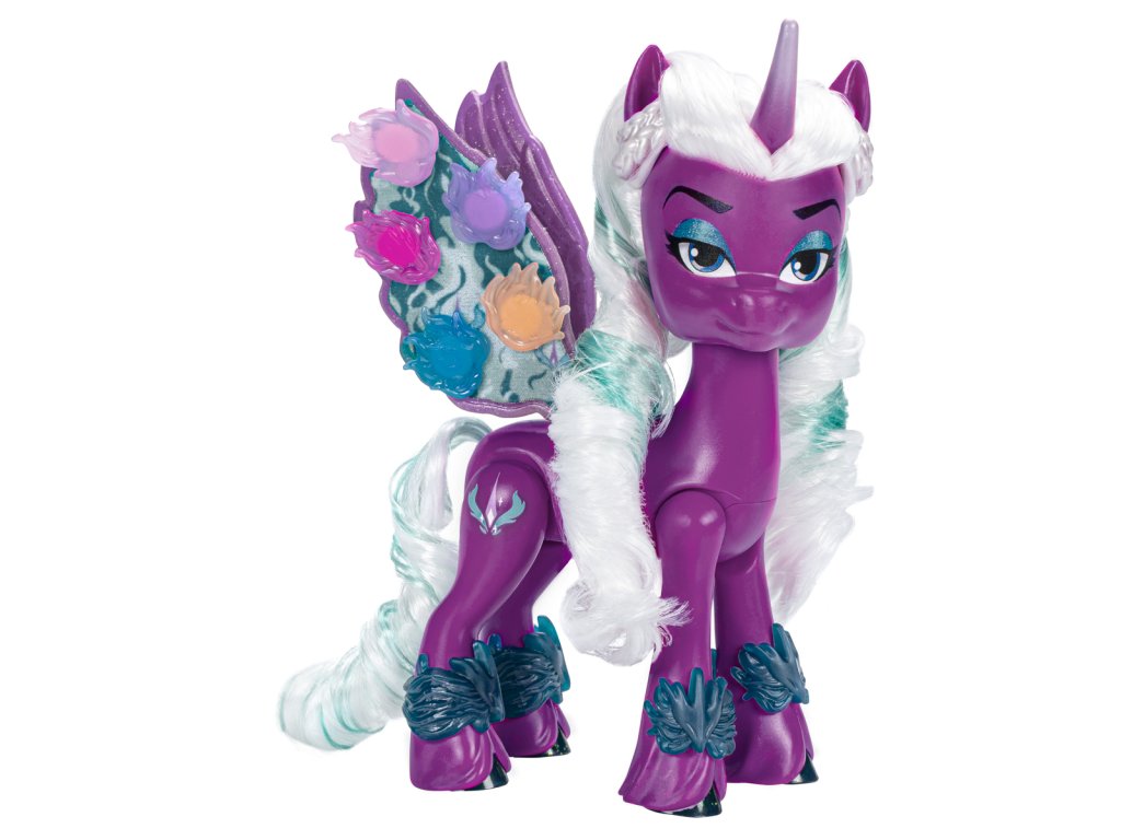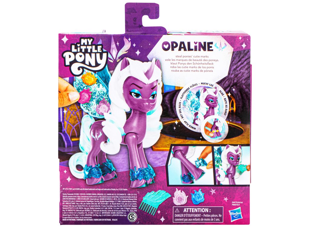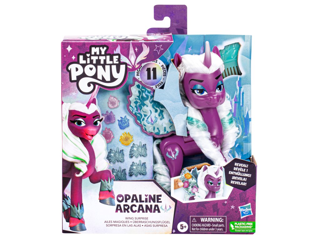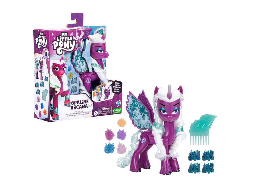 Objevte kouzelná tajemství s hračkou My Little Pony Wing Surprise Opaline Arcana! Opaline je zloduch z rodu Ohnivých alicornů, který se snaží ukrást poníkům Cutie Marks v seriálu My Little Pony. Připoj barevné přívěsky k Opalininým krásným křídlům! Pak zmáčkni zadní nohy figurky, aby se její křídla třepotala nahoru a dolů. Součástí balení je 10 doplňků pro stylizaci. Přizpůsob si její vzhled pomocí 4 náramků inspirovanými seriálem, které se připojují k jejím nohám. Tato panenka My Little Pony je fialová figurka Alicorna s Alicorn Cutie Mark na jedné straně. Figurka má měkké, dlouhé bílé vlasy a hřeben pro zábavný styling! Rozměry balení: 20 x 20,5 x 6,5 cm. Věk: 5+