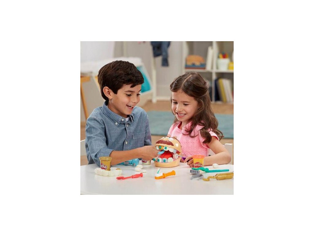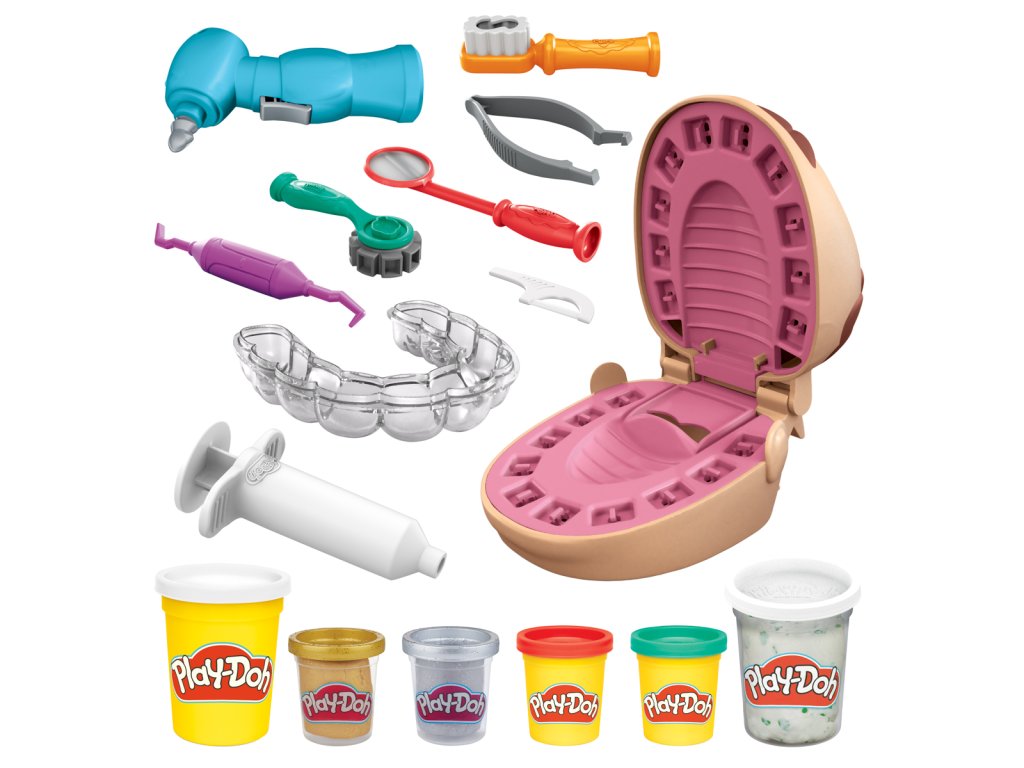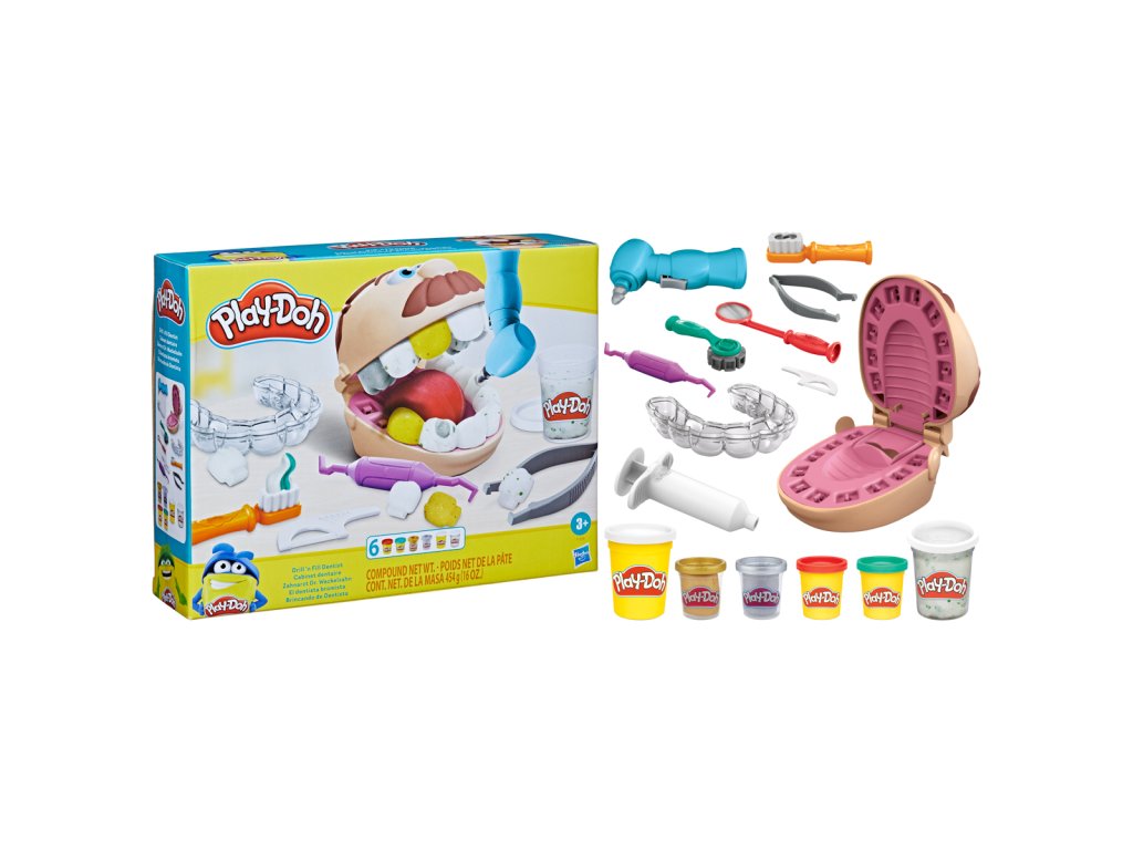 Doktor Drill 'n Fill je zpět a spolu s ním víc kazů než kdy předtím! Obsahuje zubní kazy v podobě konfet, zlatou a stříbrnou hmotu pro rovnátka a výplně a novou rotační vrtačku bez baterie. Zahrajte si na zubaře. Vytvořili jsme zcela novou formu na zuby a sada obsahuje všechny známé zubařské nástroje. Vyplázněte jazyk, vyačte zubní pastu a nezapomeňte na čištění mezizubních prostor!