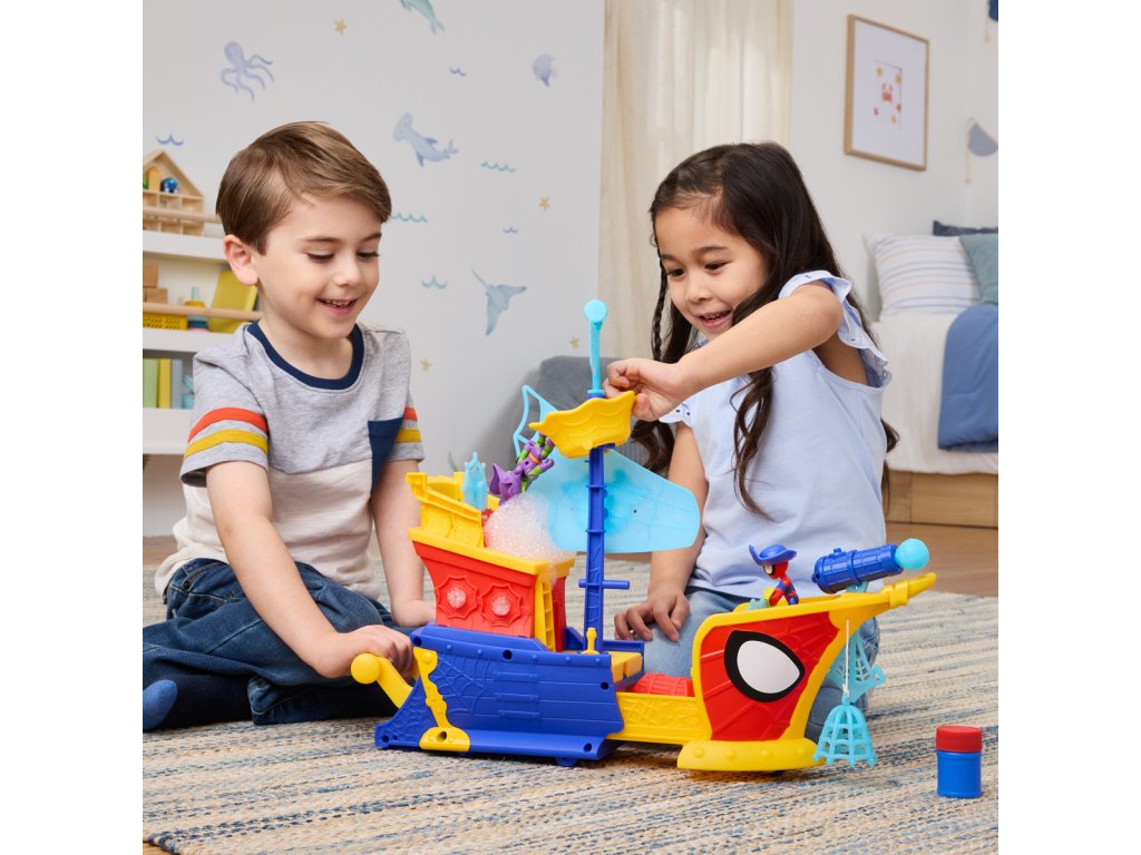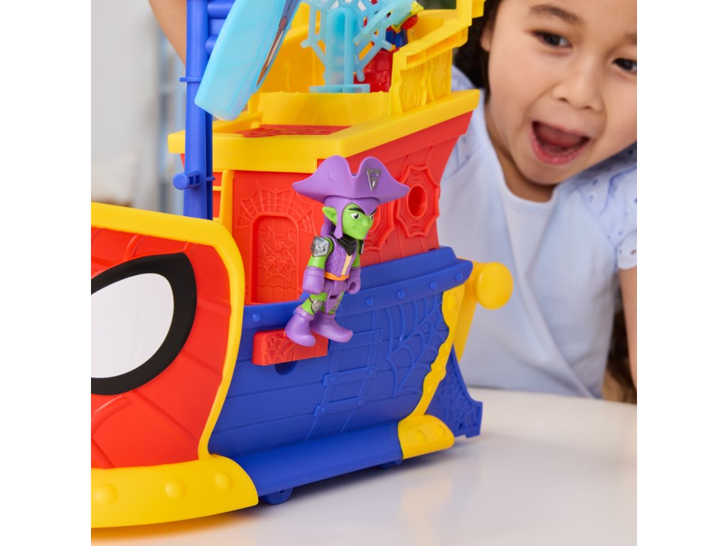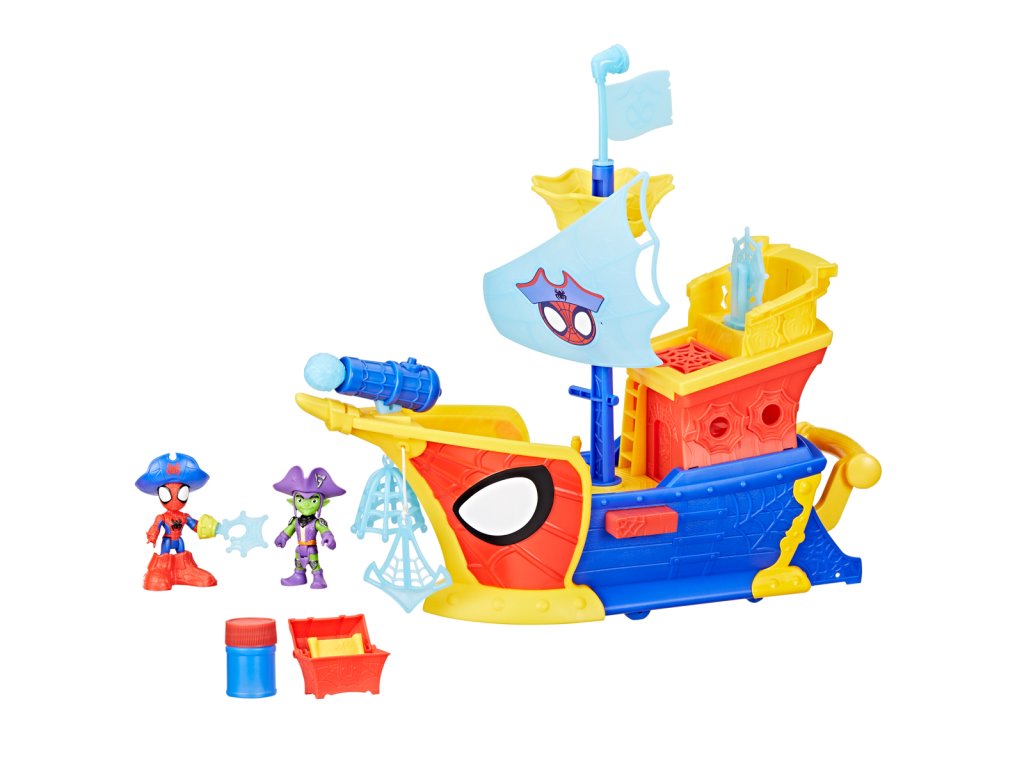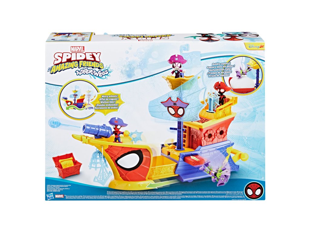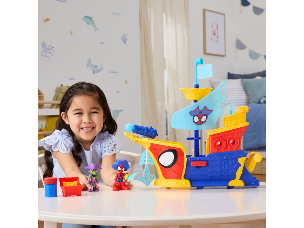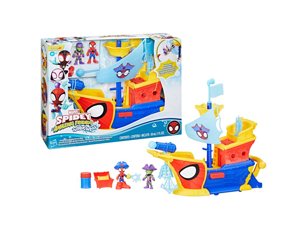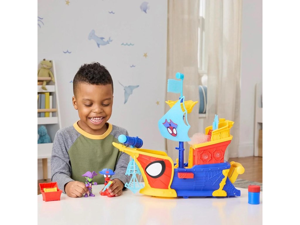 Děti si mohou představovat dobrodružství na moři s herní sadou Spidey and his Amazing Friends – Pirátská loď Webs Ahoy s bublinkami. Herní set obsahuje past na bubliny, otáčivý stožár a pozorovatelnu, výsuvné prkno a další prvky. Součástí sady jsou pohyblivé figurky superhrdinů Spideyho a Green Goblina o velikosti 7,6 cm s odnímatelnými doplňky – včetně: 2 pirátských klobouků, 1 páru pirátských bot, truhly s pokladem, mapy, lahvičky s bublinkovou tekutinou a dalších doplňků. Po použití stačí pirátskou loď s bublinkami jednoduše opláchnout a důkladně vysušit (podrobnosti viz návod). Obsahuje: 2 figurky, loď, 9 doplňků a bublinový roztok 30 ml. Vyrobeno z kvalitního plastu. Baleno v krabičce. Rozměry balení: 34,3 x 45,7 x 13,5 cm. Věk: 3+