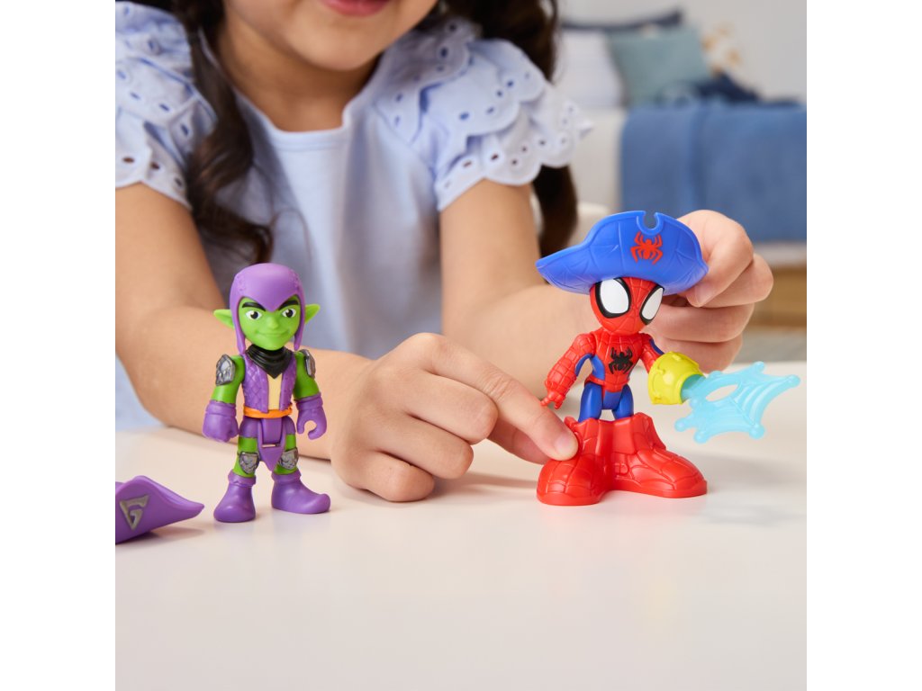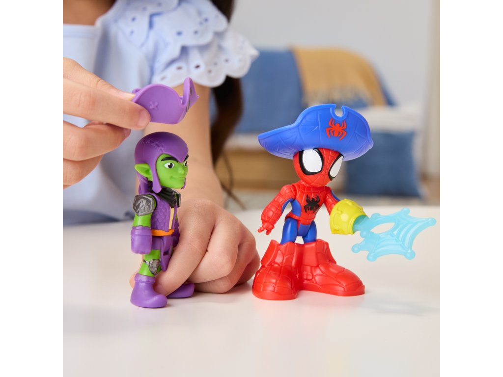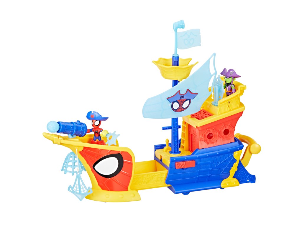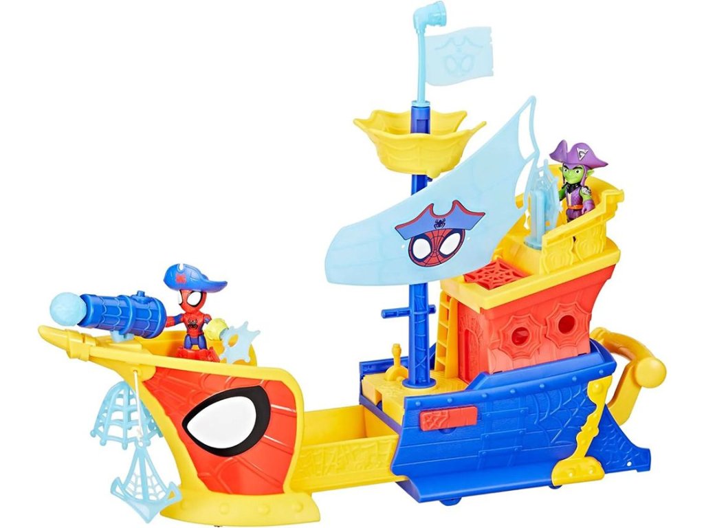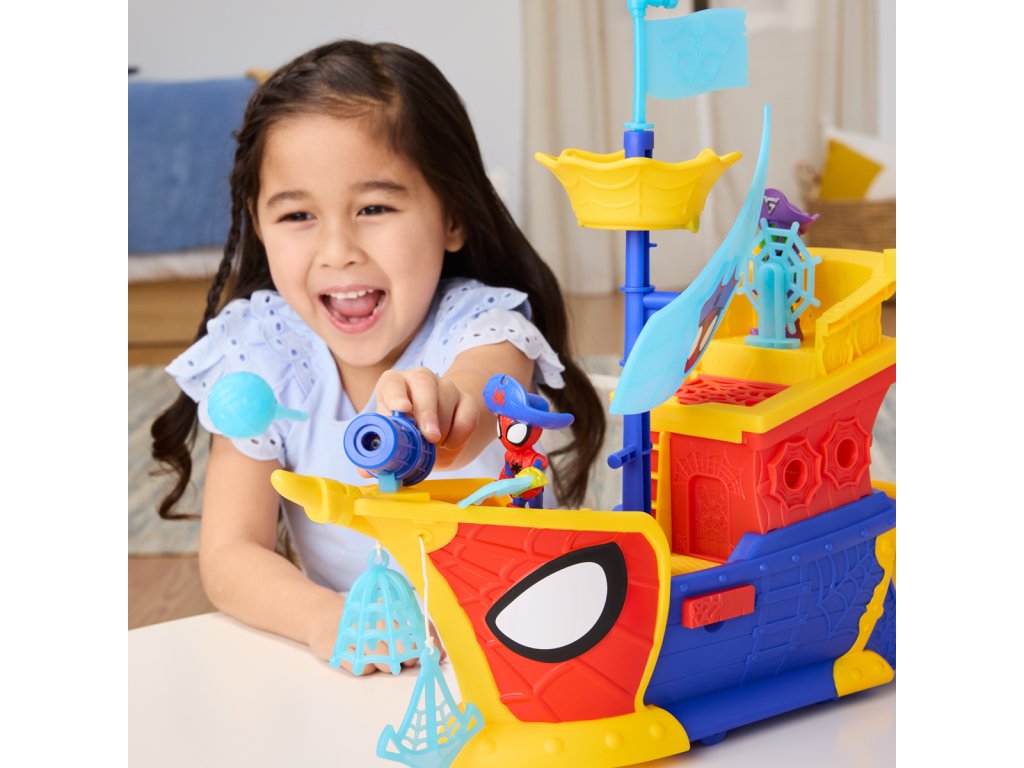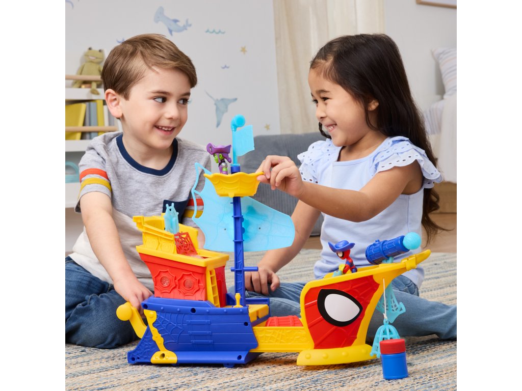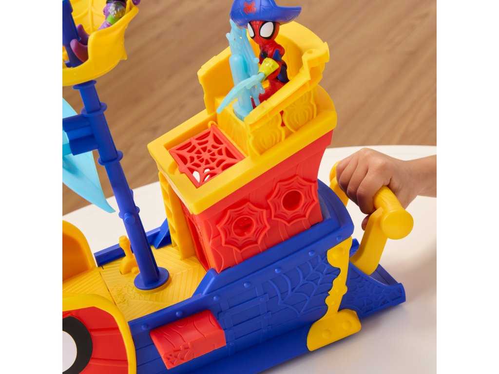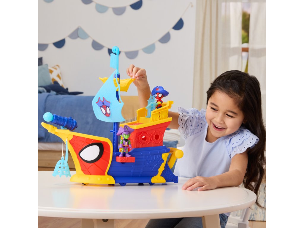 Děti si mohou představovat dobrodružství na moři s herní sadou Spidey and his Amazing Friends – Pirátská loď Webs Ahoy s bublinkami. Herní set obsahuje past na bubliny, otáčivý stožár a pozorovatelnu, výsuvné prkno a další prvky. Součástí sady jsou pohyblivé figurky superhrdinů Spideyho a Green Goblina o velikosti 7,6 cm s odnímatelnými doplňky – včetně: 2 pirátských klobouků, 1 páru pirátských bot, truhly s pokladem, mapy, lahvičky s bublinkovou tekutinou a dalších doplňků. Po použití stačí pirátskou loď s bublinkami jednoduše opláchnout a důkladně vysušit (podrobnosti viz návod). Obsahuje: 2 figurky, loď, 9 doplňků a bublinový roztok 30 ml. Vyrobeno z kvalitního plastu. Baleno v krabičce. Rozměry balení: 34,3 x 45,7 x 13,5 cm. Věk: 3+