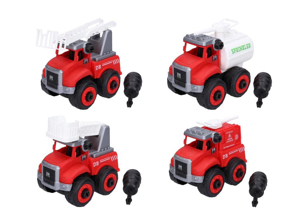 Auto hasičské šroubovací. Rozměry 14,5x11x15 cm. 4 varianty. Volná kola. Obsah balení - auto a šroubovák.
