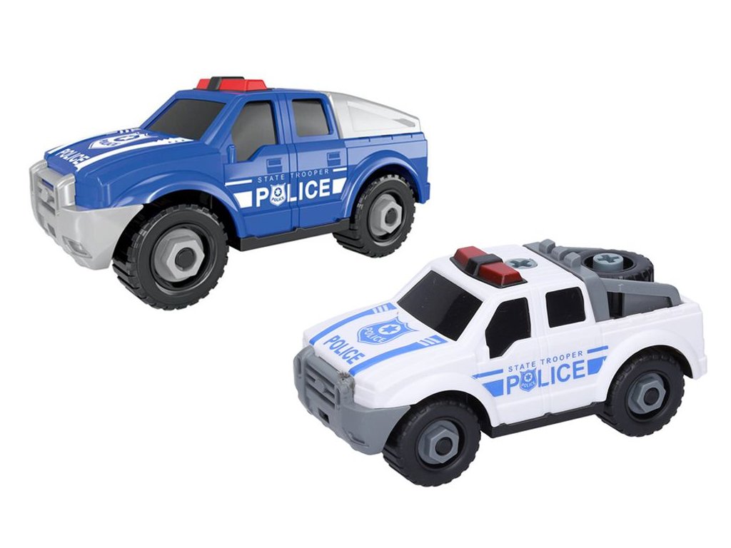 Auto pick-up policie šroubovací. Rozměry 17x8x7,5 cm. Volná kola. Balení obsahuje auto a křížový šroubovák. V rukojeti šroubováku je klíč na matice. 2 varianty - bílá, modrá.