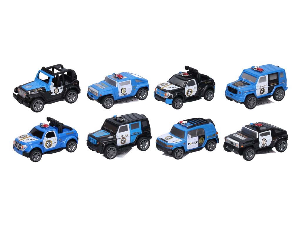 Auto policejní. Velikost 10 cm. Na zpětné natažení. 12 ks display box. 12 variant.