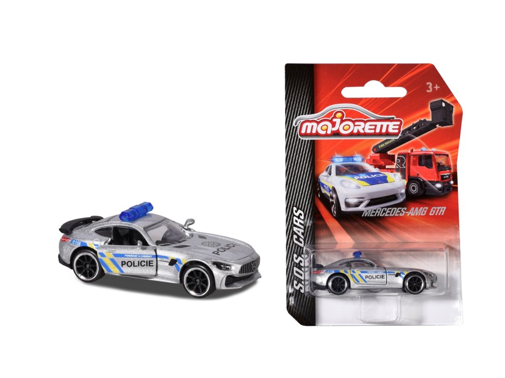 Kovové policejní auto na volnoběh. Pohyblivé a/nebo otevírací část. Délka 7,5 cm.