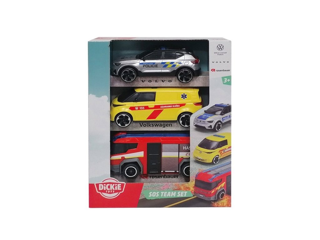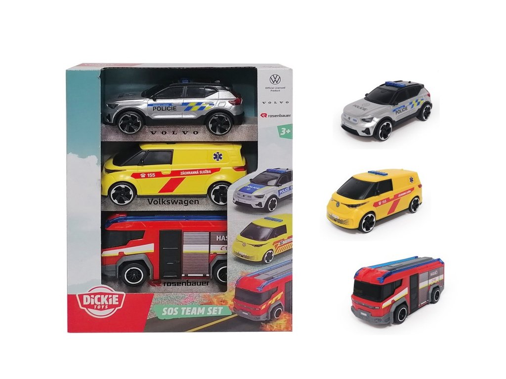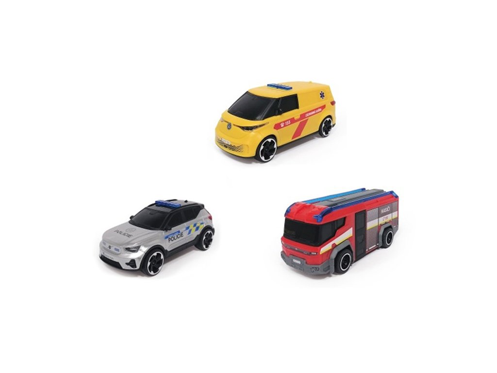 Set 3 ks dopravních záchranářských prostředků na volnoběh - hasičské auto Rosenbauer Penta, policie Volvo EX40, ambulance Volkswagen . V měřítku 1:36. Délka 15,5 cm.