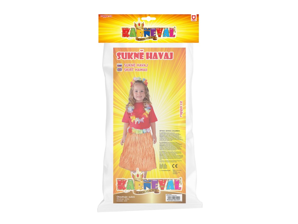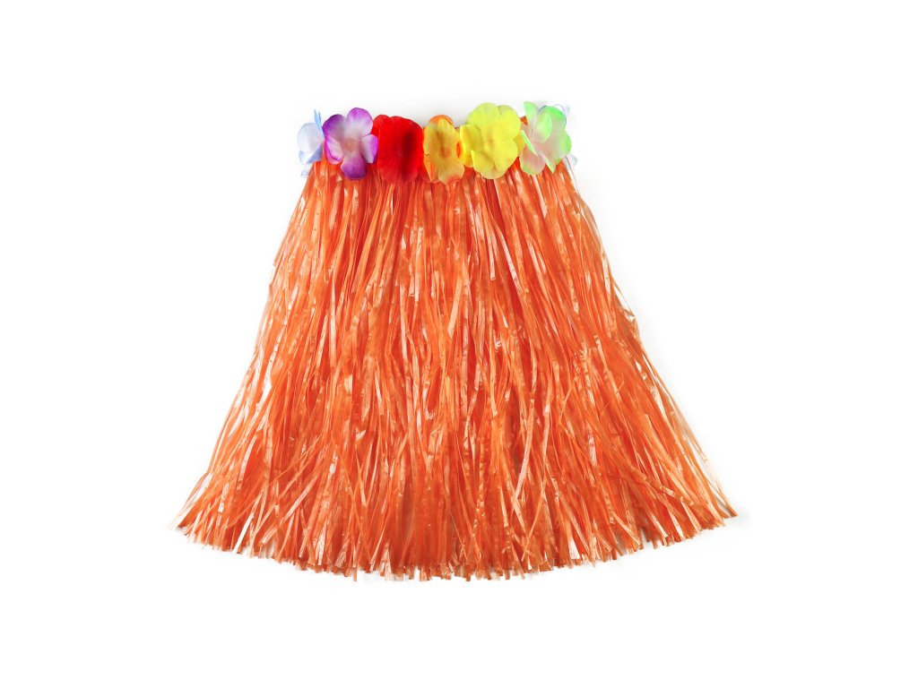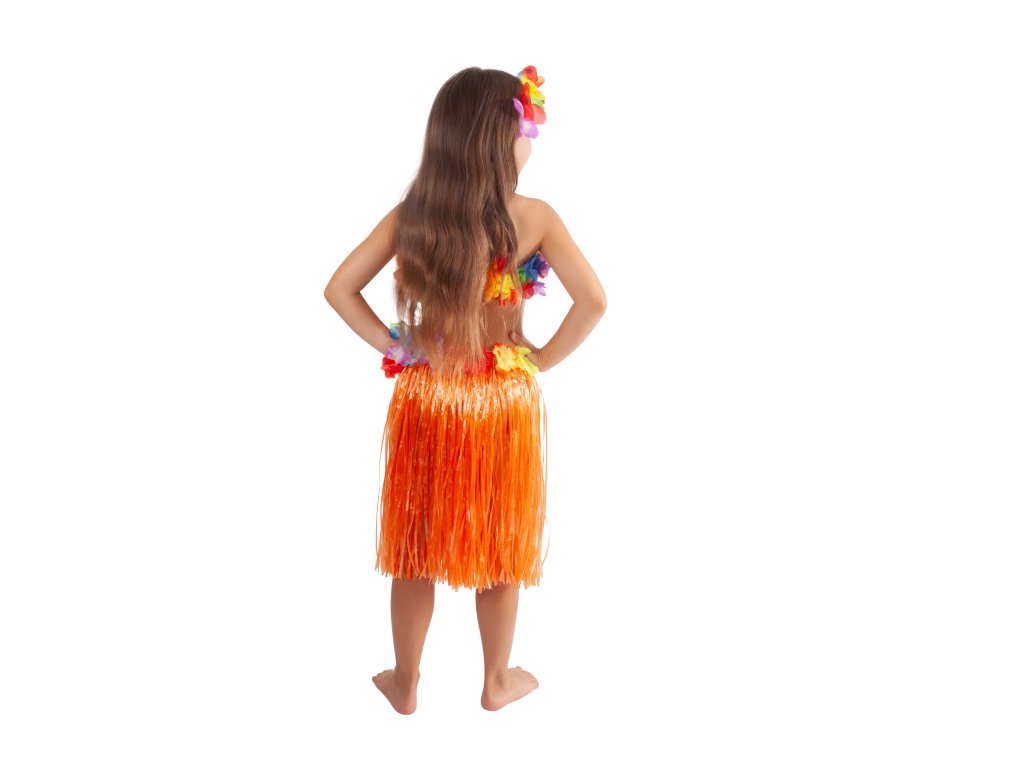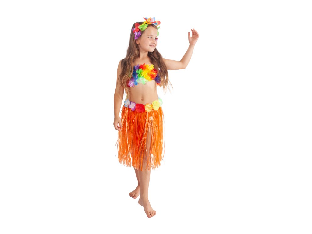 Parádní sukně ve stylu "Hawaii" nesmí žádné slečně v šatníku chybět! Sukénka je určena pro holčičky ve věkovém rozmezí 3-10 let (104-150 cm). Tento senzační kousek je ideálním doplňkem na karneval nebo k typickému havajskému tanci "HULA". Sukně, dlouhá 45 cm, je vyrobena z tenkých igelitových pásků v oranžové barvě a zdobena barevnými okvětními lístky. Paráda! Staň se hvězdou karnevalového večírku díky této havajské sukni nebo si vytvoř celý havajský kostým! Balení obsahuje pouze sukni.