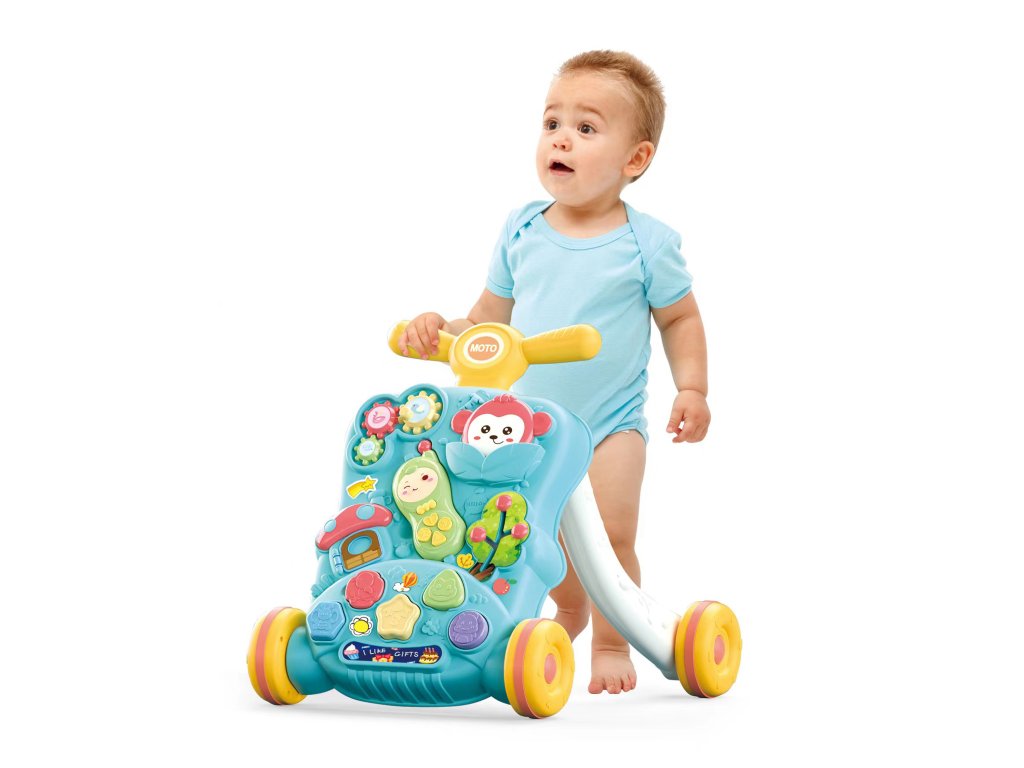 Chodítko interaktivní. Návod na složení na obale. Baterie 2x AAA nejsou součástí. Nastavitelná výška madla, nastavení odporu koleček pro regulaci rychlosti chůze. Zvukové efekty. 2 varianty - modrá, růžová.