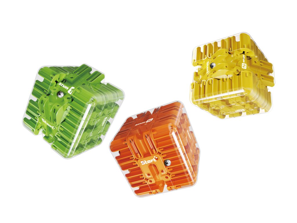 Bludiště kostka. Velikost 8 cm. Cílem hry je dostat kuličku do cíle pomocí otáčení vrstev kostky. Návod součástí balení. 3 varianty - žlutá, oranžová, zelená.