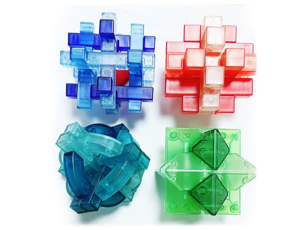 Hlavolam. Velikost 7 cm. Obsahuje obrázkový návod na složení. 4 varianty.