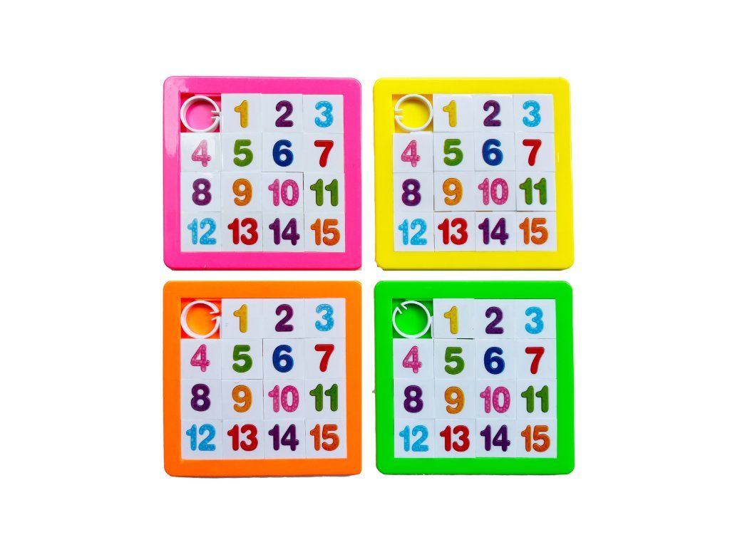 Hra 15, hlavolam, logická. Rozměry 12,8x0,6x12,8 cm. 4 barevné varianty - zelená, růžová, oranžová, žlutá.